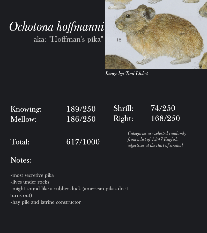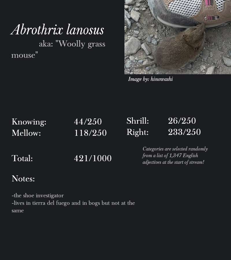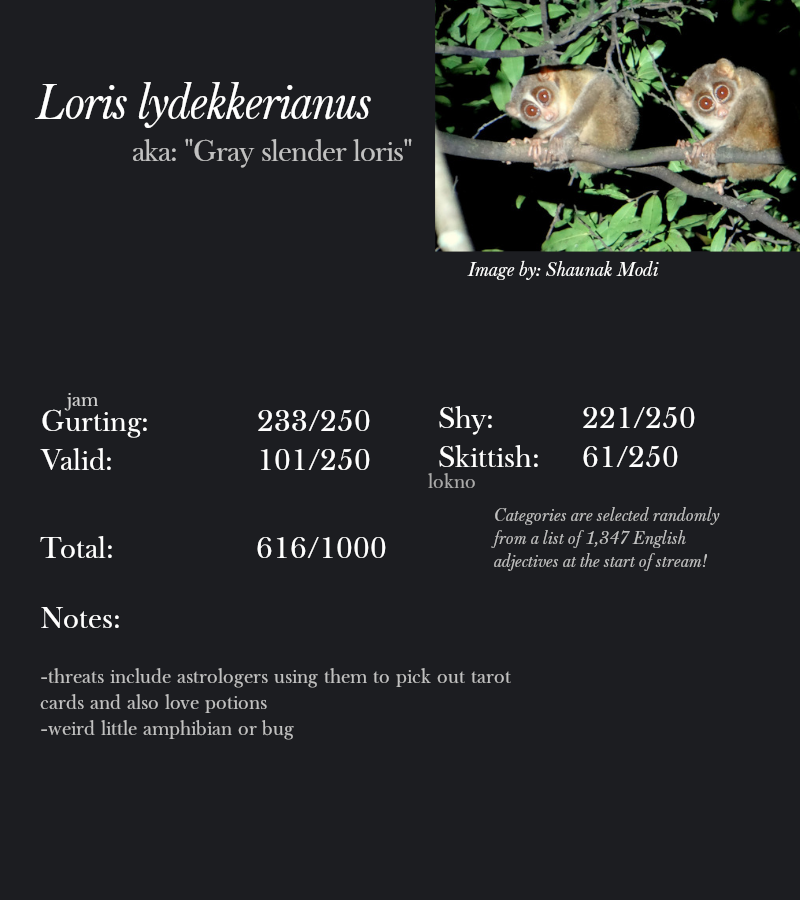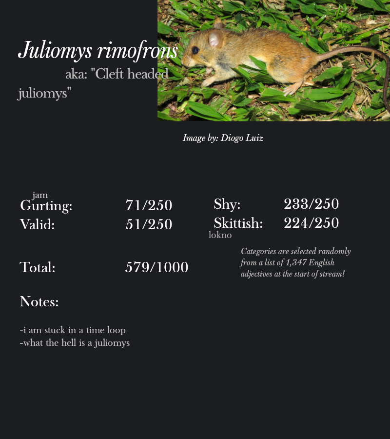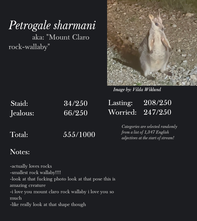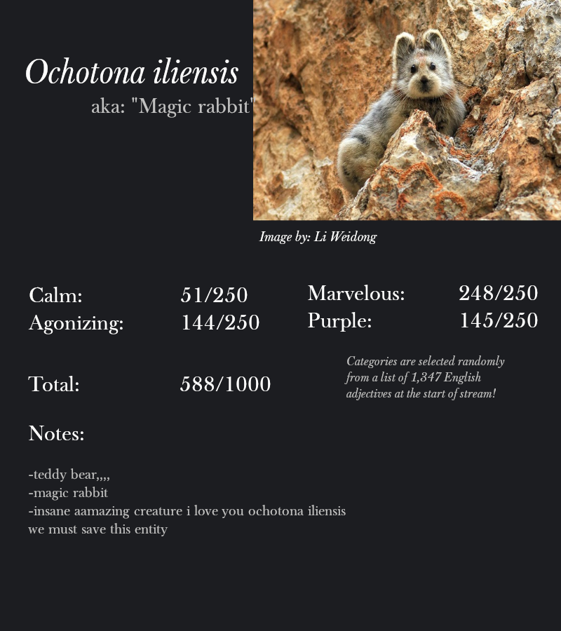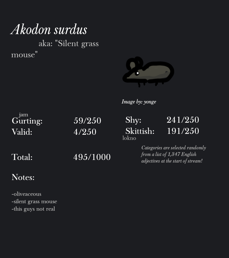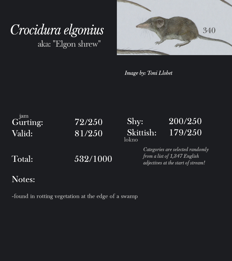Categories are selected randomly from a list of 1,347 English adjectives at the start of stream! lokno Shy: 237/250 Skittish: 221/250 Image by: yonge Notes: