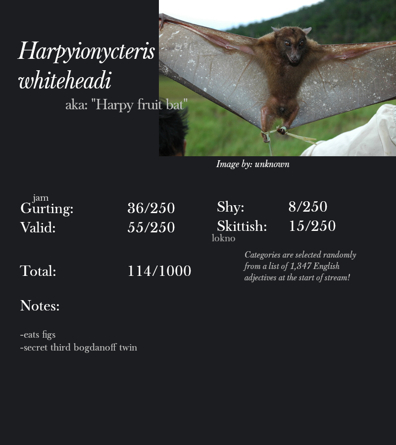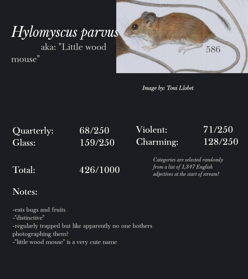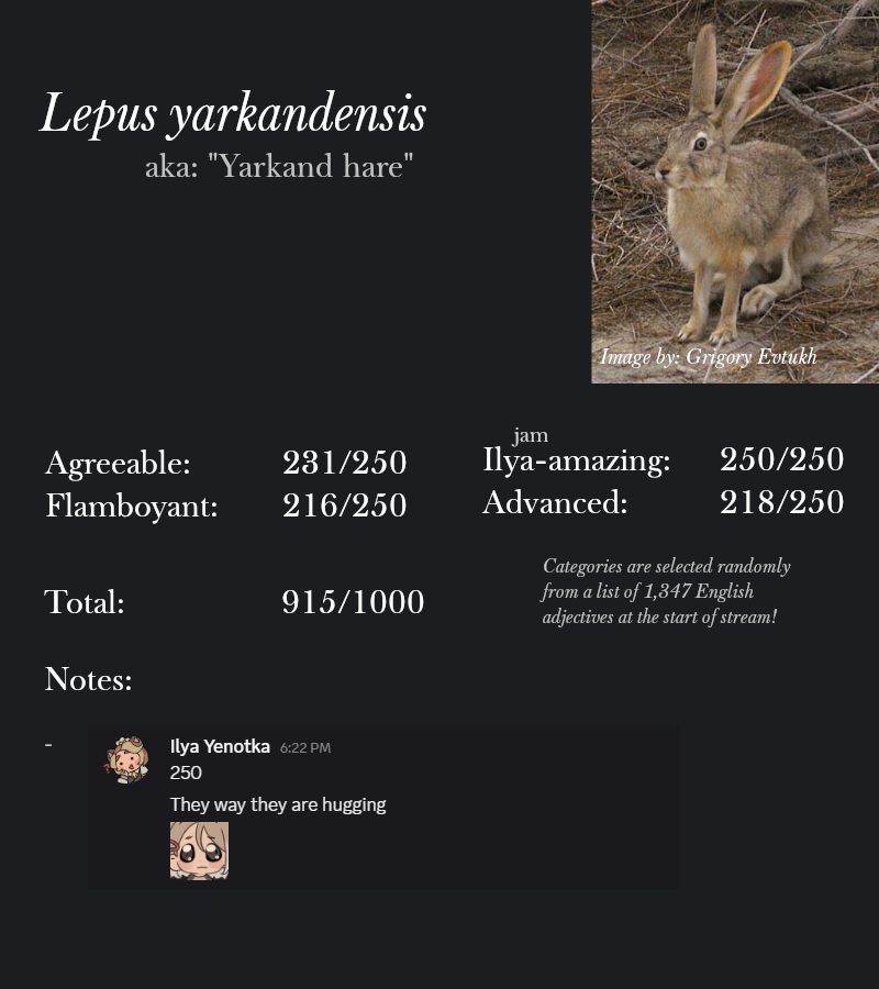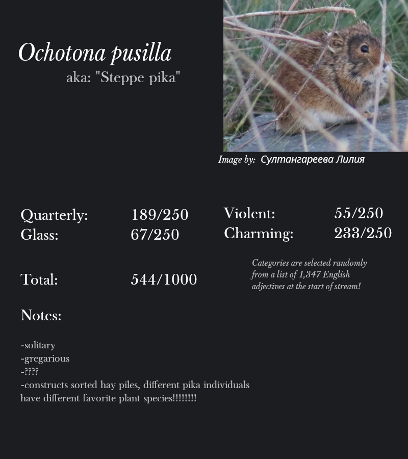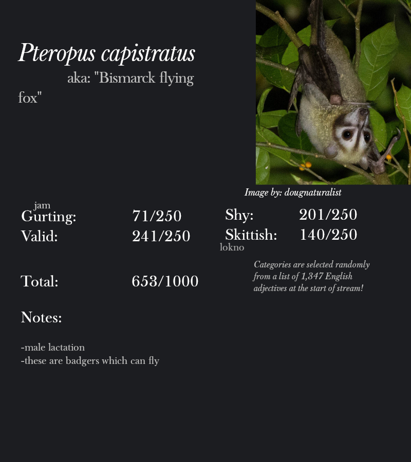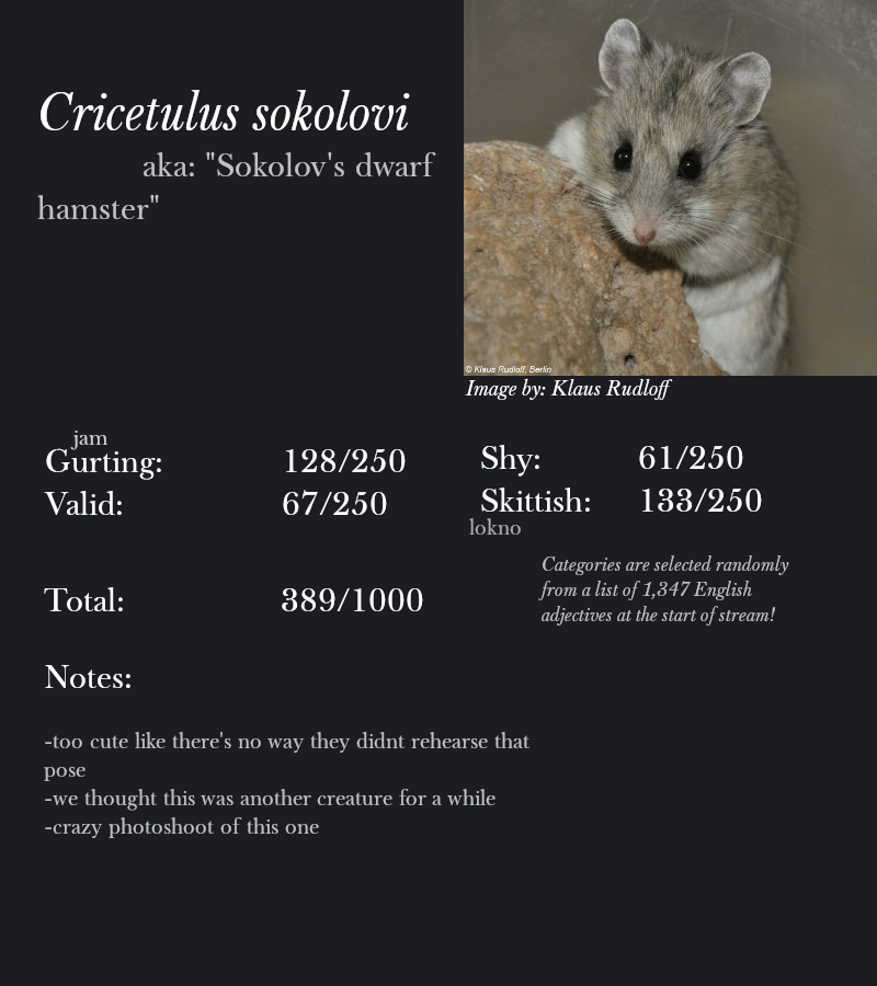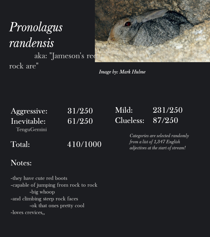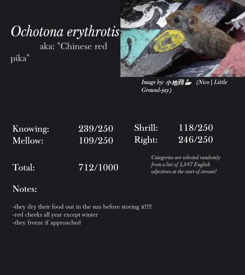 Categories are selected randomly from a list of 1,347 English adjectives at the start of stream! lokno Shy: 237/250 Skittish: 221/250 Image by: yonge Notes:
