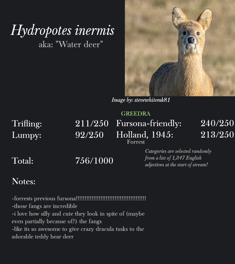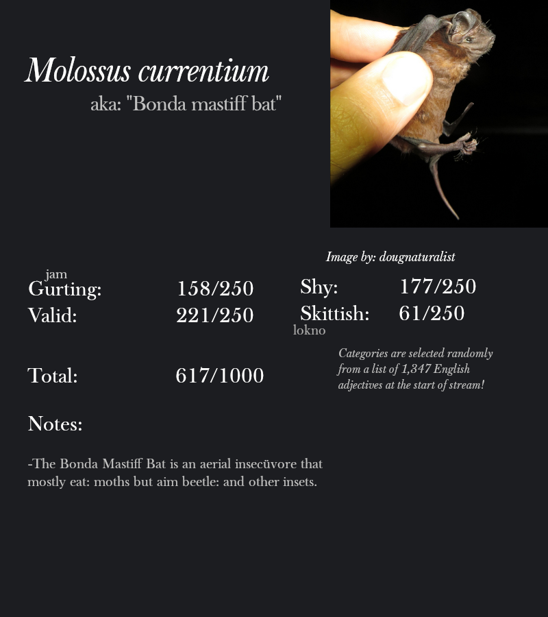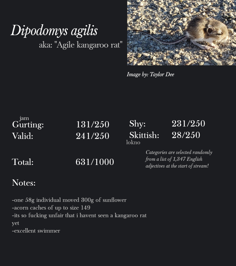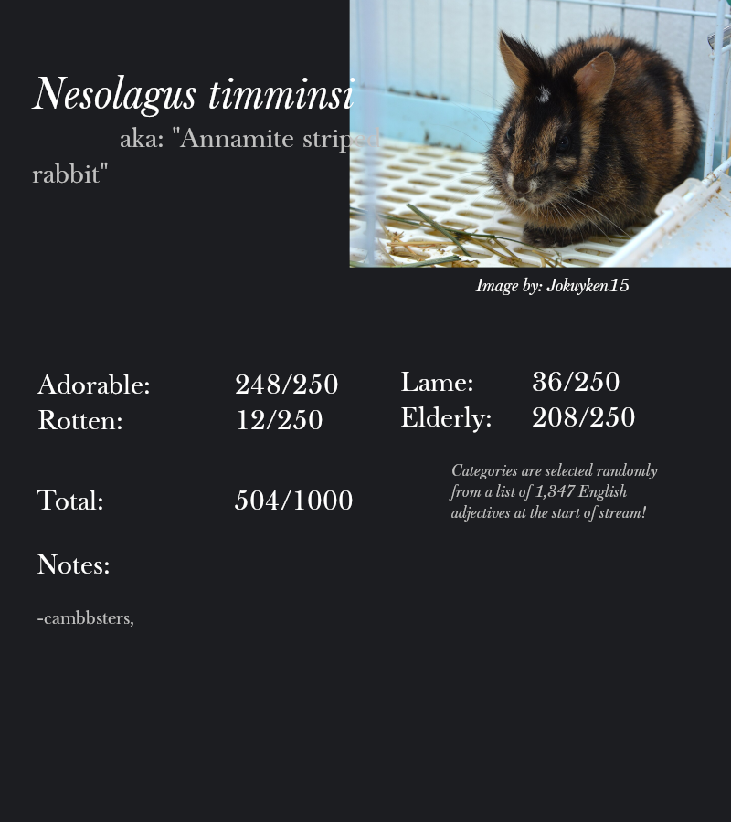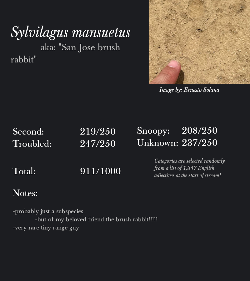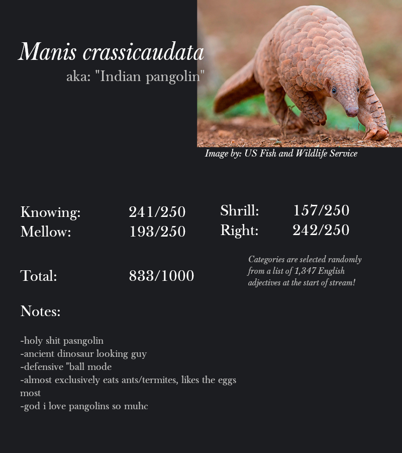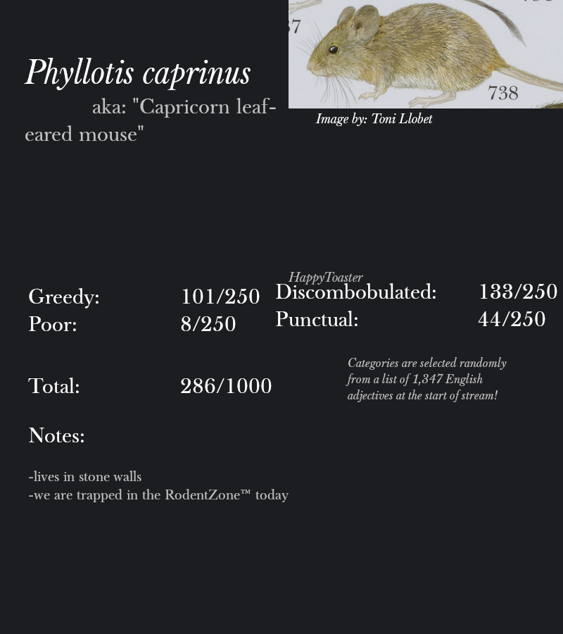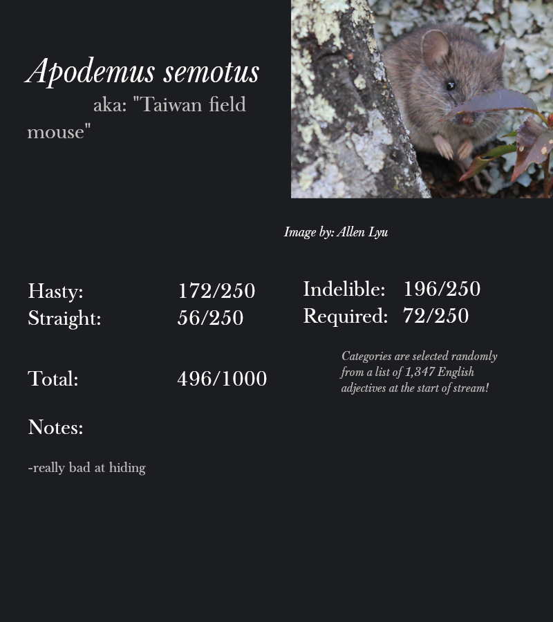 Categories are selected randomly from a list of 1,347 English adjectives at the start of stream! lokno Shy: 237/250 Skittish: 221/250 Image by: yonge Notes: