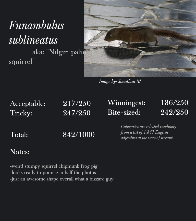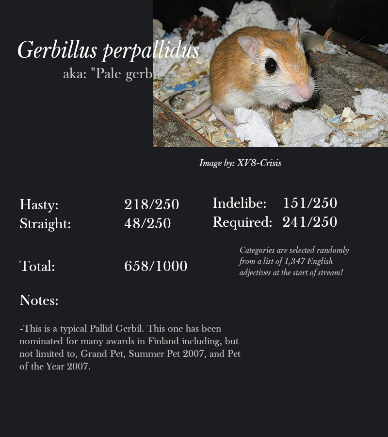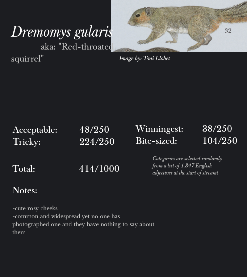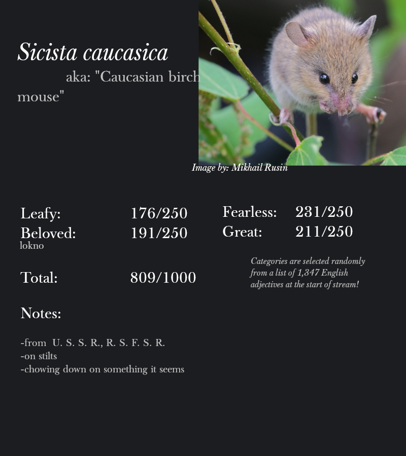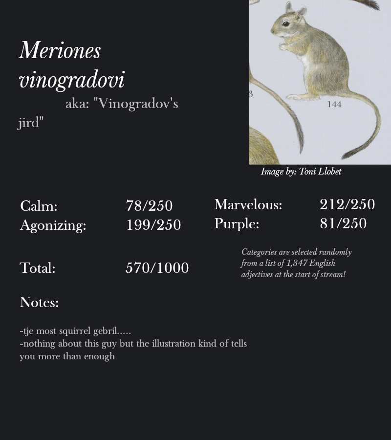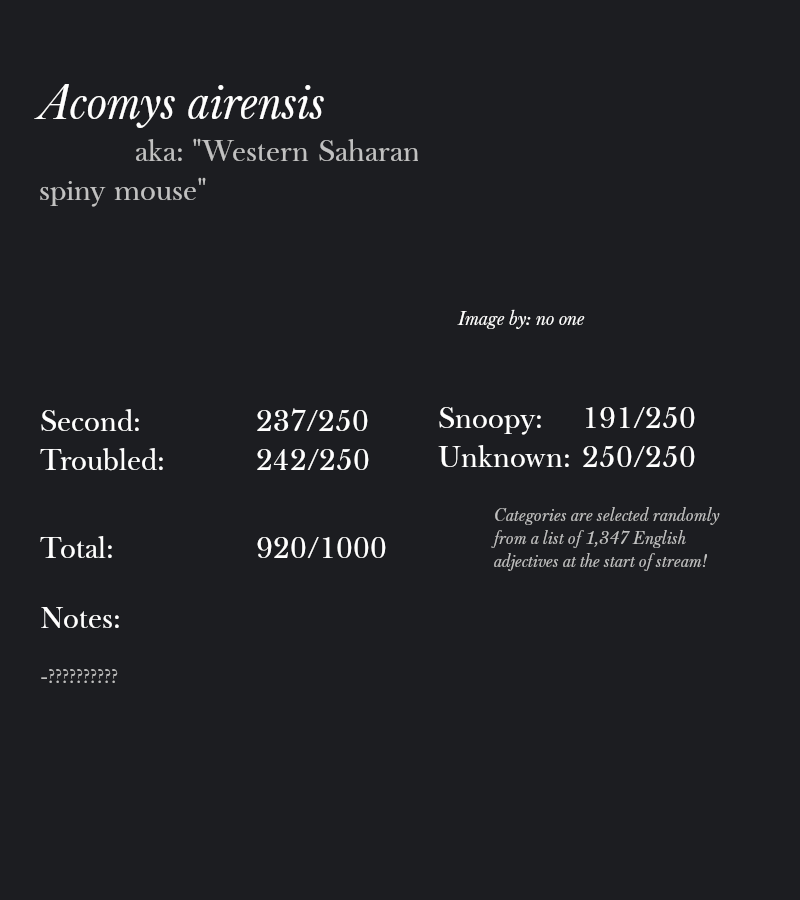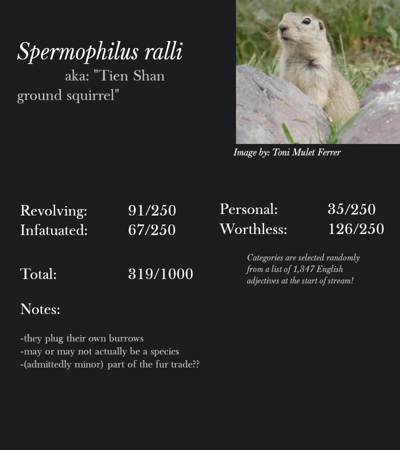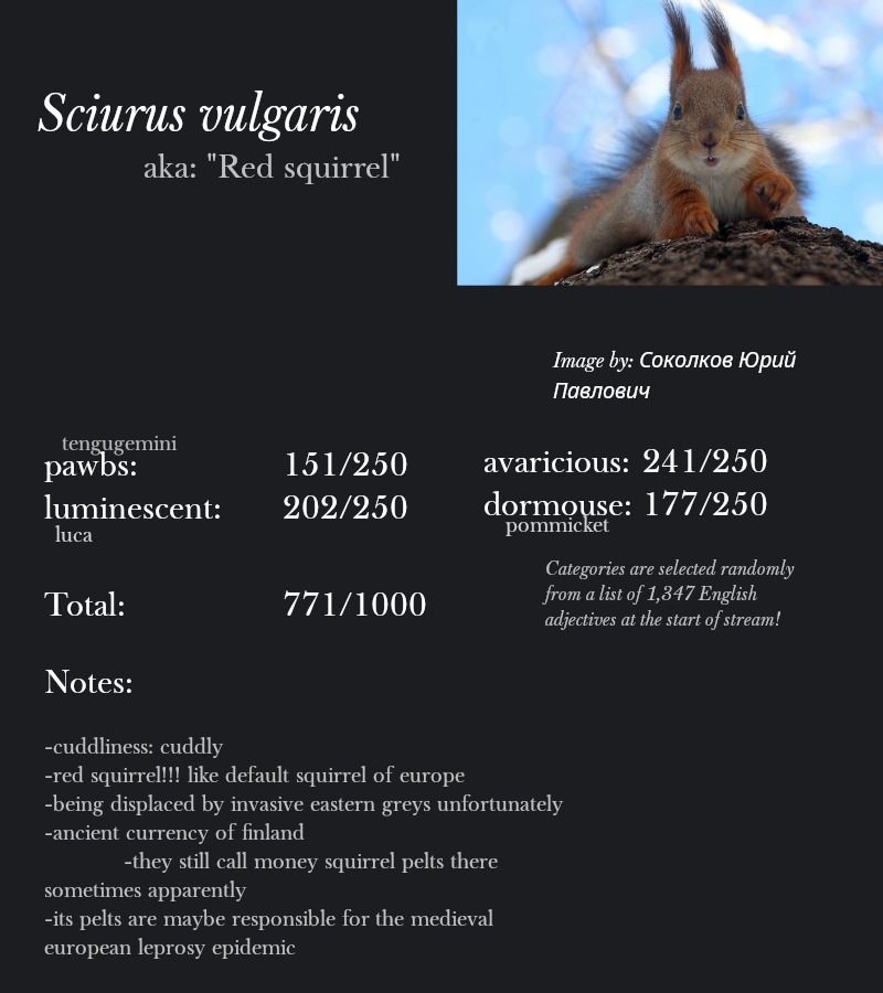 Categories are selected randomly from a list of 1,347 English adjectives at the start of stream! Sour: 22/250 These: 248/250 Image by: Nikolay Shpilenok