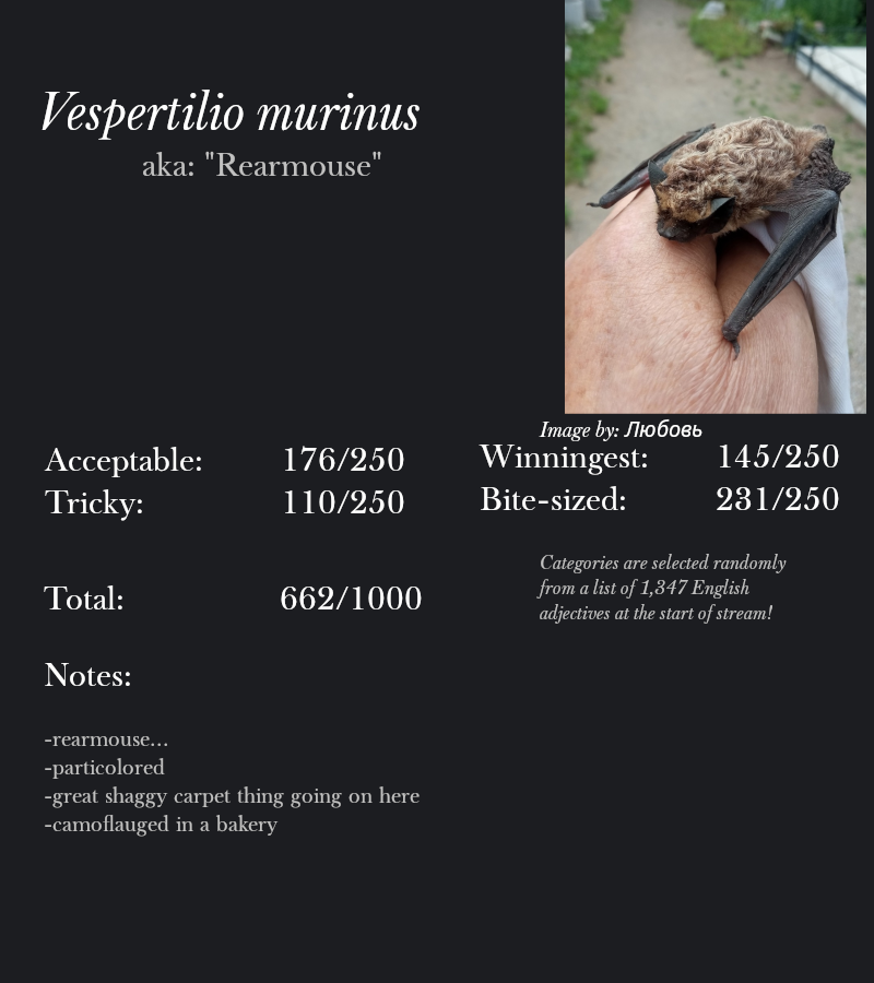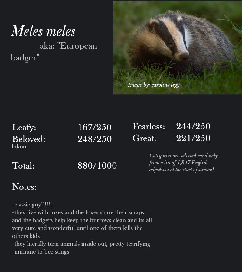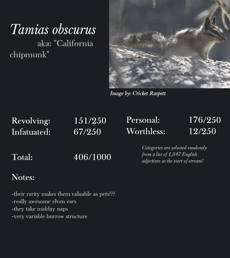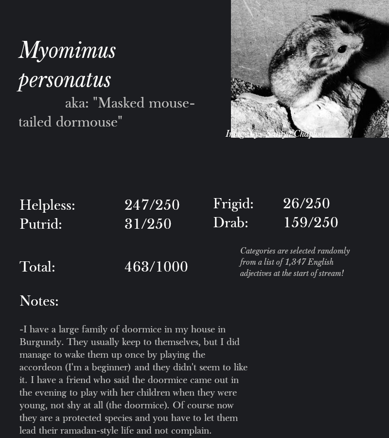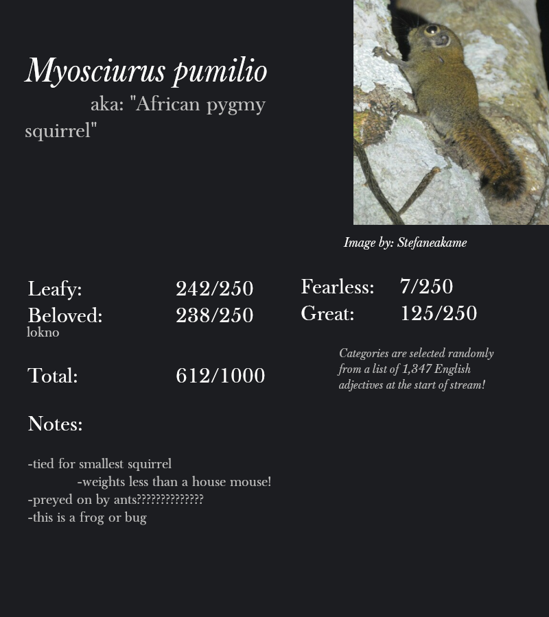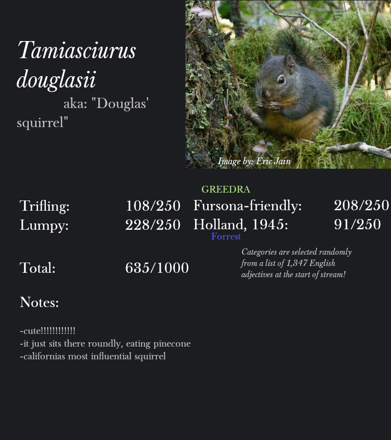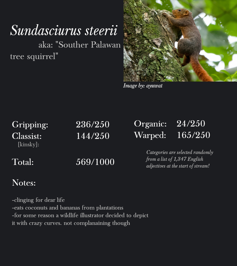 Categories are selected randomly from a list of 1,347 English adjectives at the start of stream! Sour: 22/250 These: 248/250 Image by: Nikolay Shpilenok