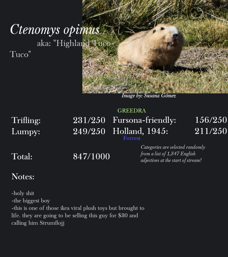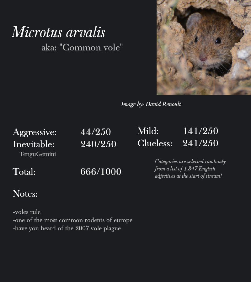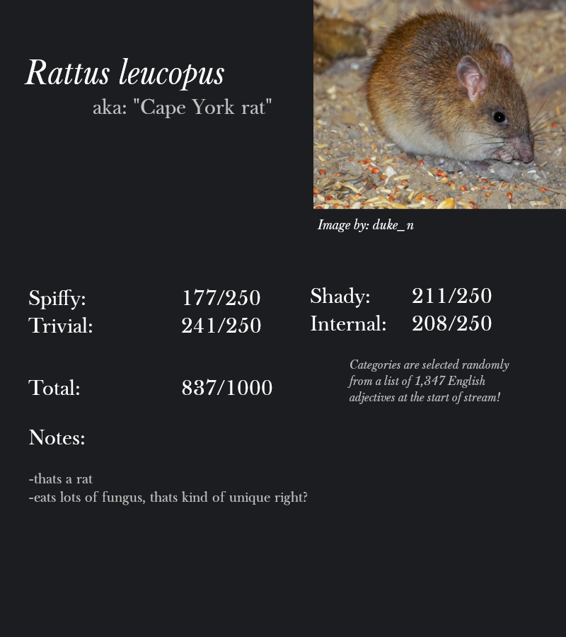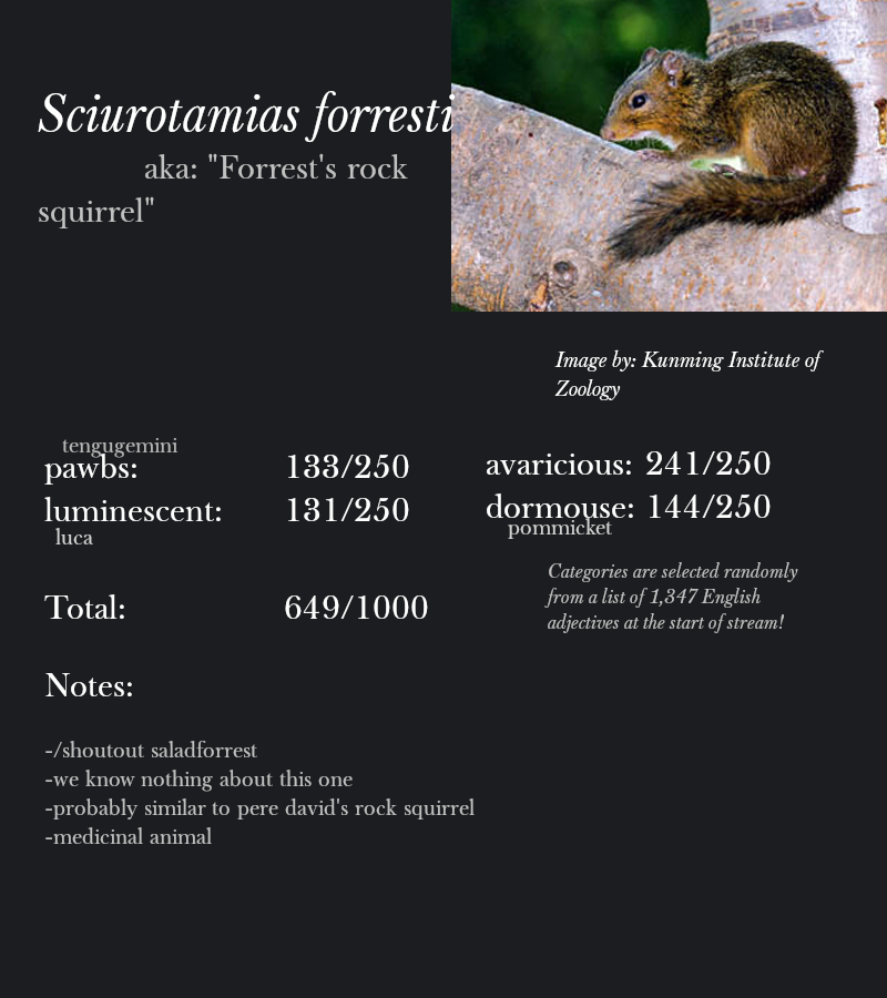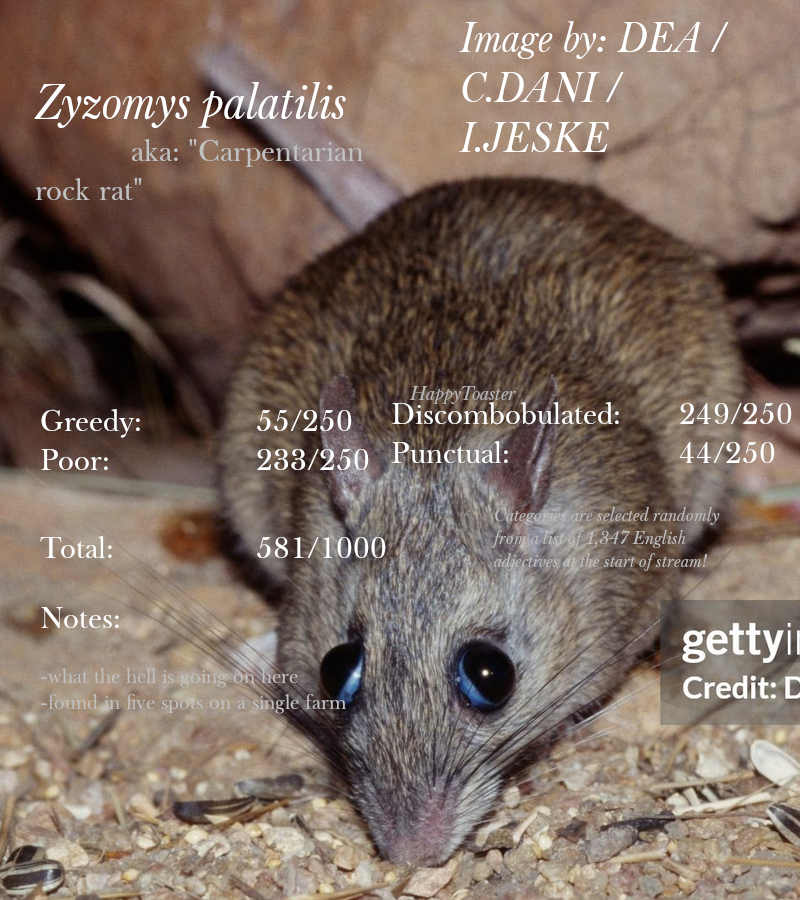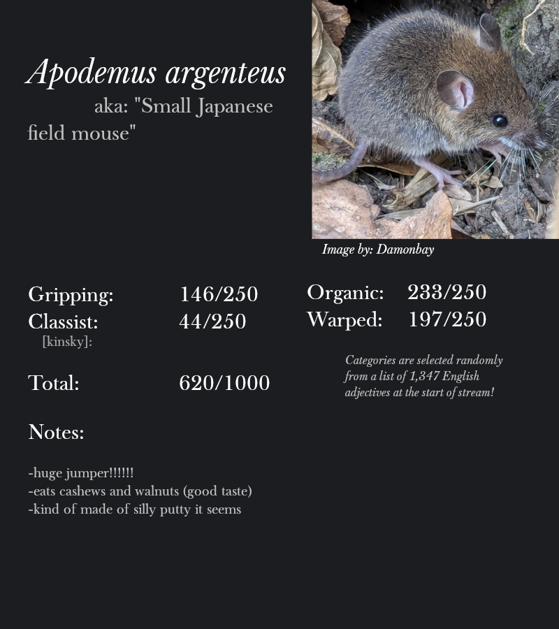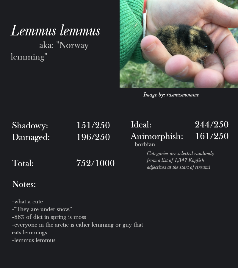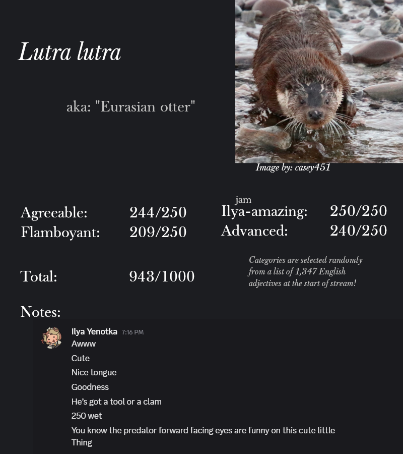 Categories are selected randomly from a list of 1,347 English adjectives at the start of stream! Sour: 22/250 These: 248/250 Image by: Nikolay Shpilenok