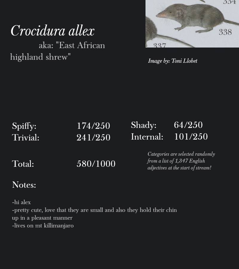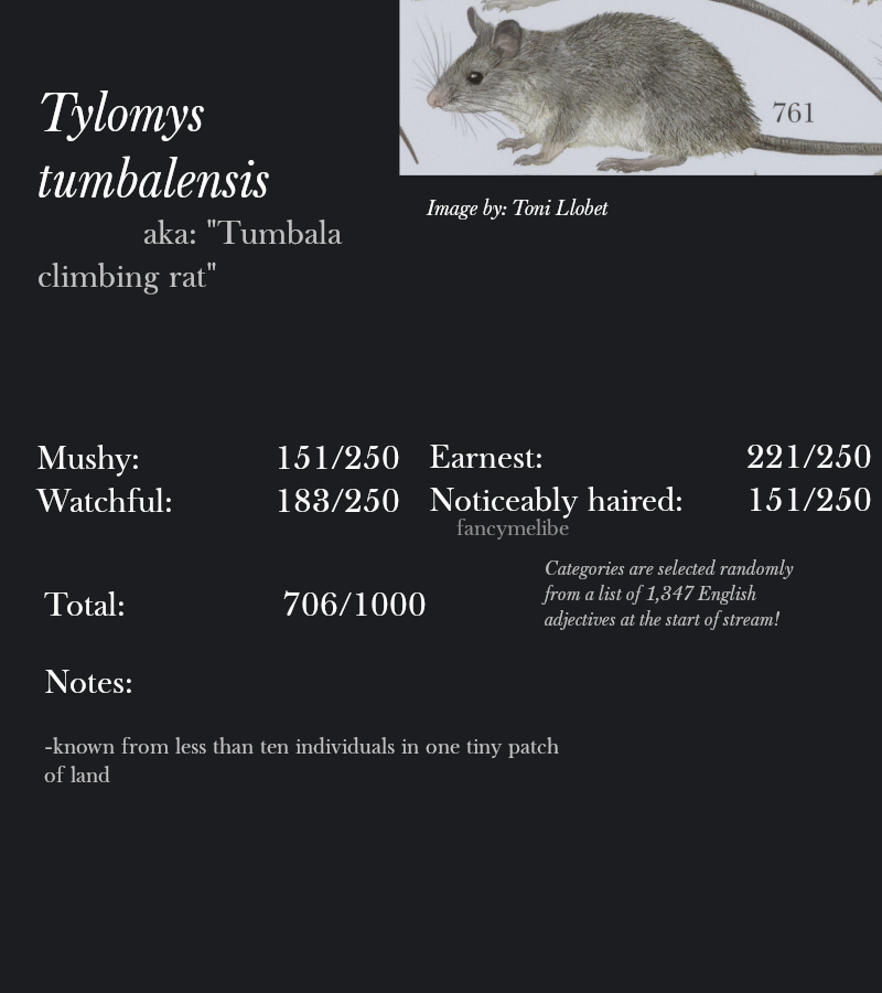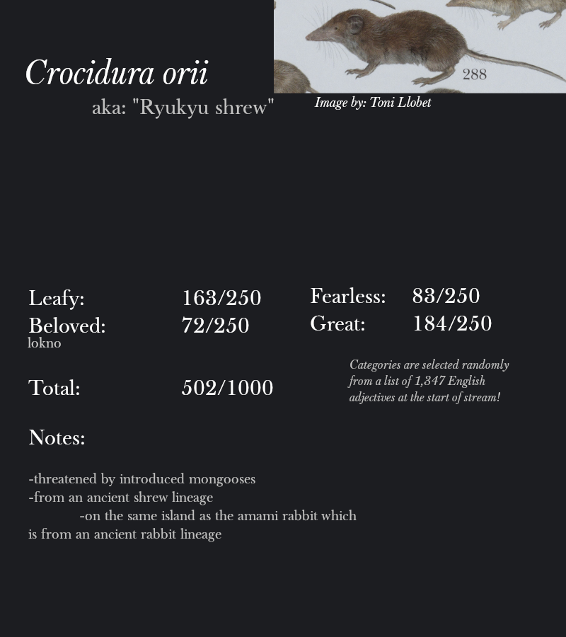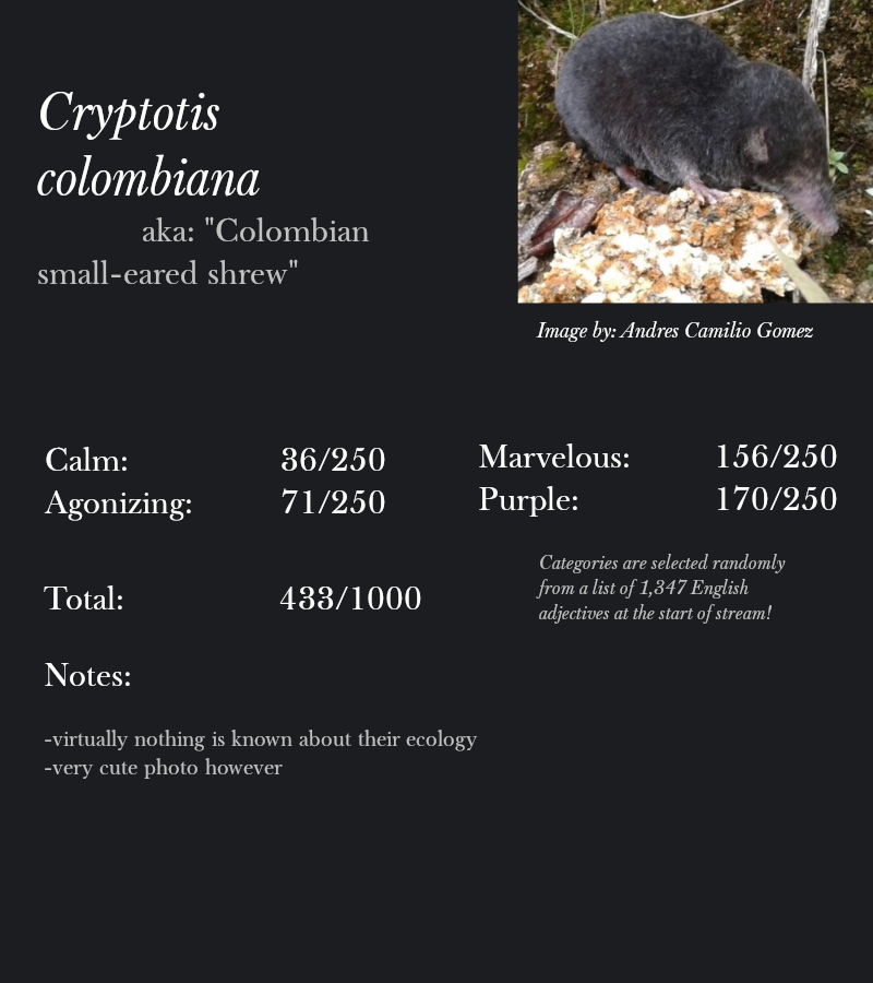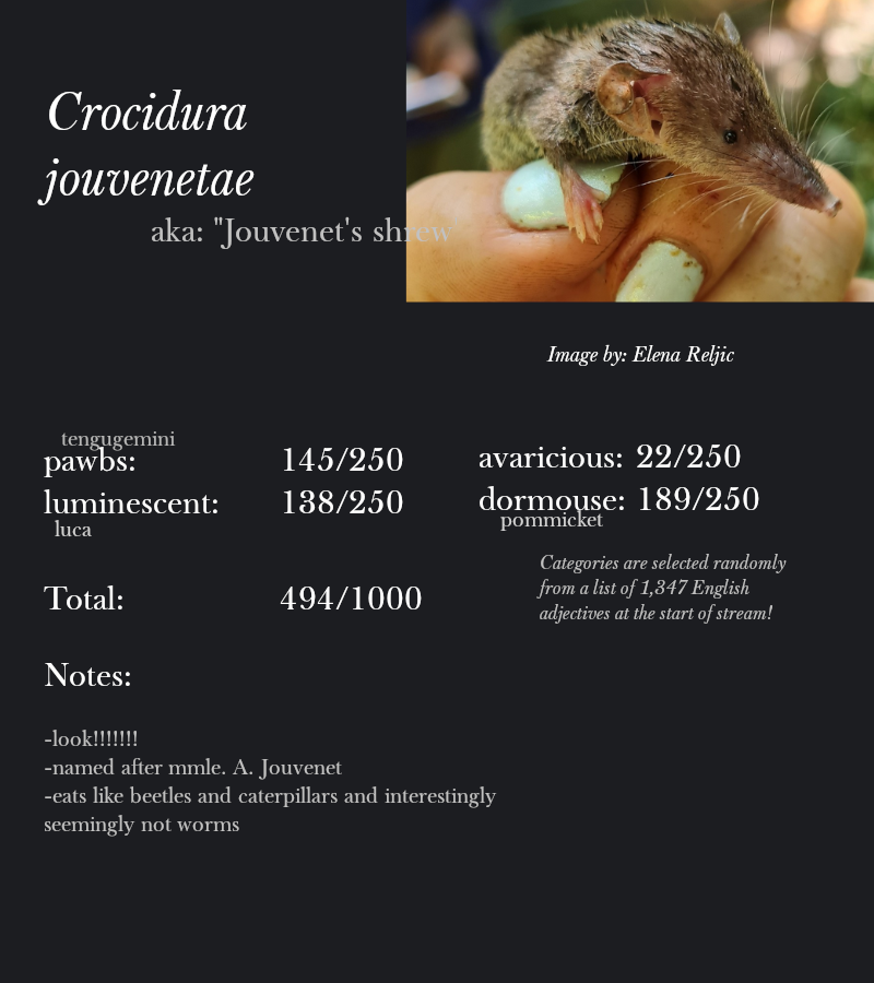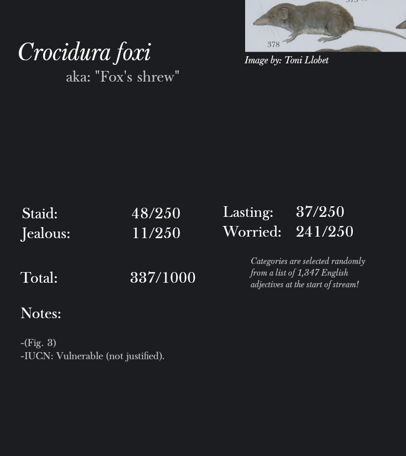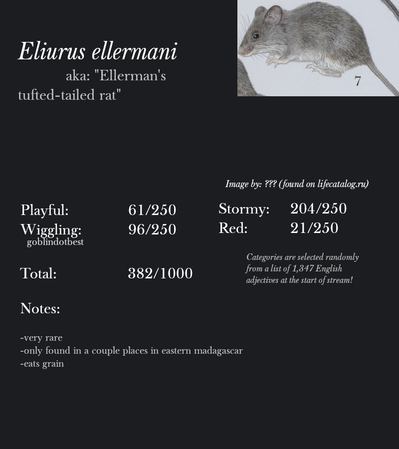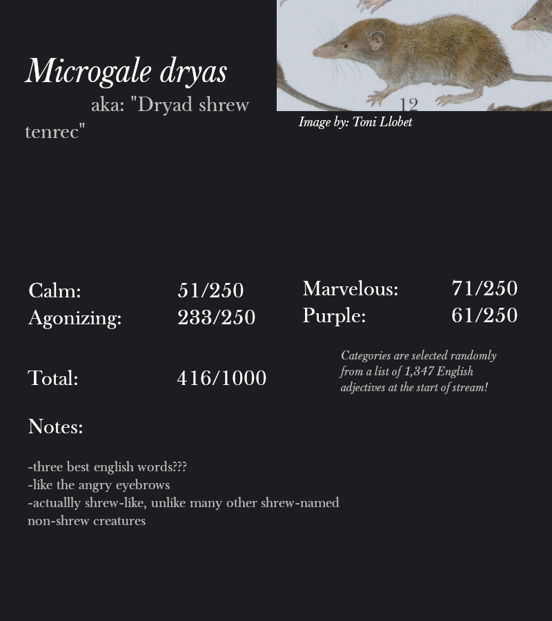 Microgale cowani aka: "Cowan's shrew tenrec" Unhealthy: 170/250 Normal: 40/250 Total: 560/1000 Notes: -mostly solitary -forelimbs suggest "digging behavior" -consumed by owls and other shrew tenrecs -cute buddy Image by: Sam Whitfield Heavenly: 194/250 Unruly: 156/250 Categories froma list are of 1 selected ,347 Eng randomly glish Categ froma ies list ar of select 1,347 ed rando English adjectives at the start of stream!