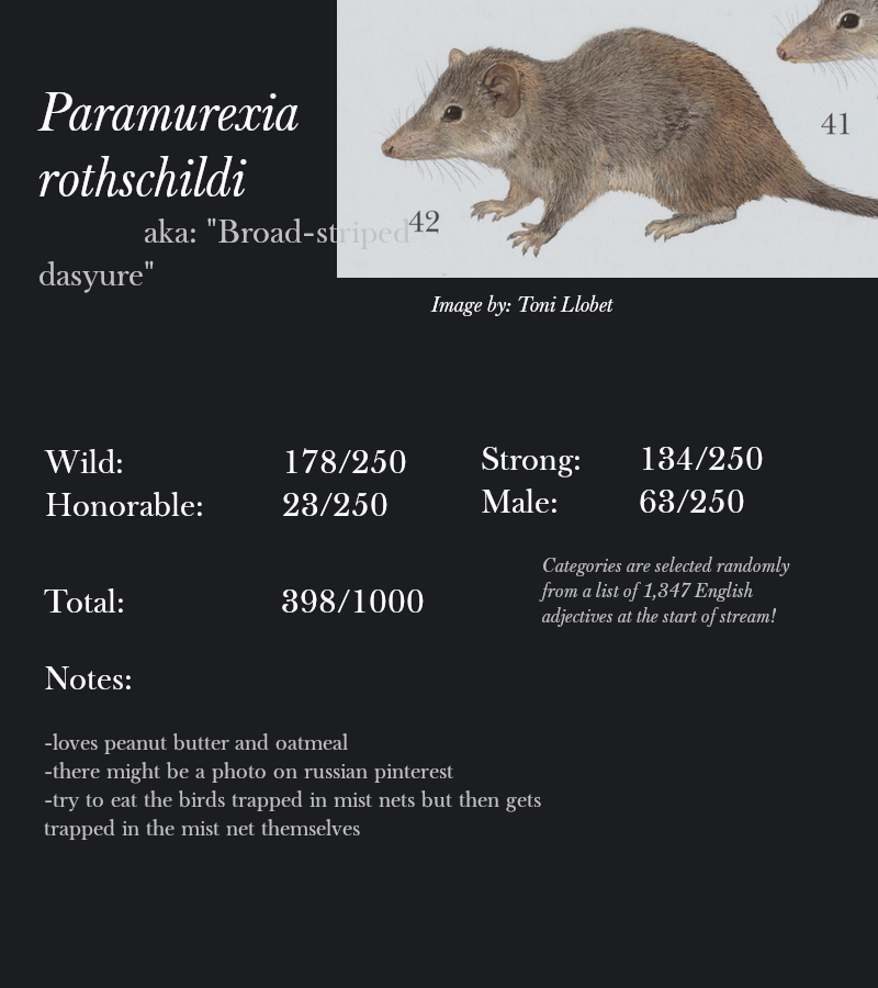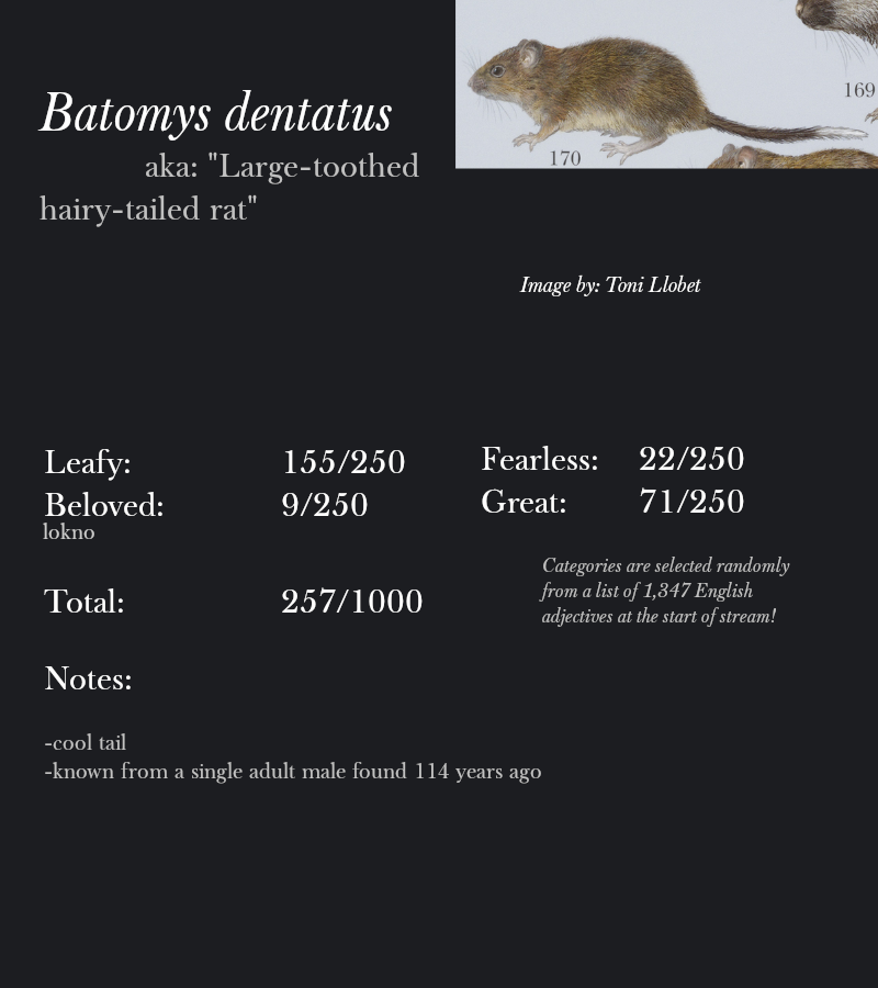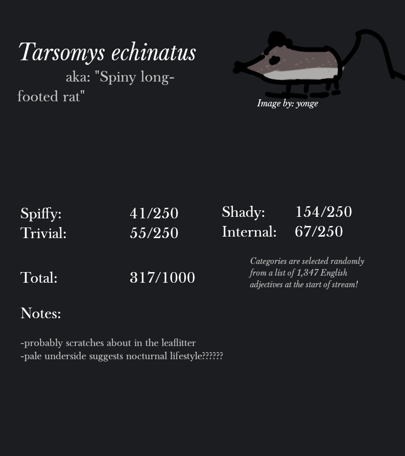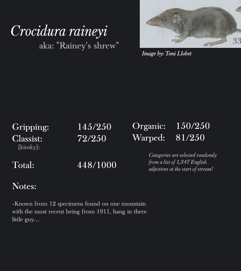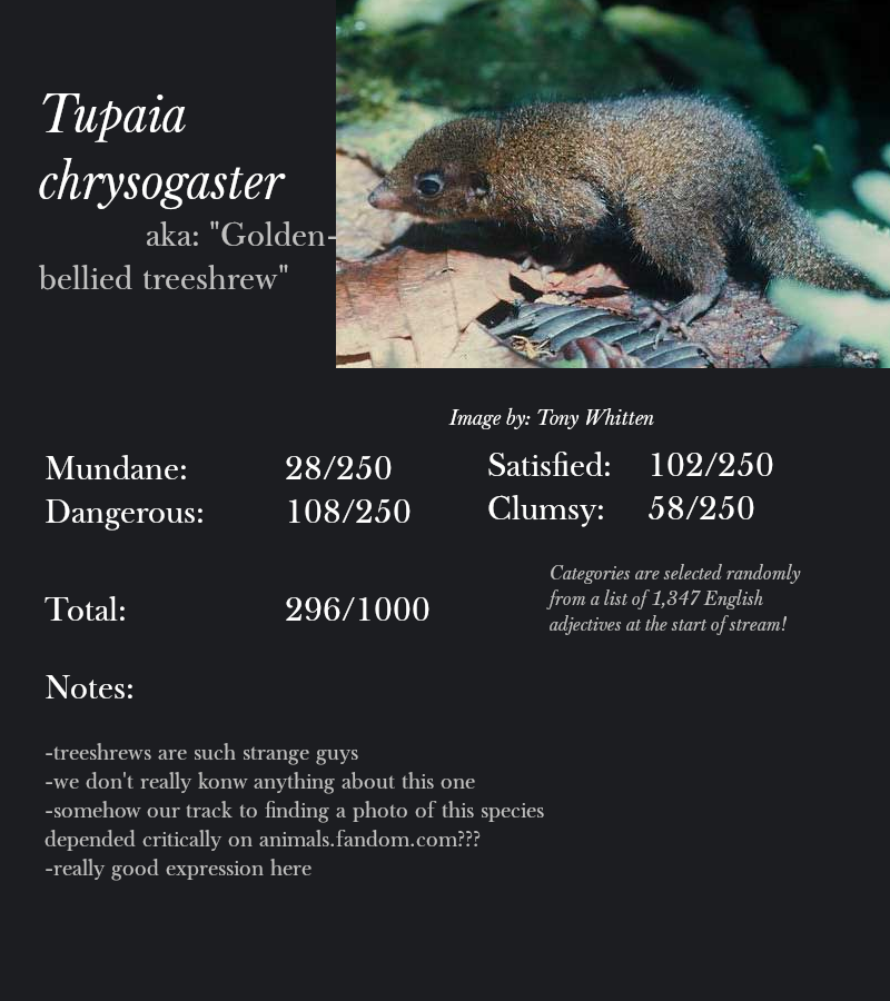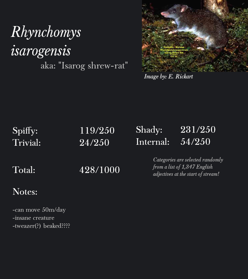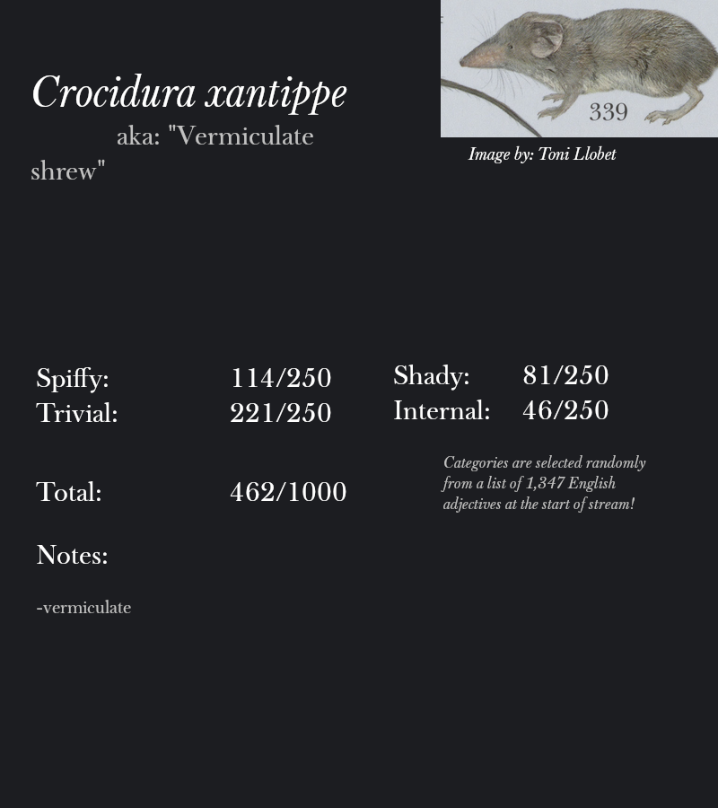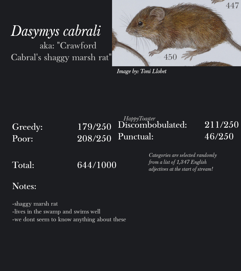 Microgale cowani aka: "Cowan's shrew tenrec" Unhealthy: 170/250 Normal: 40/250 Total: 560/1000 Notes: -mostly solitary -forelimbs suggest "digging behavior" -consumed by owls and other shrew tenrecs -cute buddy Image by: Sam Whitfield Heavenly: 194/250 Unruly: 156/250 Categories froma list are of 1 selected ,347 Eng randomly glish Categ froma ies list ar of select 1,347 ed rando English adjectives at the start of stream!