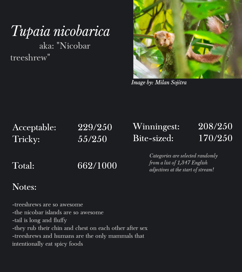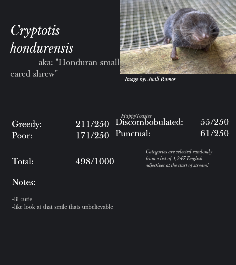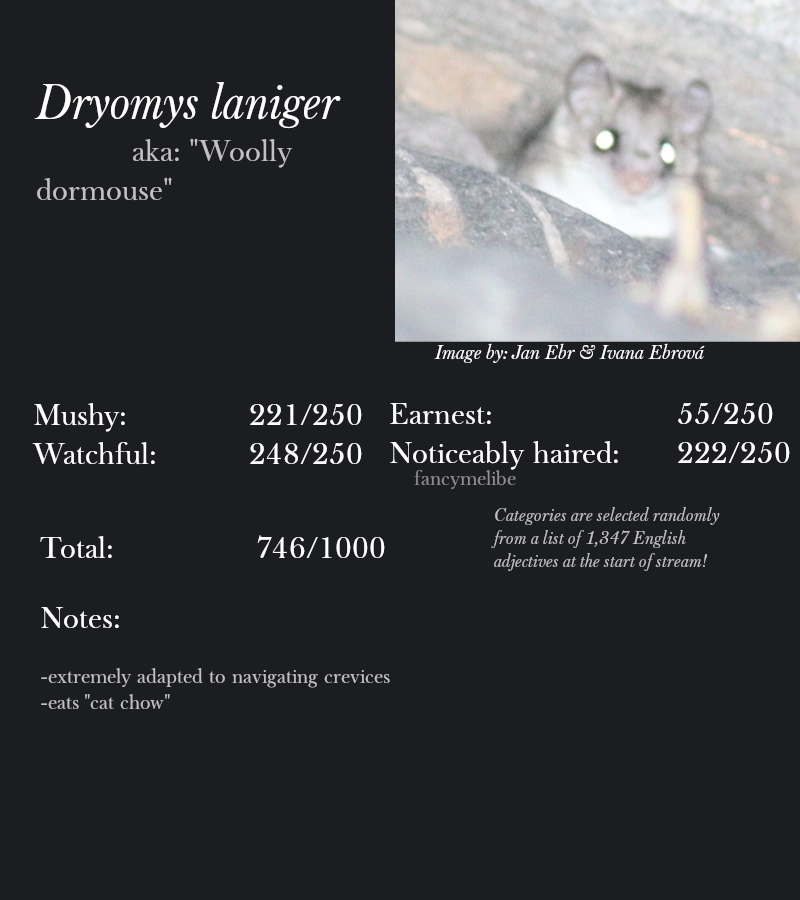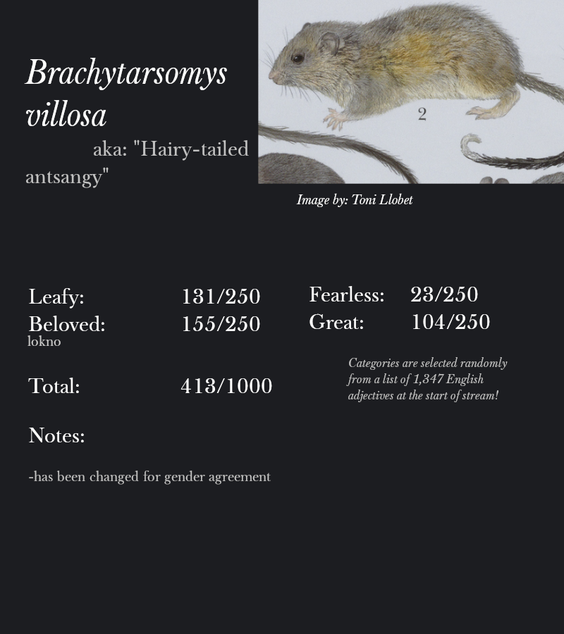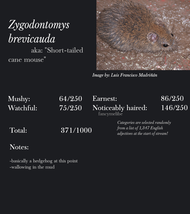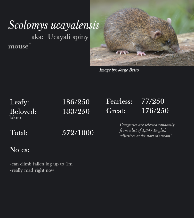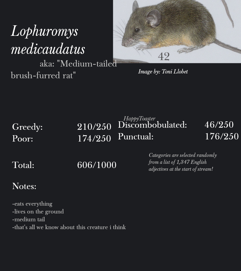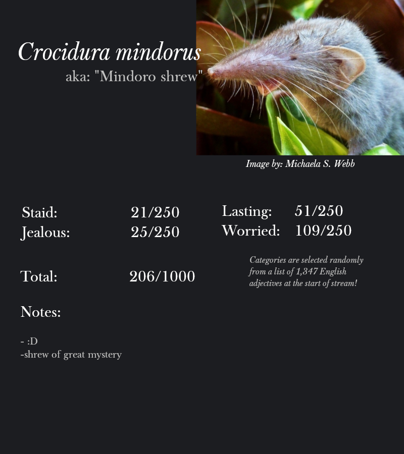Microgale cowani aka: "Cowan's shrew tenrec" Unhealthy: 170/250 Normal: 40/250 Total: 560/1000 Notes: -mostly solitary -forelimbs suggest "digging behavior" -consumed by owls and other shrew tenrecs -cute buddy Image by: Sam Whitfield Heavenly: 194/250 Unruly: 156/250 Categories froma list are of 1 selected ,347 Eng randomly glish Categ froma ies list ar of select 1,347 ed rando English adjectives at the start of stream!
