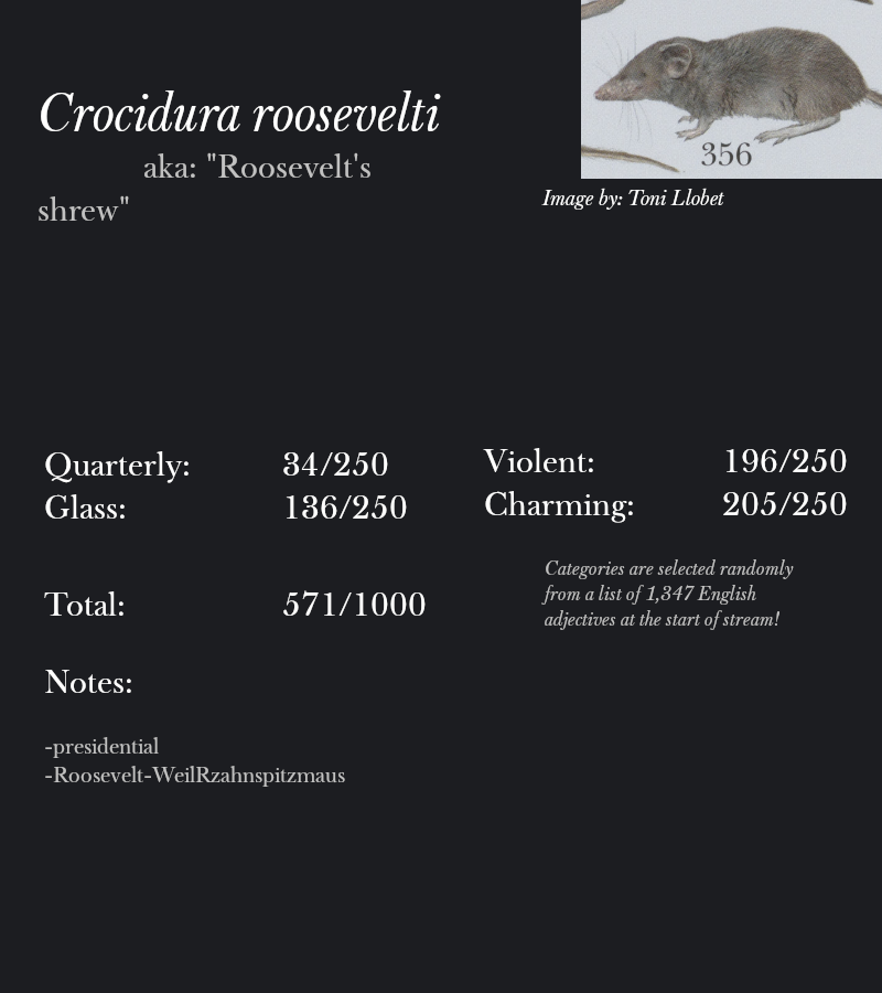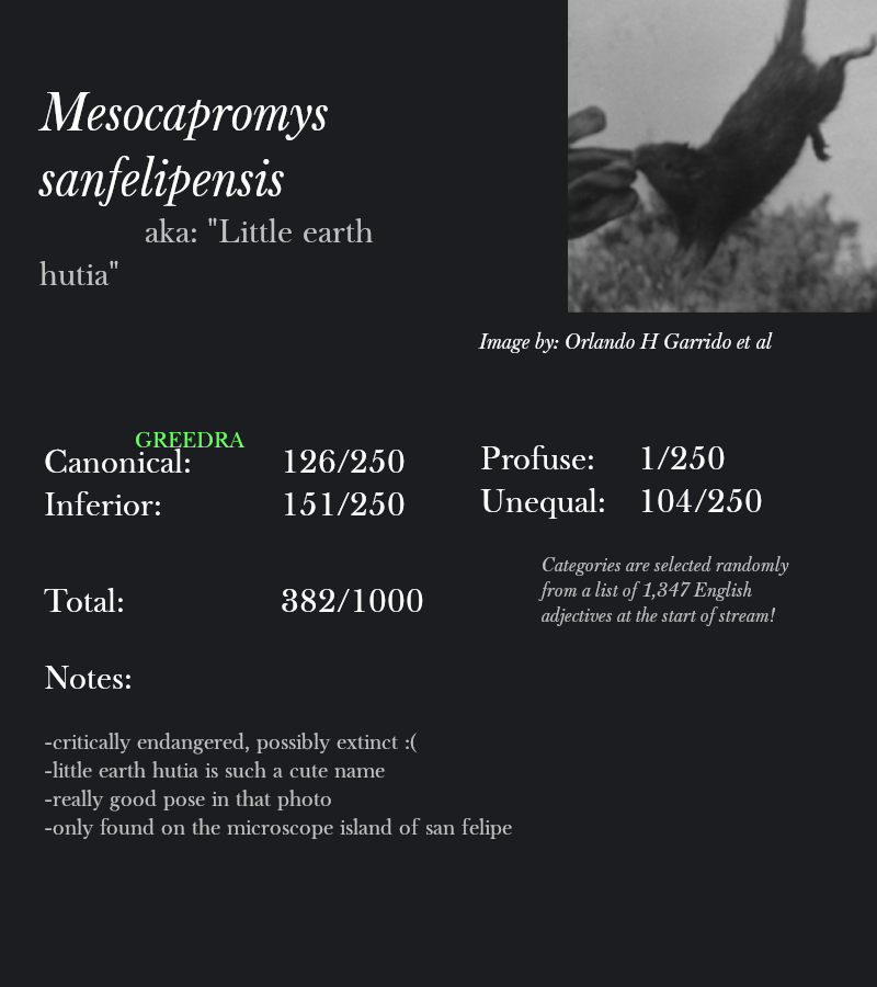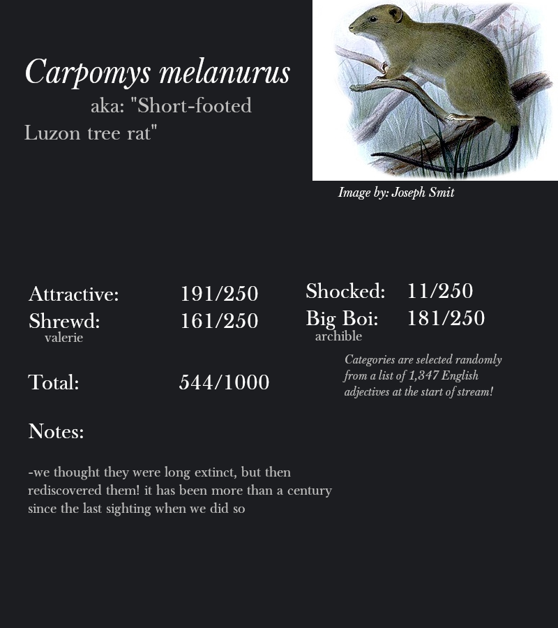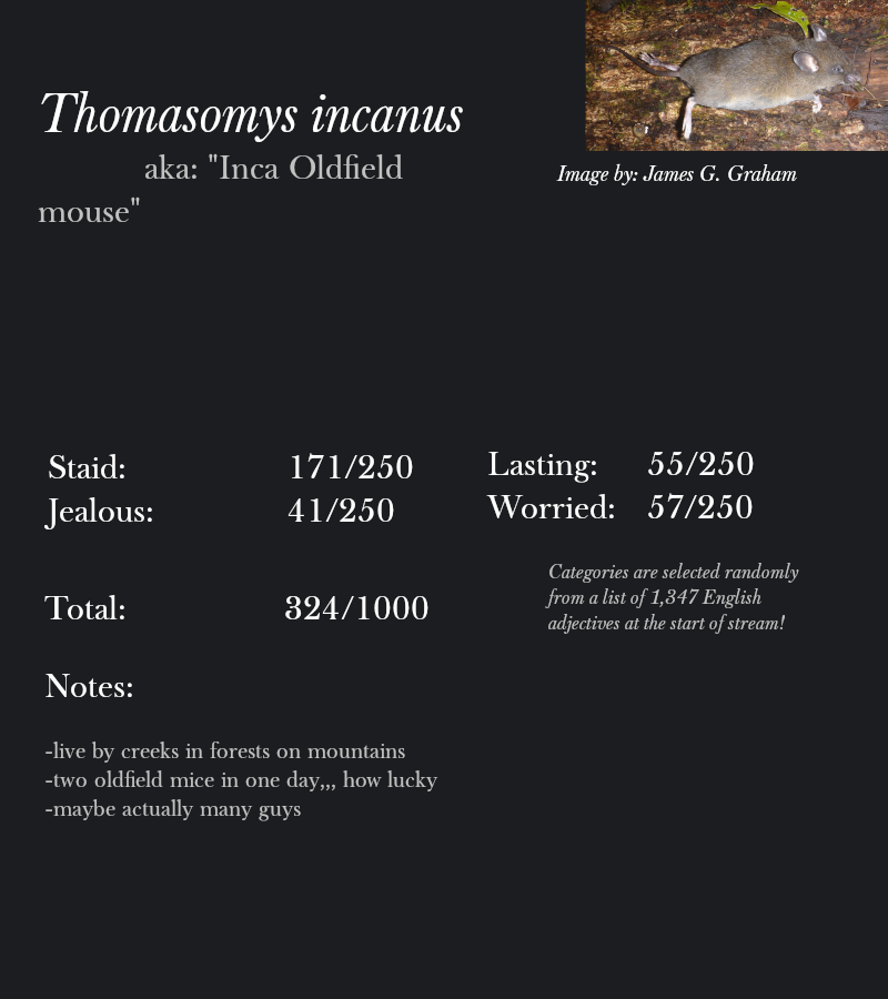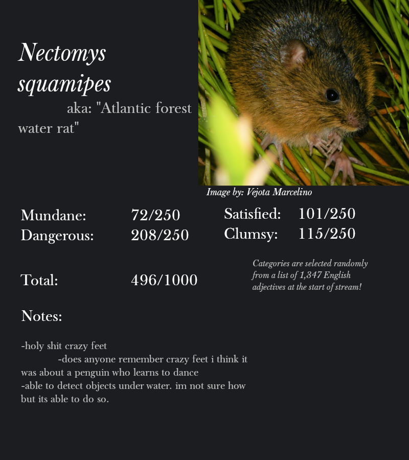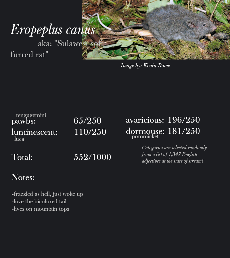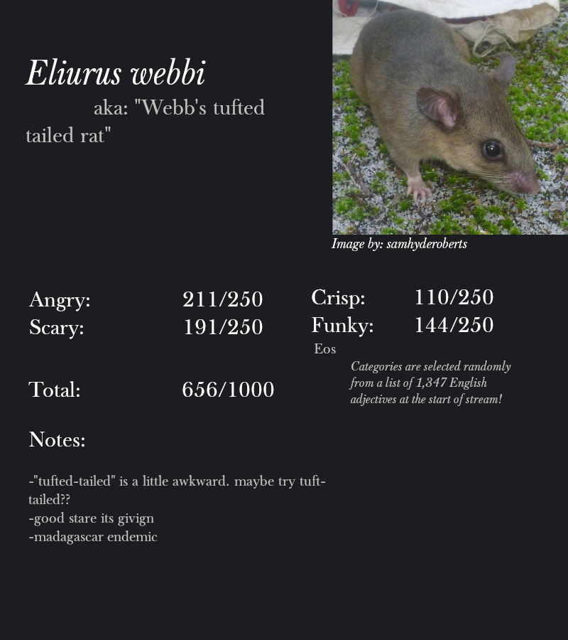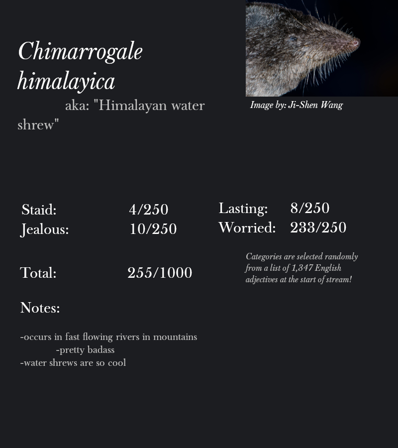 Microgale cowani aka: "Cowan's shrew tenrec" Unhealthy: 170/250 Normal: 40/250 Total: 560/1000 Notes: -mostly solitary -forelimbs suggest "digging behavior" -consumed by owls and other shrew tenrecs -cute buddy Image by: Sam Whitfield Heavenly: 194/250 Unruly: 156/250 Categories froma list are of 1 selected ,347 Eng randomly glish Categ froma ies list ar of select 1,347 ed rando English adjectives at the start of stream!