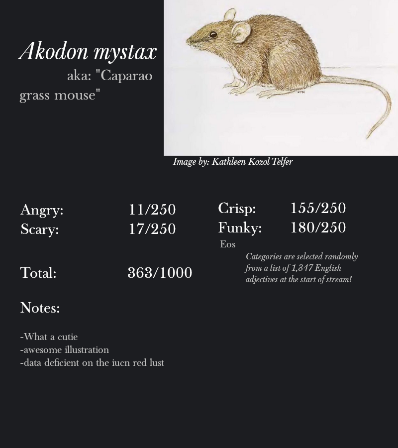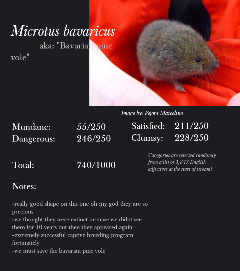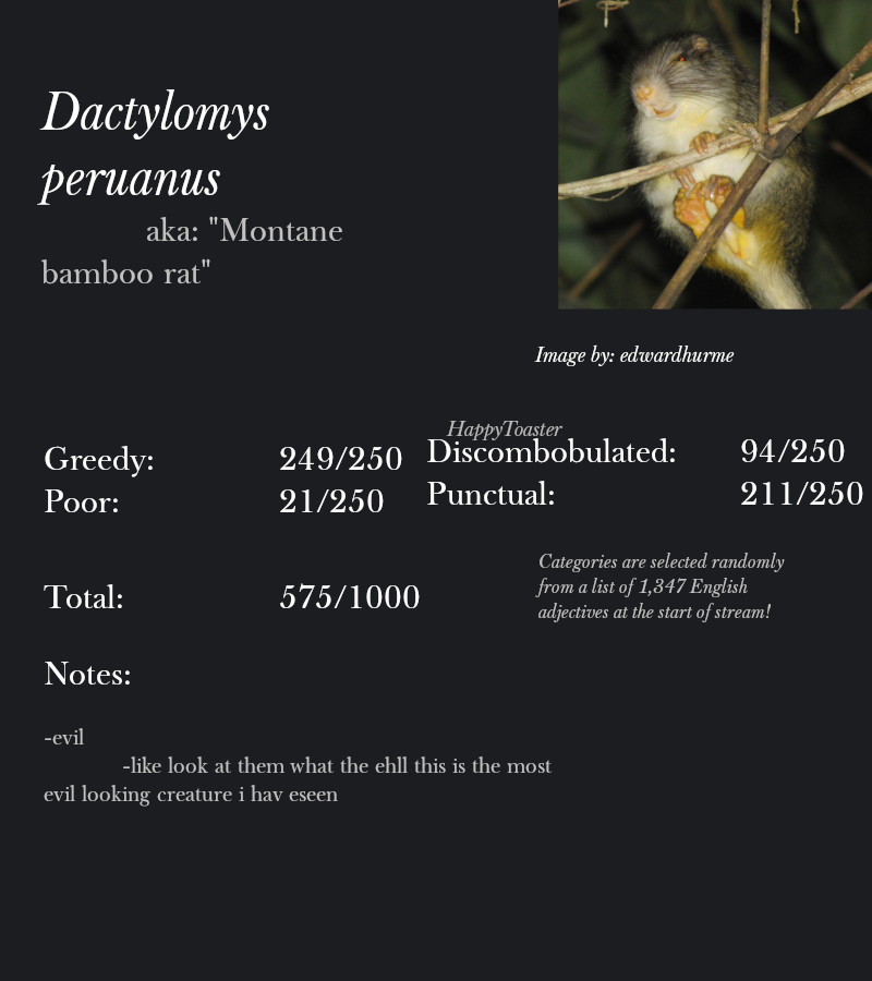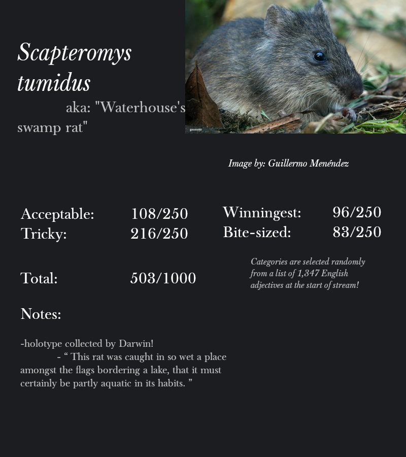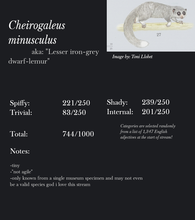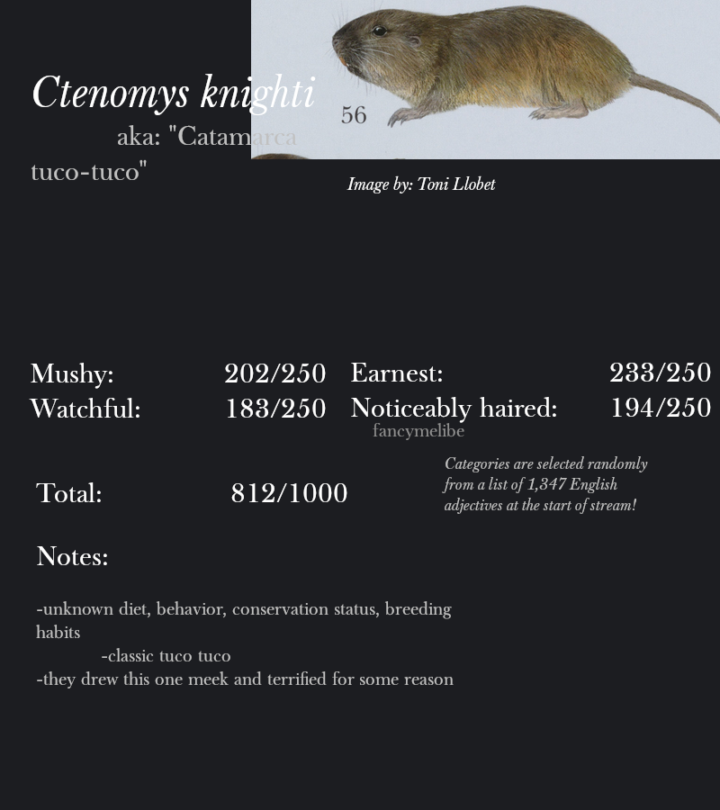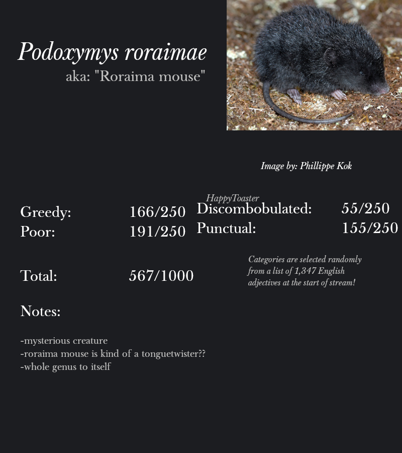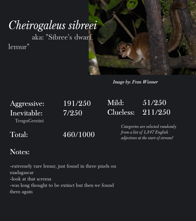 Microgale cowani aka: "Cowan's shrew tenrec" Unhealthy: 170/250 Normal: 40/250 Total: 560/1000 Notes: -mostly solitary -forelimbs suggest "digging behavior" -consumed by owls and other shrew tenrecs -cute buddy Image by: Sam Whitfield Heavenly: 194/250 Unruly: 156/250 Categories froma list are of 1 selected ,347 Eng randomly glish Categ froma ies list ar of select 1,347 ed rando English adjectives at the start of stream!