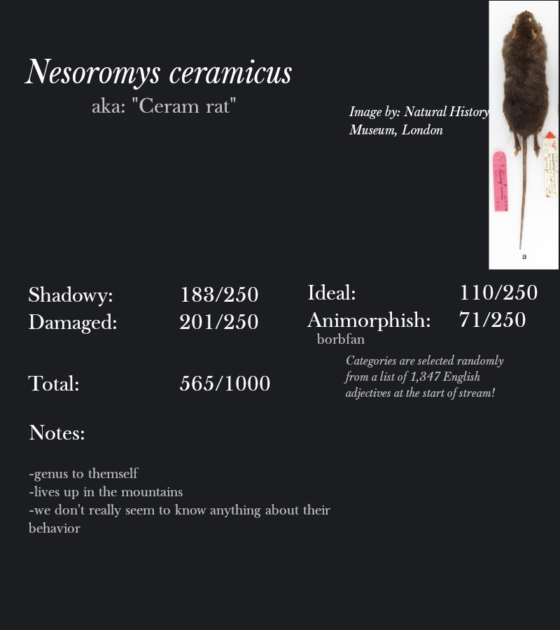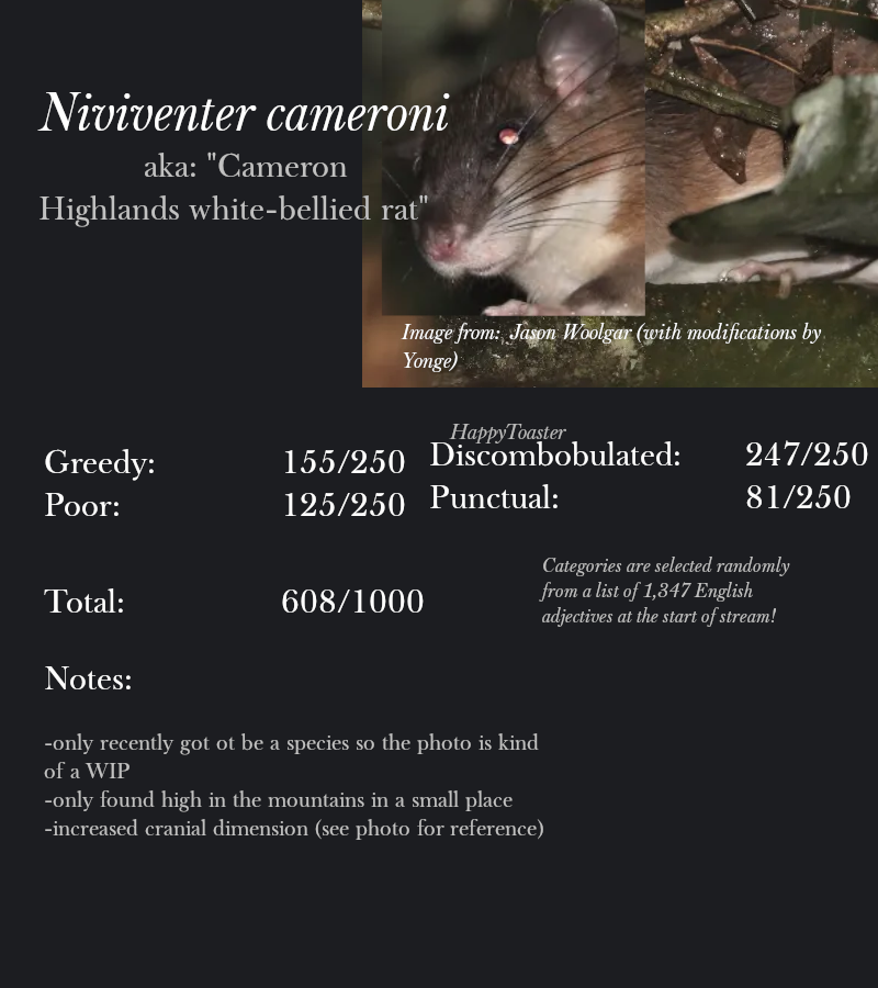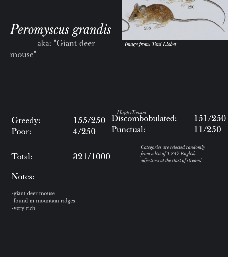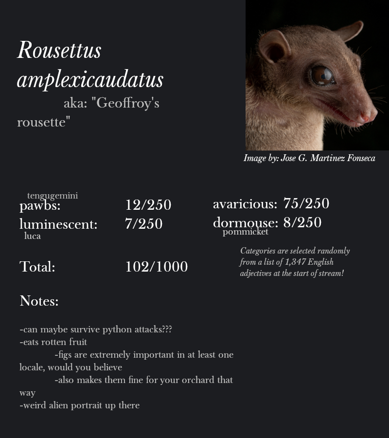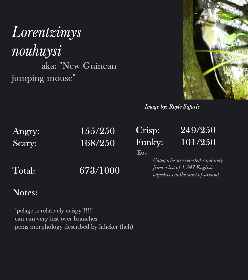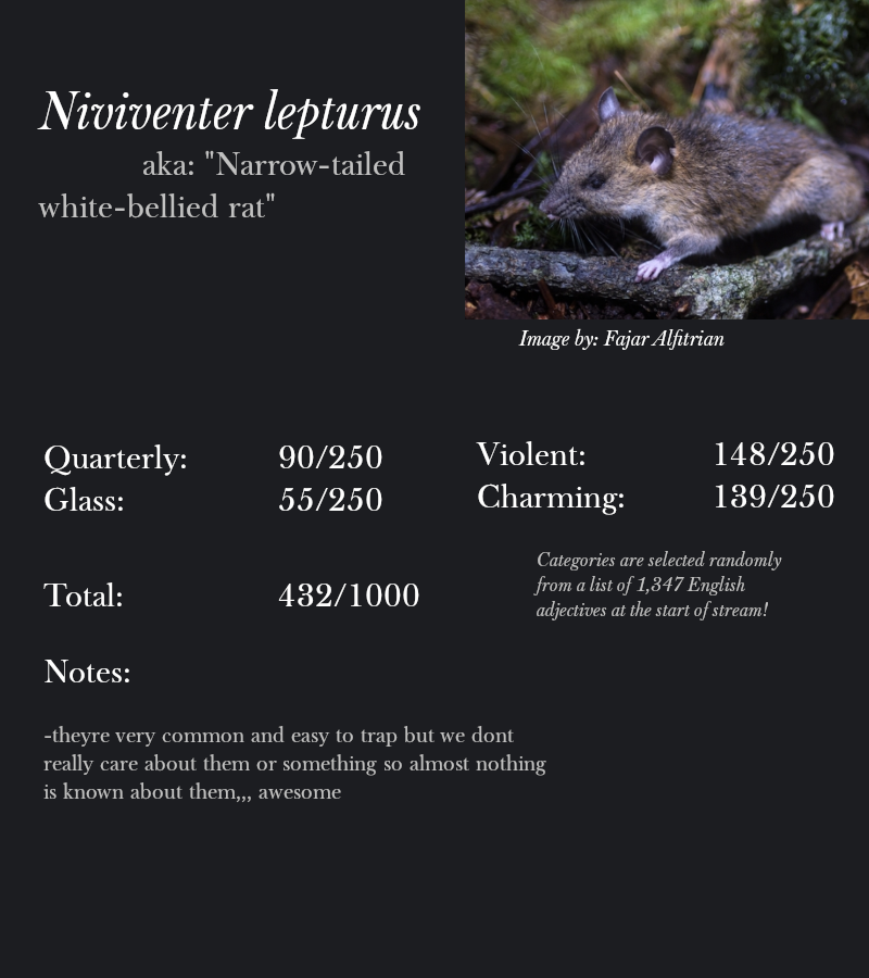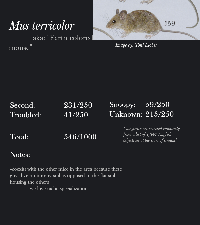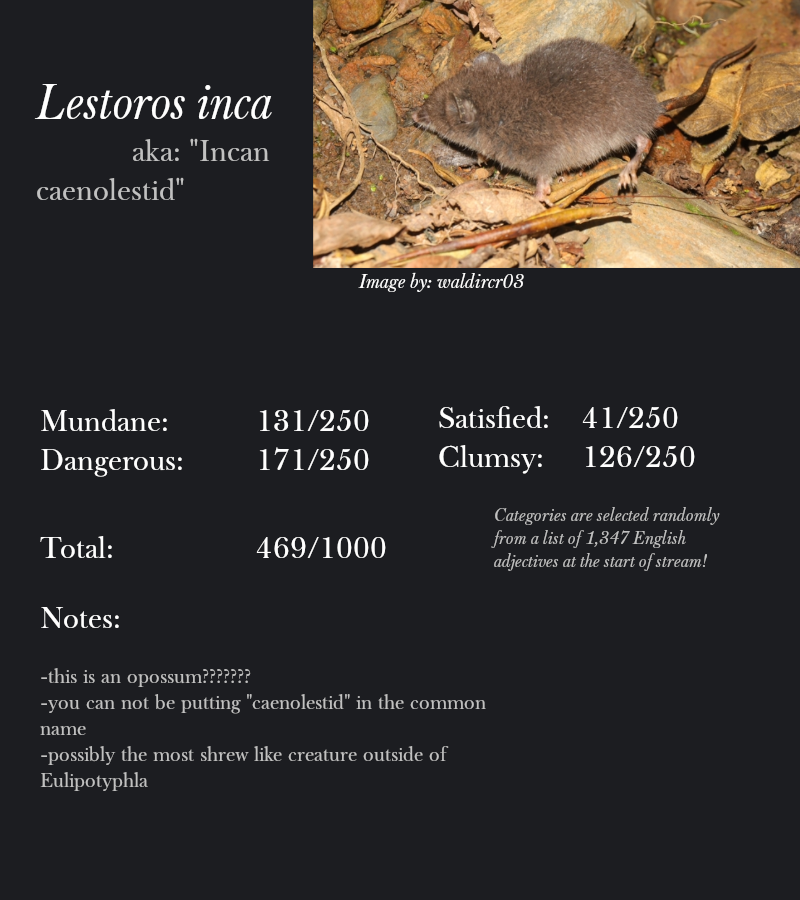 Microgale cowani aka: "Cowan's shrew tenrec" Unhealthy: 170/250 Normal: 40/250 Total: 560/1000 Notes: -mostly solitary -forelimbs suggest "digging behavior" -consumed by owls and other shrew tenrecs -cute buddy Image by: Sam Whitfield Heavenly: 194/250 Unruly: 156/250 Categories froma list are of 1 selected ,347 Eng randomly glish Categ froma ies list ar of select 1,347 ed rando English adjectives at the start of stream!