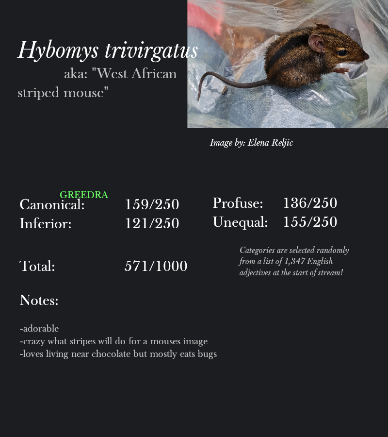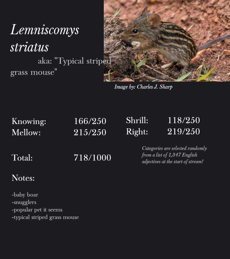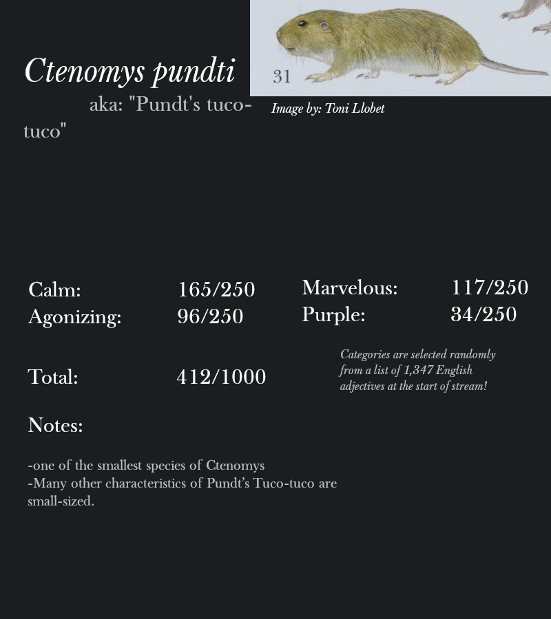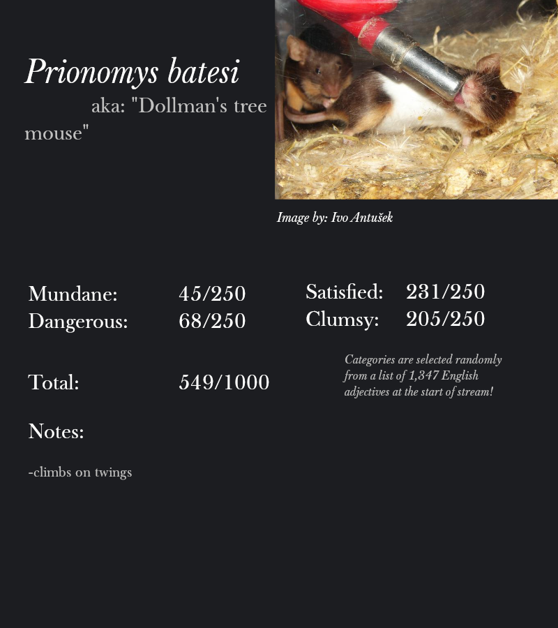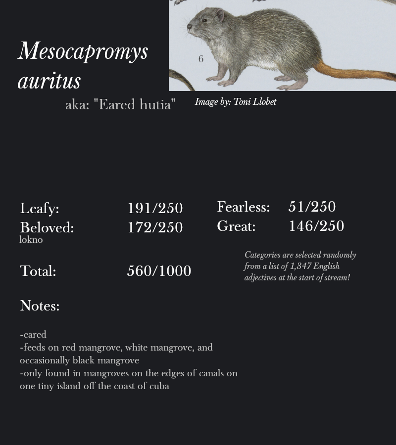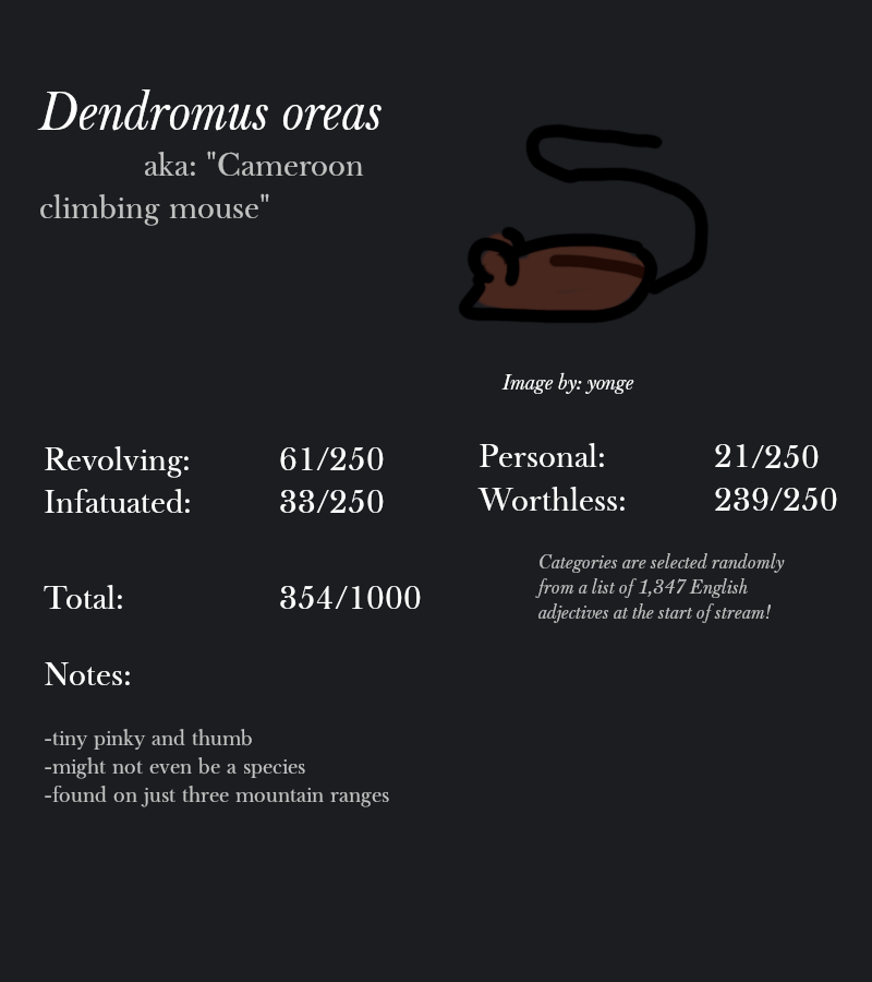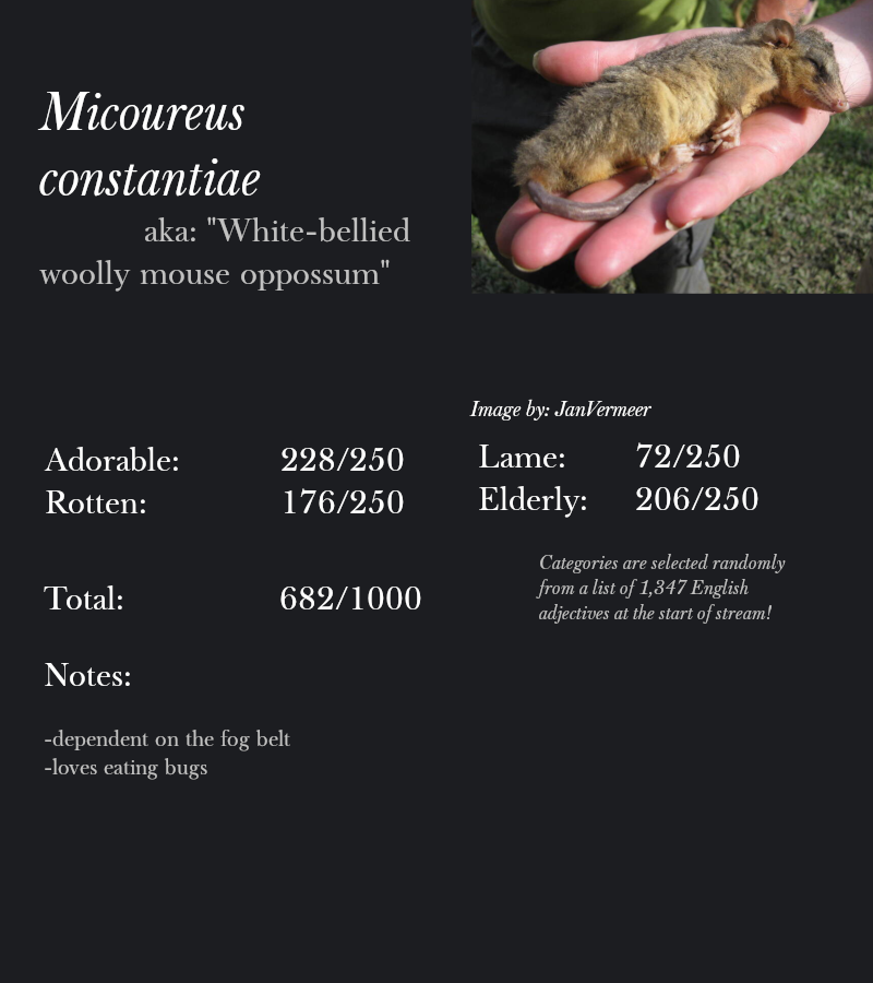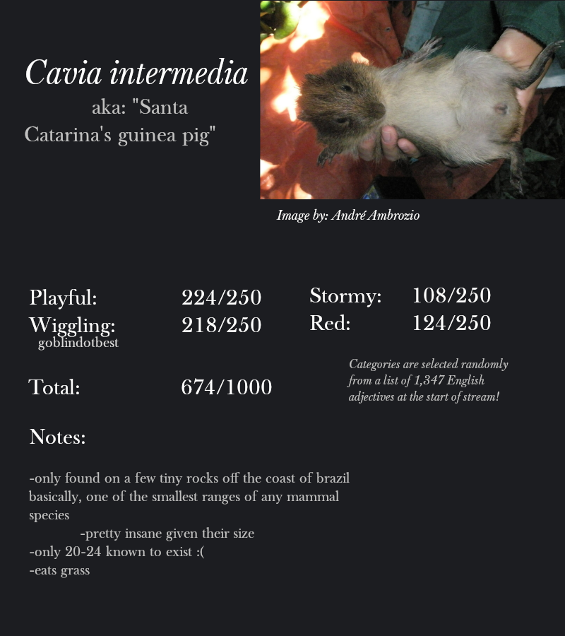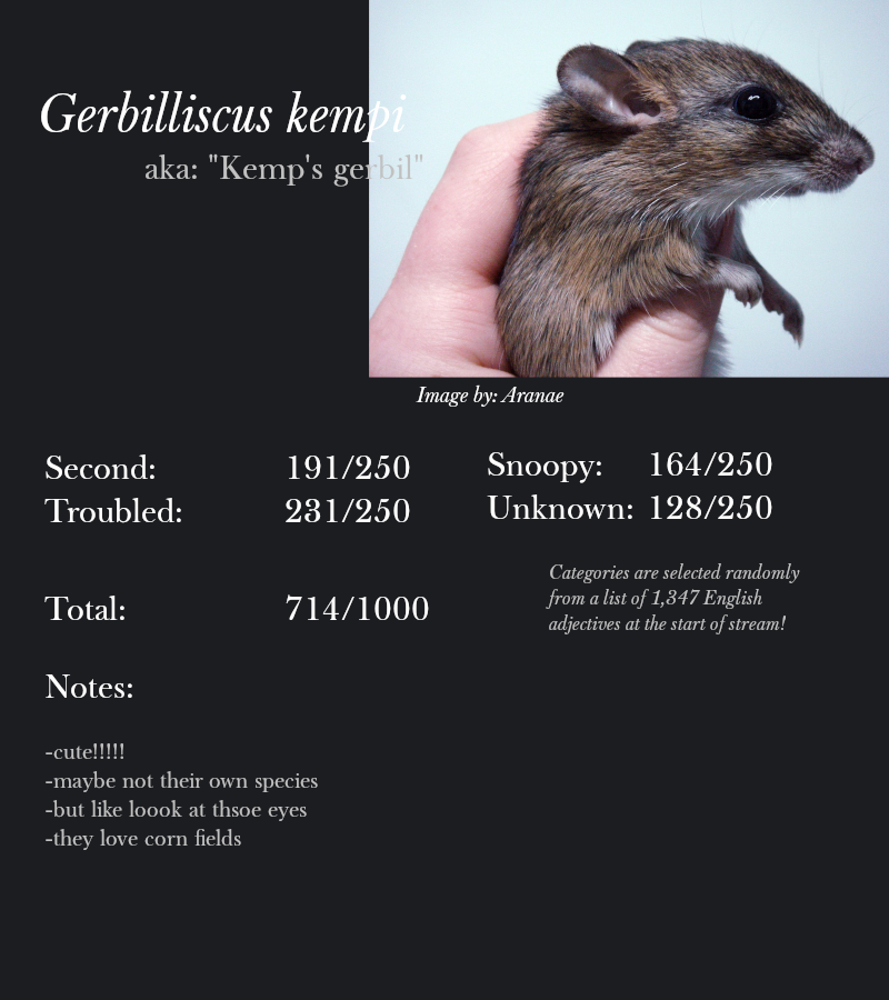 Microgale cowani aka: "Cowan's shrew tenrec" Unhealthy: 170/250 Normal: 40/250 Total: 560/1000 Notes: -mostly solitary -forelimbs suggest "digging behavior" -consumed by owls and other shrew tenrecs -cute buddy Image by: Sam Whitfield Heavenly: 194/250 Unruly: 156/250 Categories froma list are of 1 selected ,347 Eng randomly glish Categ froma ies list ar of select 1,347 ed rando English adjectives at the start of stream!