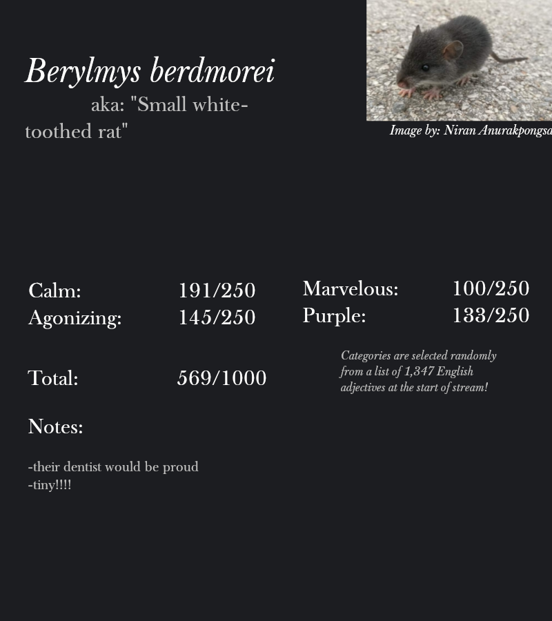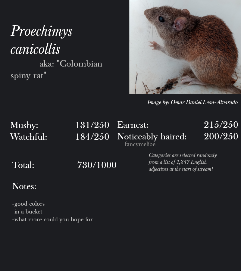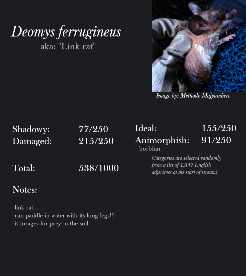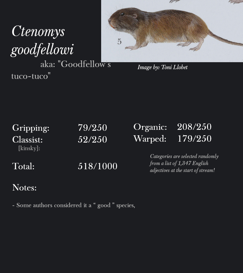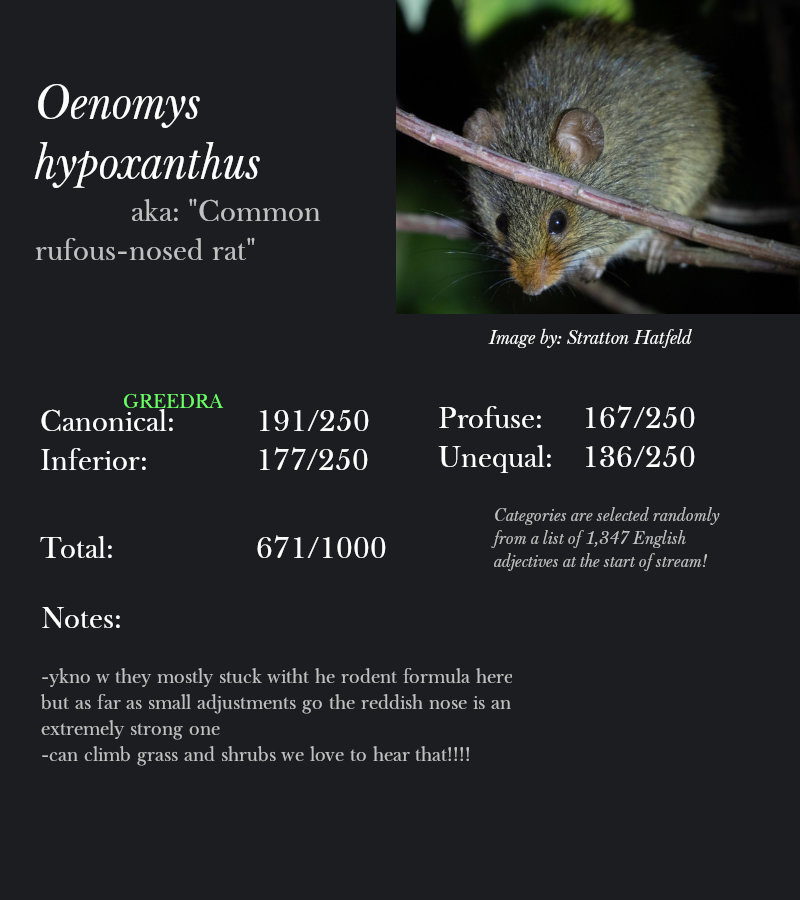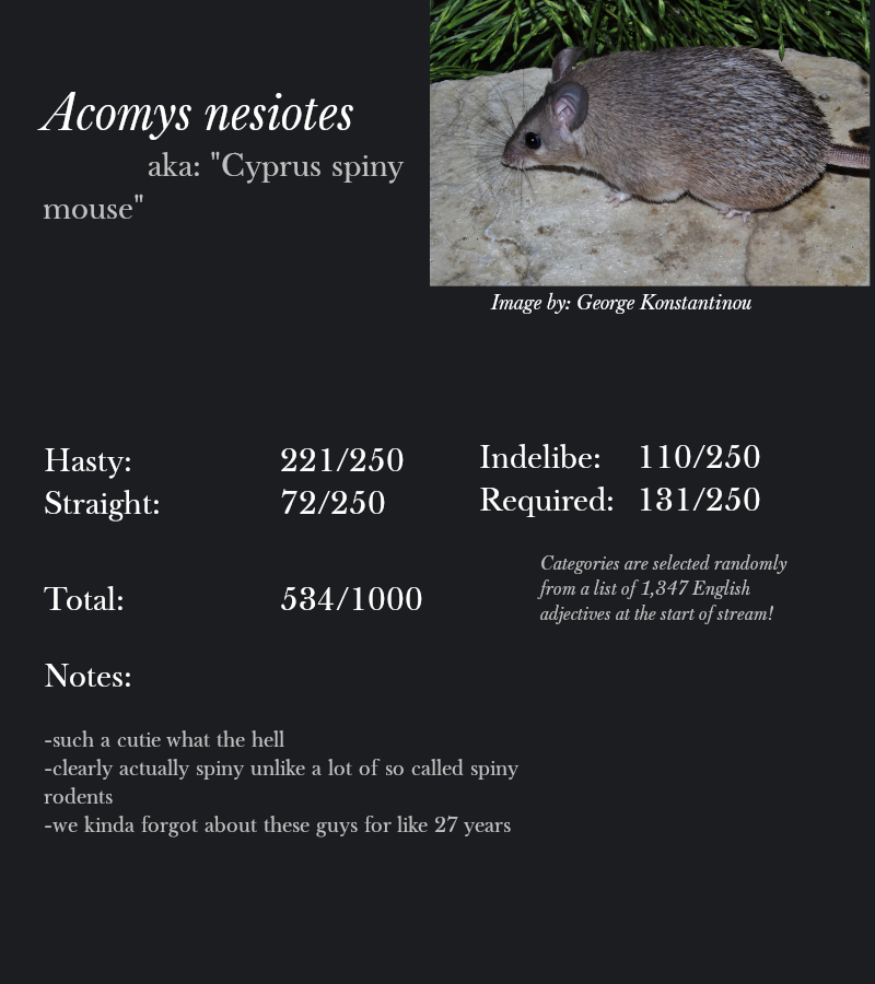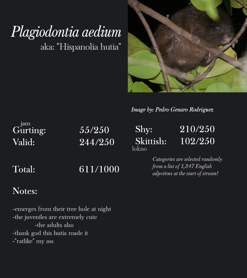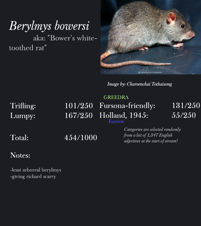 Microgale cowani aka: "Cowan's shrew tenrec" Unhealthy: 170/250 Normal: 40/250 Total: 560/1000 Notes: -mostly solitary -forelimbs suggest "digging behavior" -consumed by owls and other shrew tenrecs -cute buddy Image by: Sam Whitfield Heavenly: 194/250 Unruly: 156/250 Categories froma list are of 1 selected ,347 Eng randomly glish Categ froma ies list ar of select 1,347 ed rando English adjectives at the start of stream!