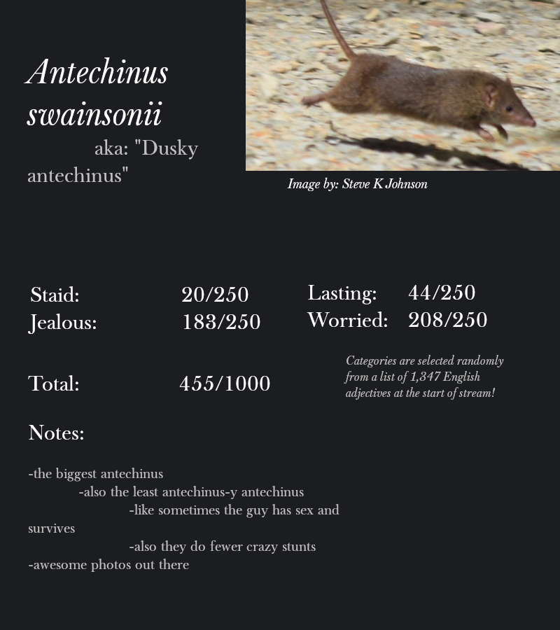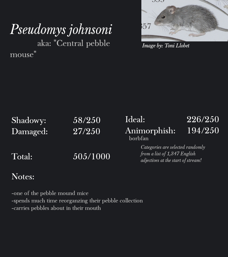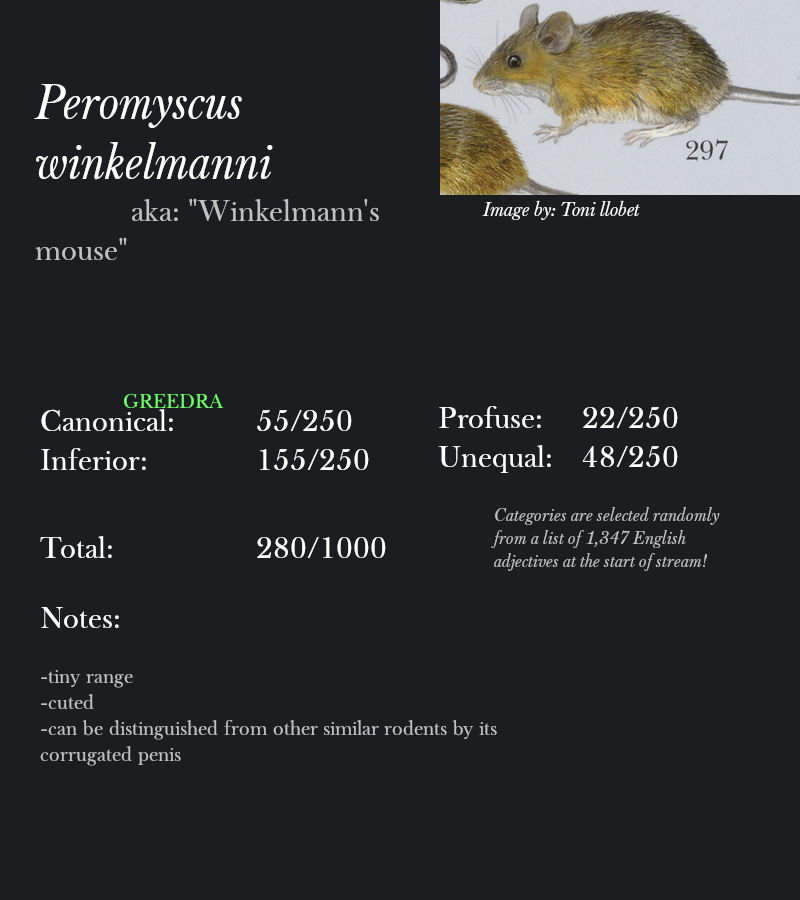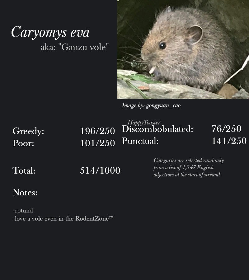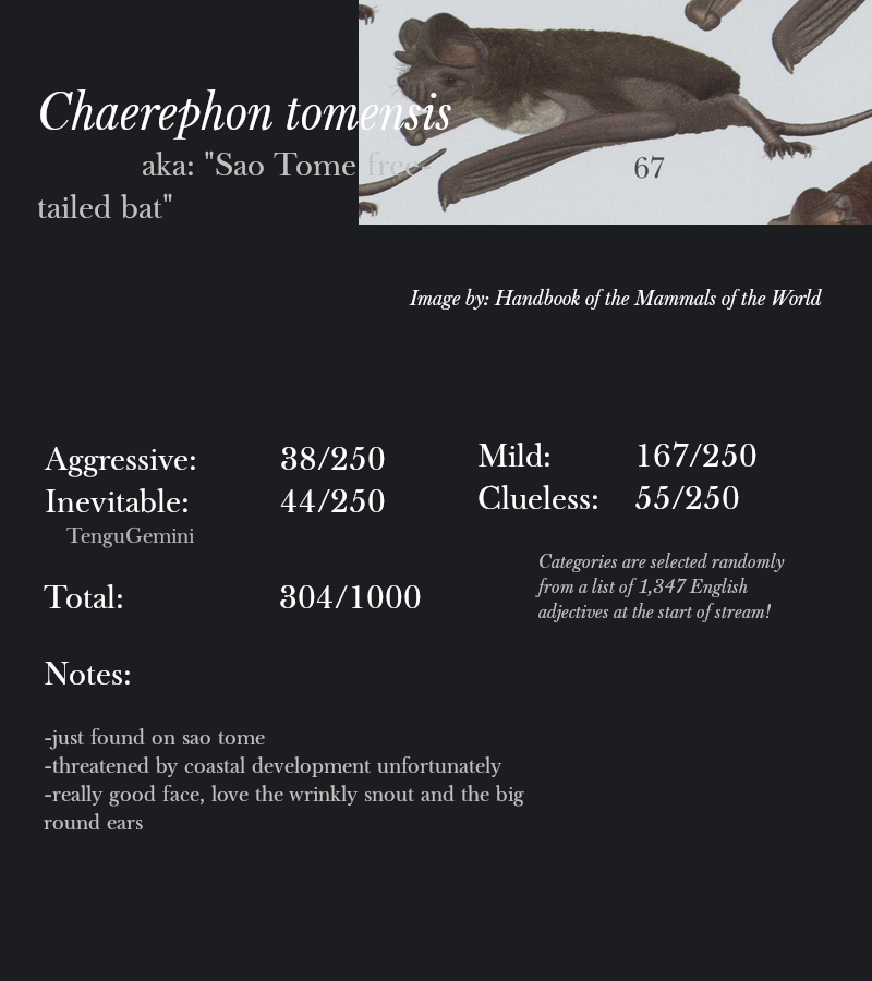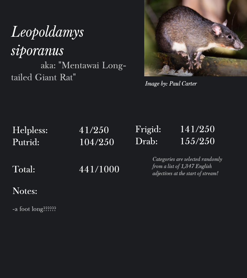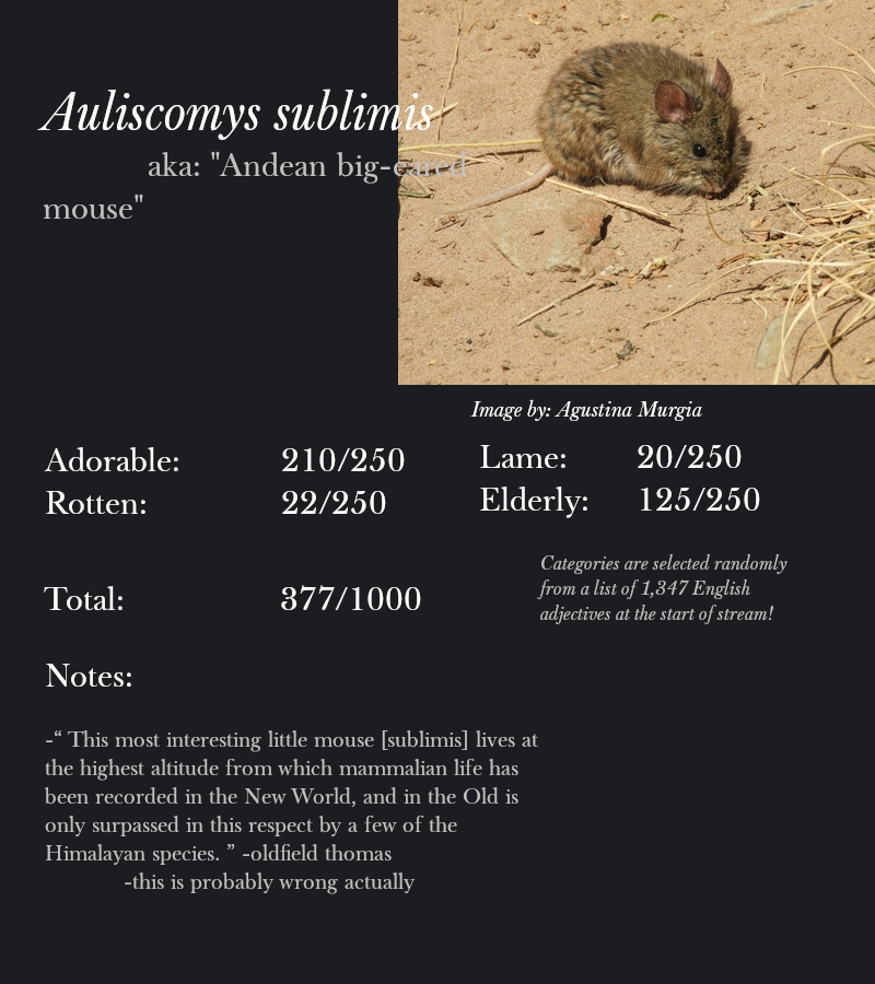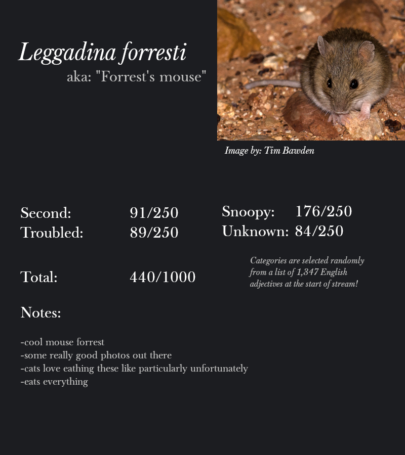 Microgale cowani aka: "Cowan's shrew tenrec" Unhealthy: 170/250 Normal: 40/250 Total: 560/1000 Notes: -mostly solitary -forelimbs suggest "digging behavior" -consumed by owls and other shrew tenrecs -cute buddy Image by: Sam Whitfield Heavenly: 194/250 Unruly: 156/250 Categories froma list are of 1 selected ,347 Eng randomly glish Categ froma ies list ar of select 1,347 ed rando English adjectives at the start of stream!