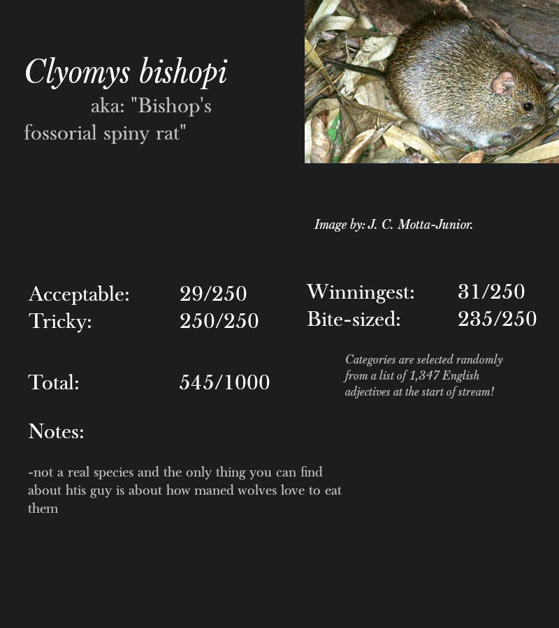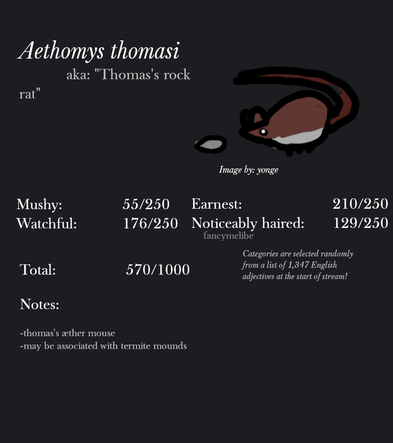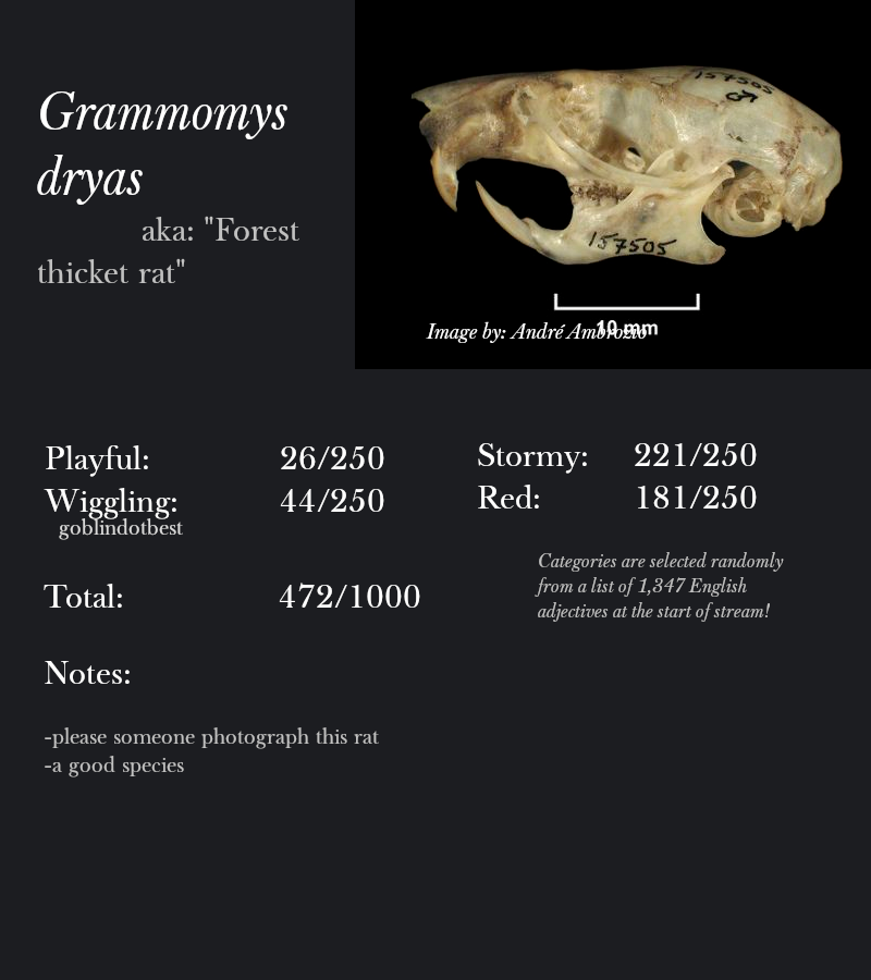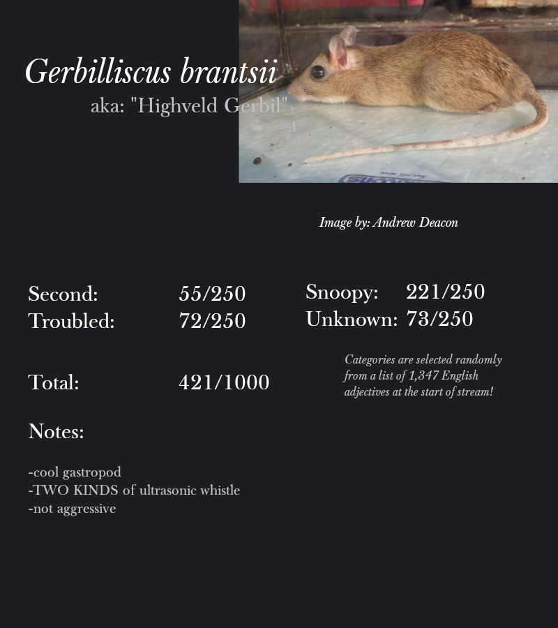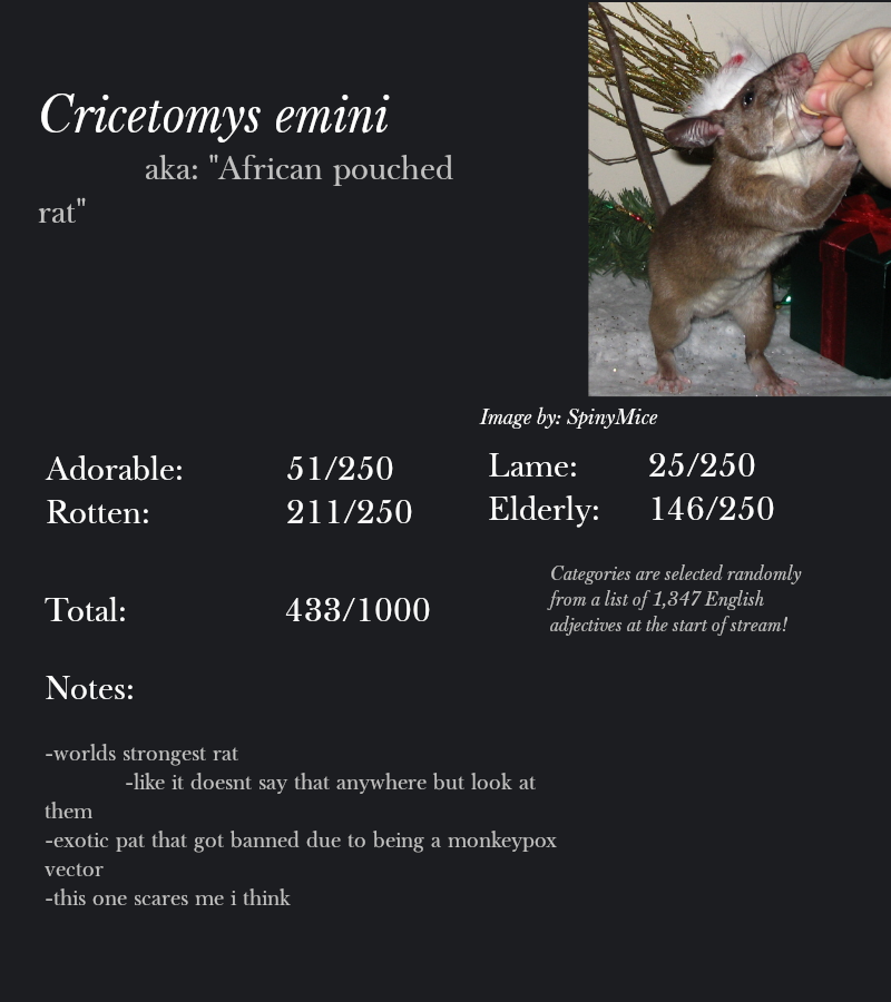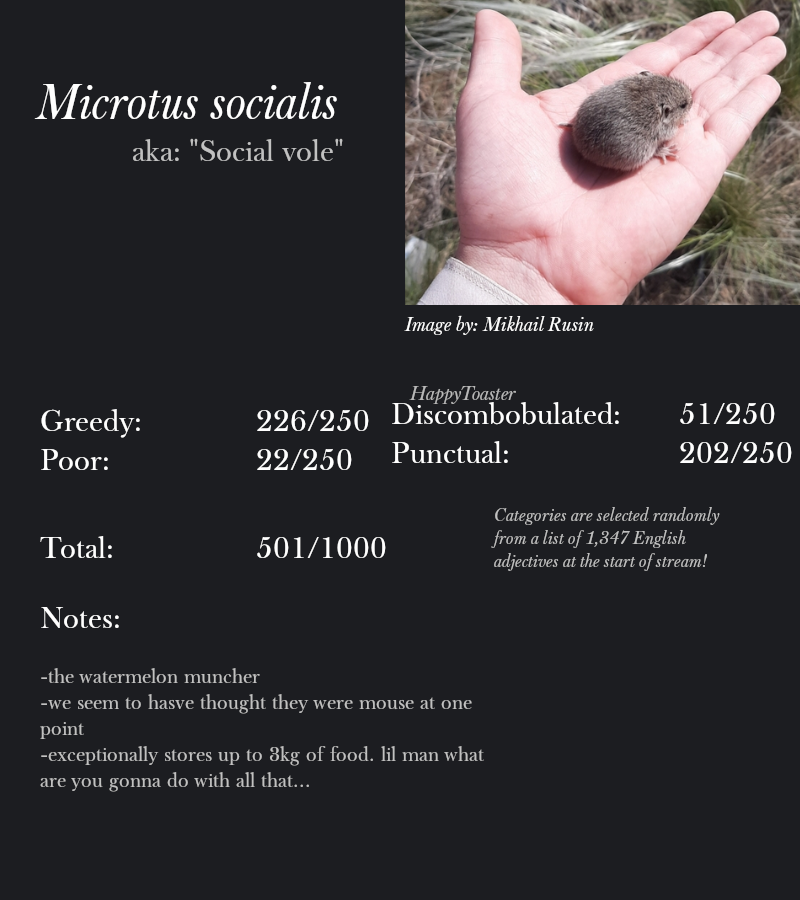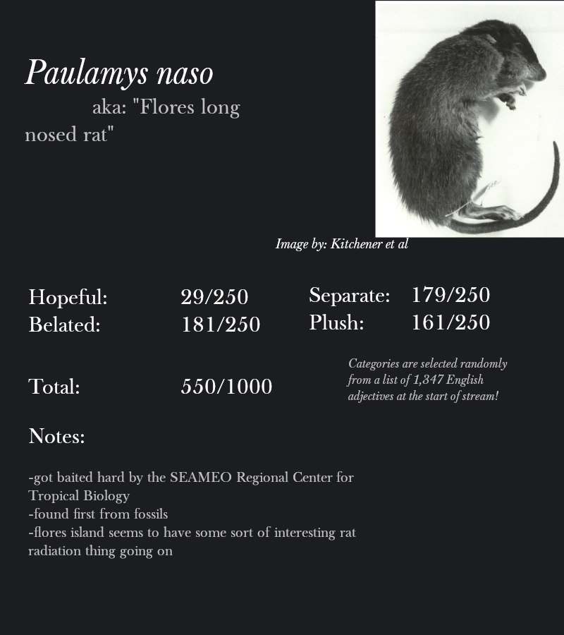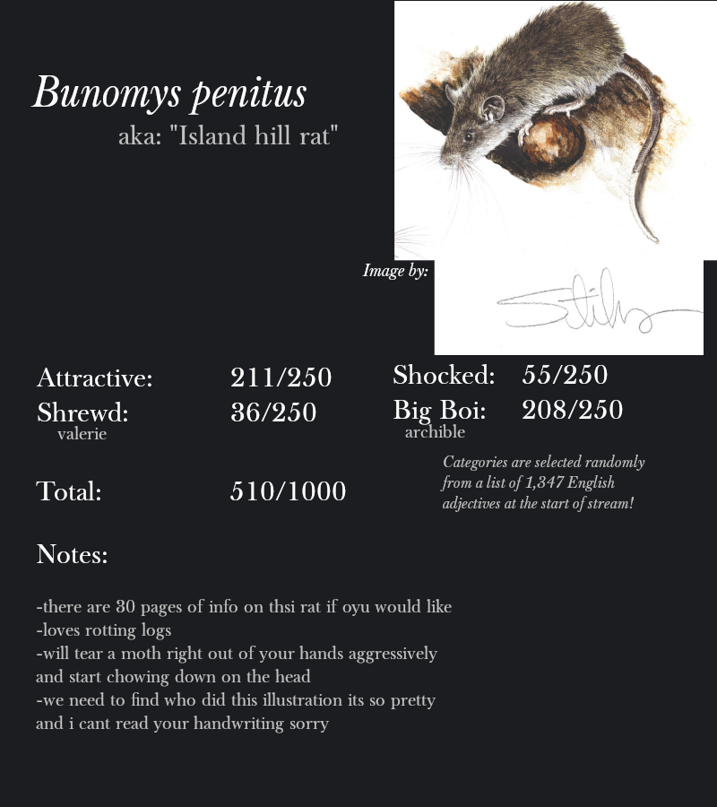 Microgale cowani aka: "Cowan's shrew tenrec" Unhealthy: 170/250 Normal: 40/250 Total: 560/1000 Notes: -mostly solitary -forelimbs suggest "digging behavior" -consumed by owls and other shrew tenrecs -cute buddy Image by: Sam Whitfield Heavenly: 194/250 Unruly: 156/250 Categories froma list are of 1 selected ,347 Eng randomly glish Categ froma ies list ar of select 1,347 ed rando English adjectives at the start of stream!