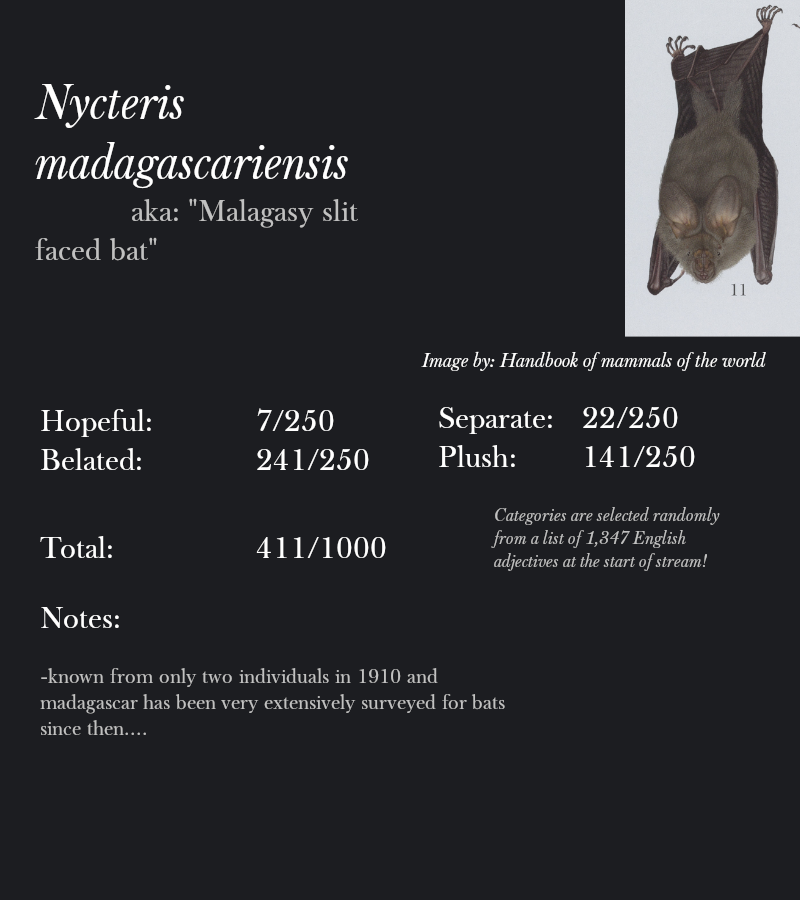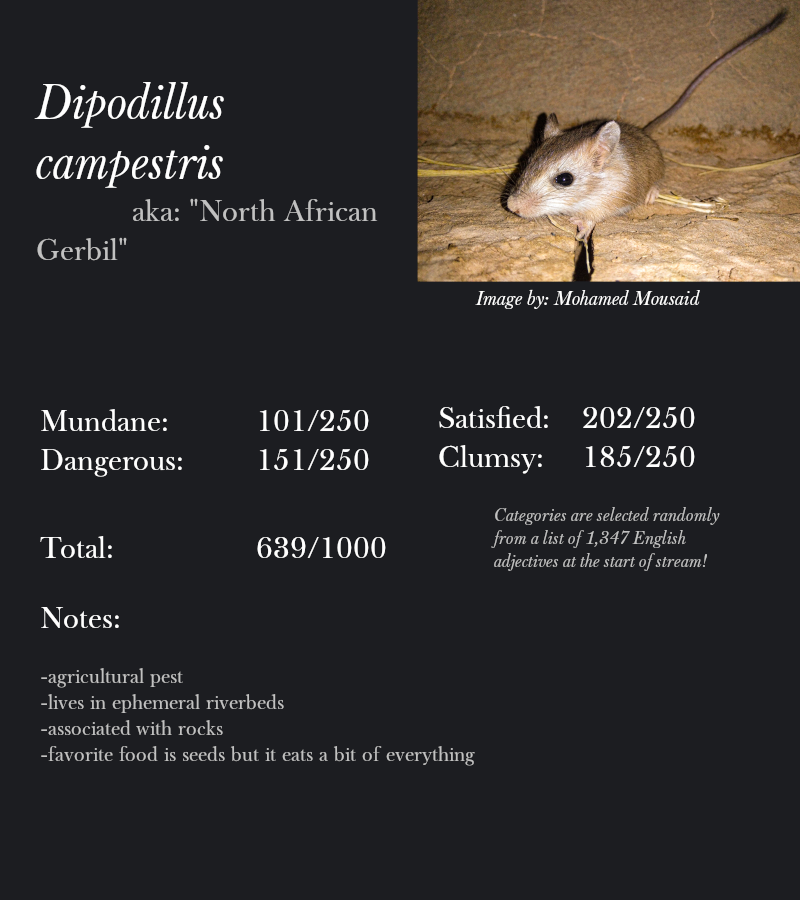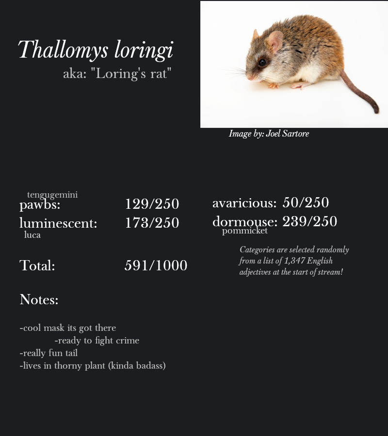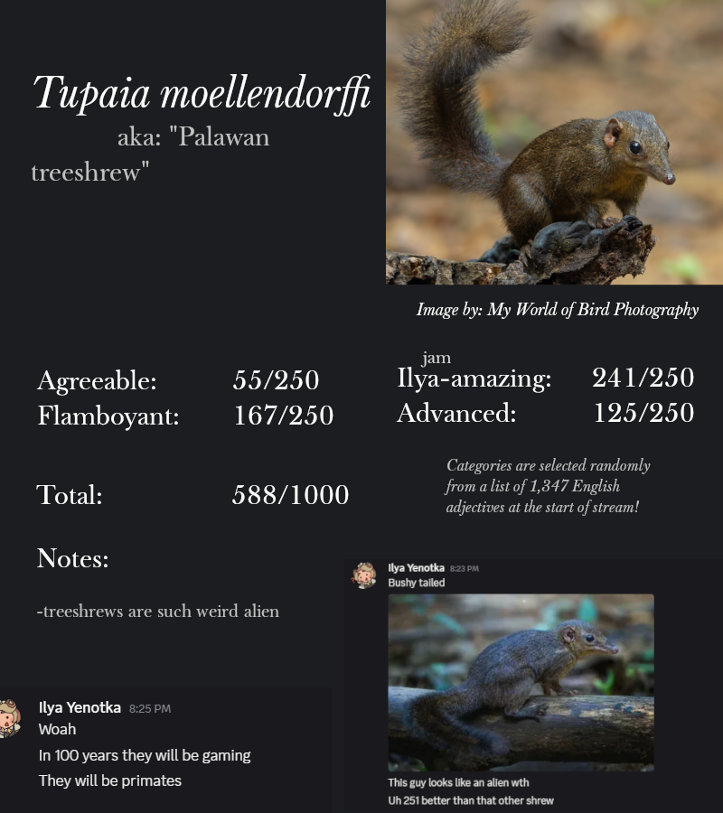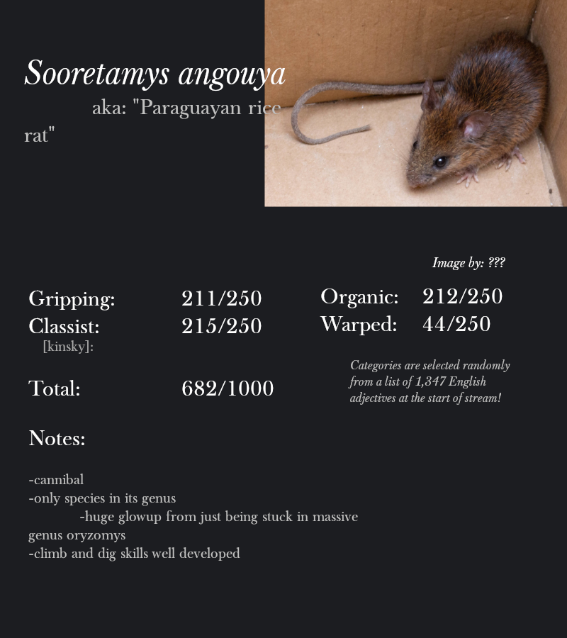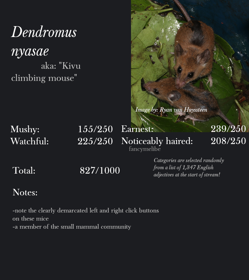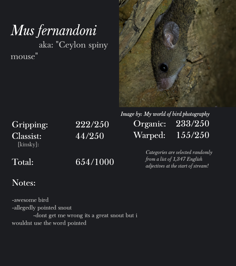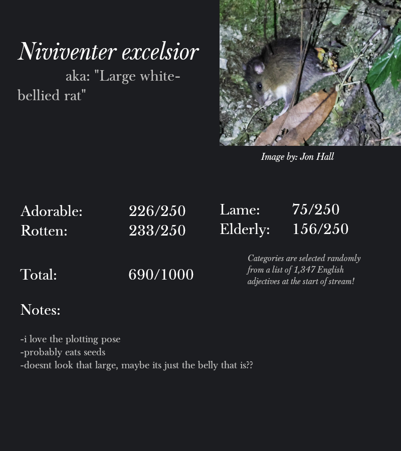 Microgale cowani aka: "Cowan's shrew tenrec" Unhealthy: 170/250 Normal: 40/250 Total: 560/1000 Notes: -mostly solitary -forelimbs suggest "digging behavior" -consumed by owls and other shrew tenrecs -cute buddy Image by: Sam Whitfield Heavenly: 194/250 Unruly: 156/250 Categories froma list are of 1 selected ,347 Eng randomly glish Categ froma ies list ar of select 1,347 ed rando English adjectives at the start of stream!