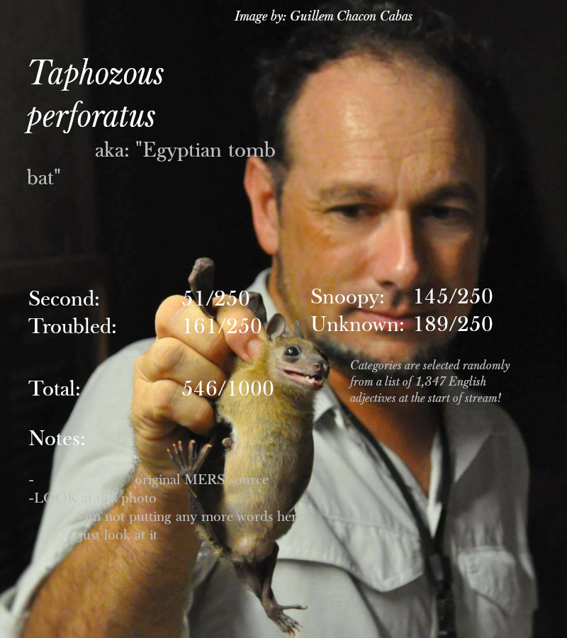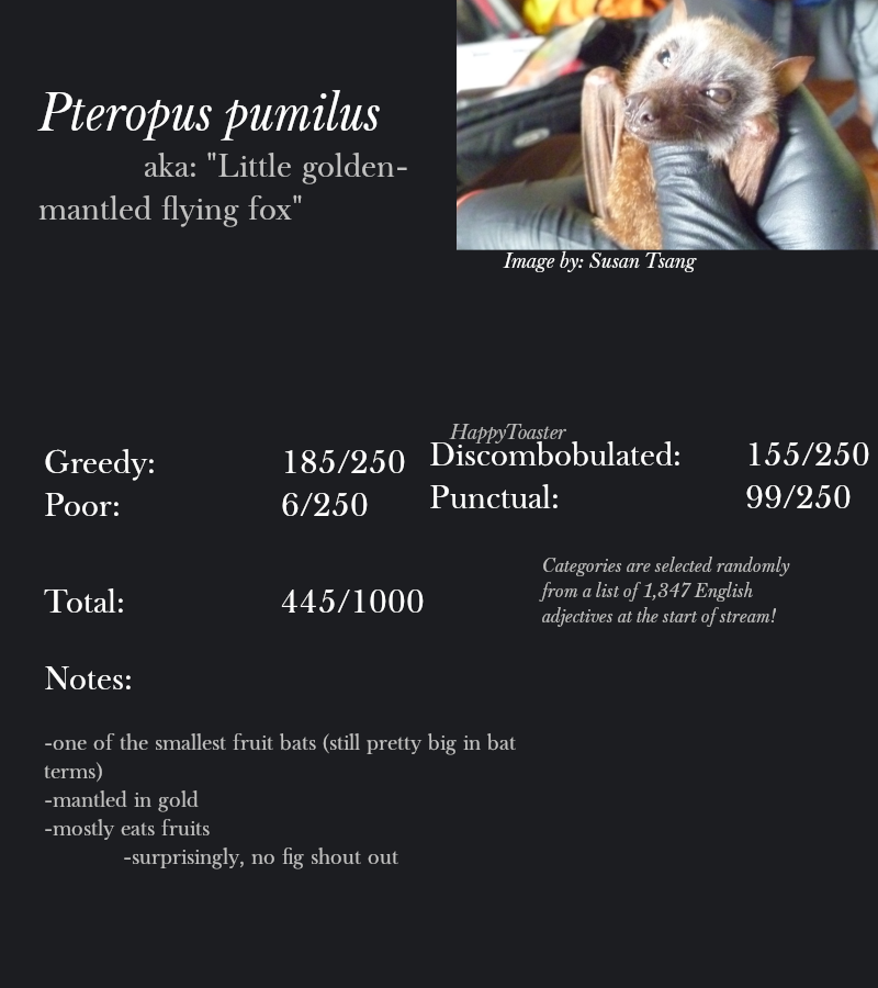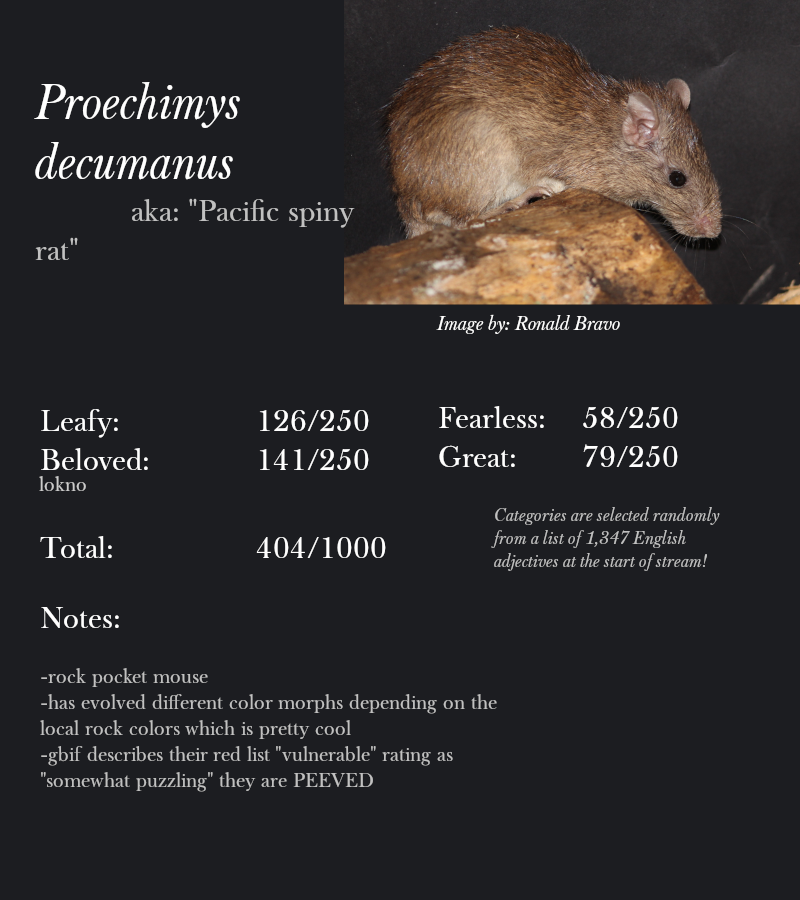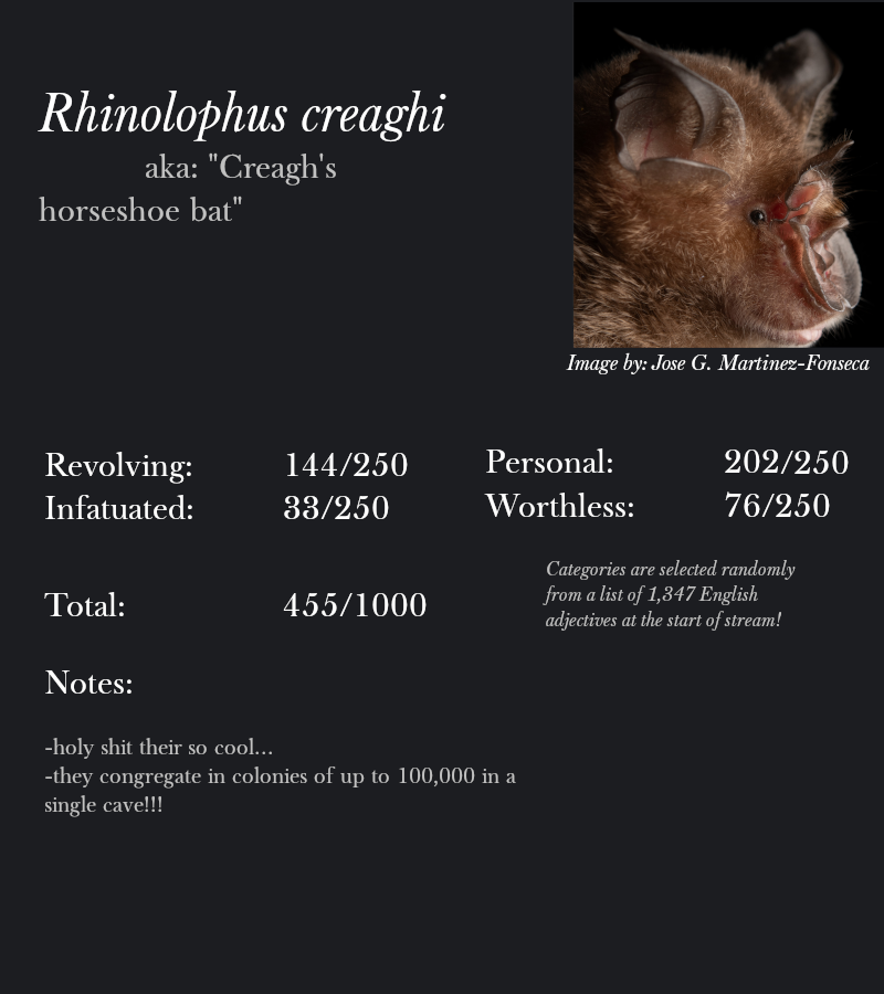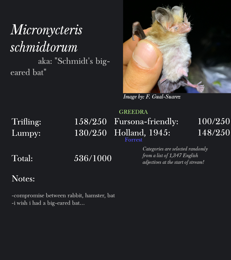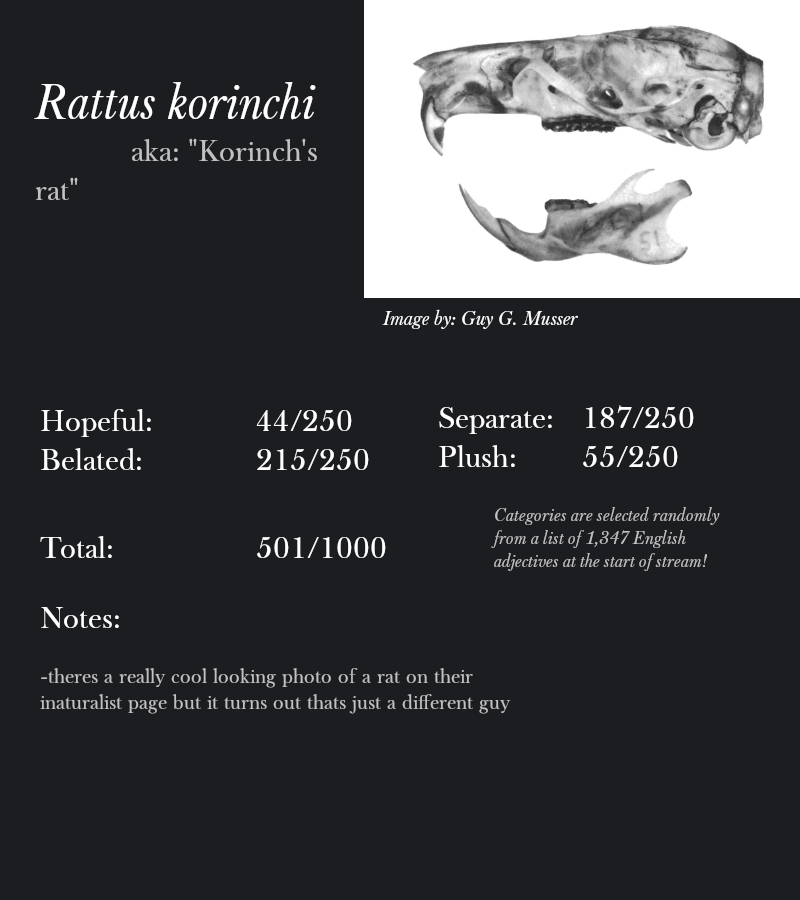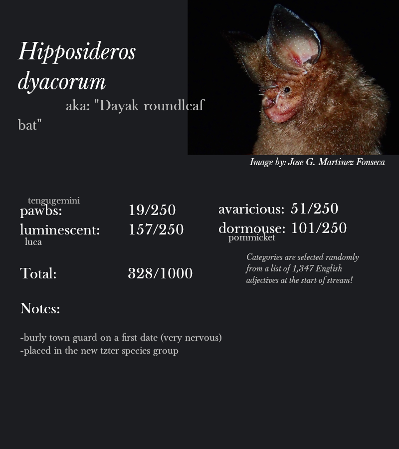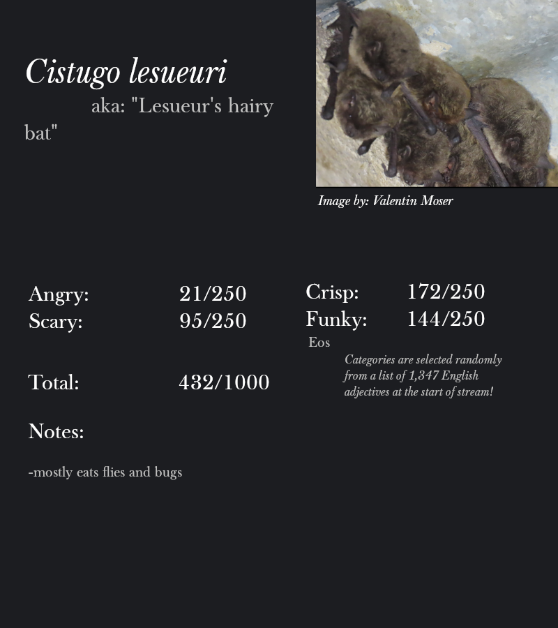 Microgale cowani aka: "Cowan's shrew tenrec" Unhealthy: 170/250 Normal: 40/250 Total: 560/1000 Notes: -mostly solitary -forelimbs suggest "digging behavior" -consumed by owls and other shrew tenrecs -cute buddy Image by: Sam Whitfield Heavenly: 194/250 Unruly: 156/250 Categories froma list are of 1 selected ,347 Eng randomly glish Categ froma ies list ar of select 1,347 ed rando English adjectives at the start of stream!