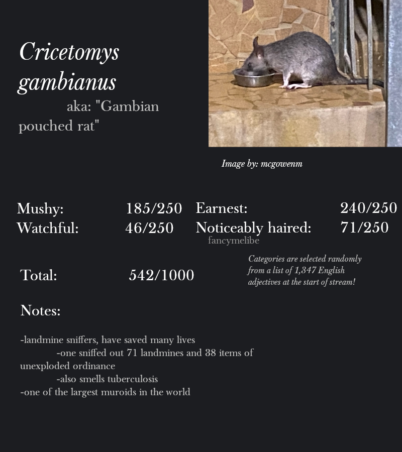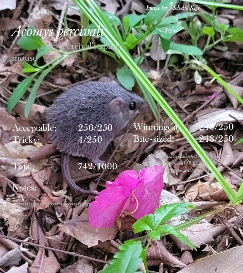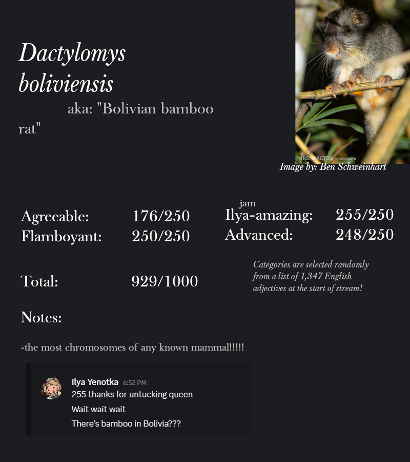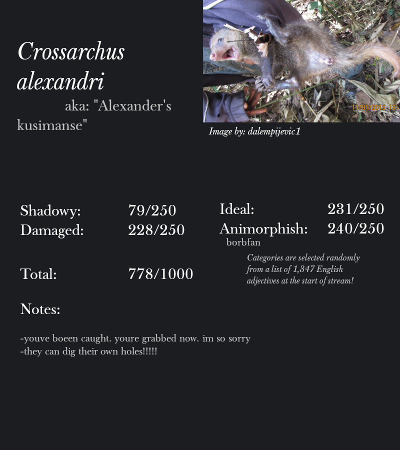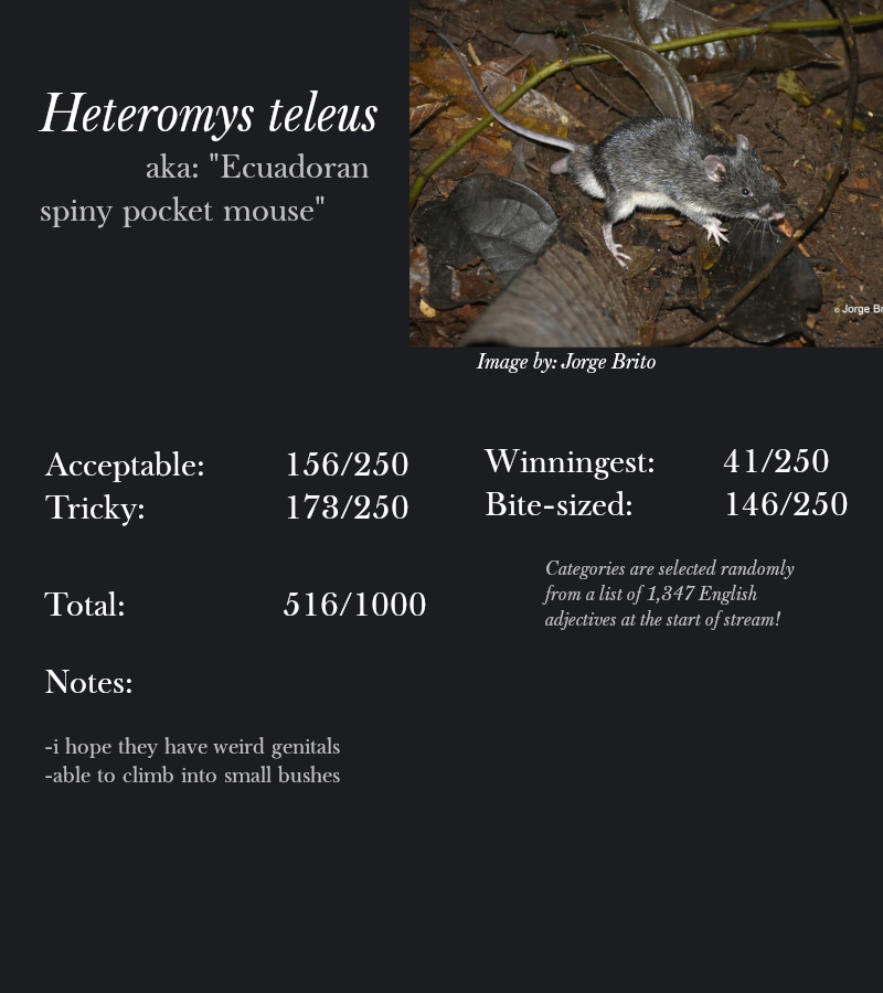 Total: 3828/1000 Categories are selected randoml ES Notes: -deserves a better bucket -tenrecs are crazy -they g -- w have ild a tenrec of every mammal or -t something hey -- have wild -yet another nearshrew--we are being taunted