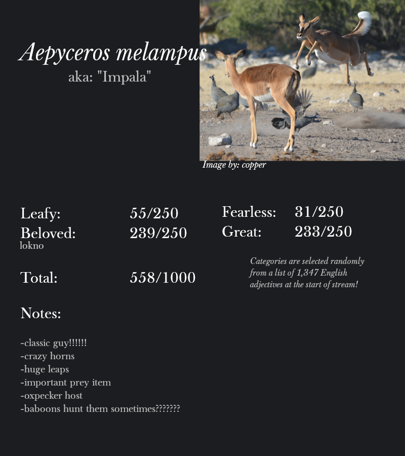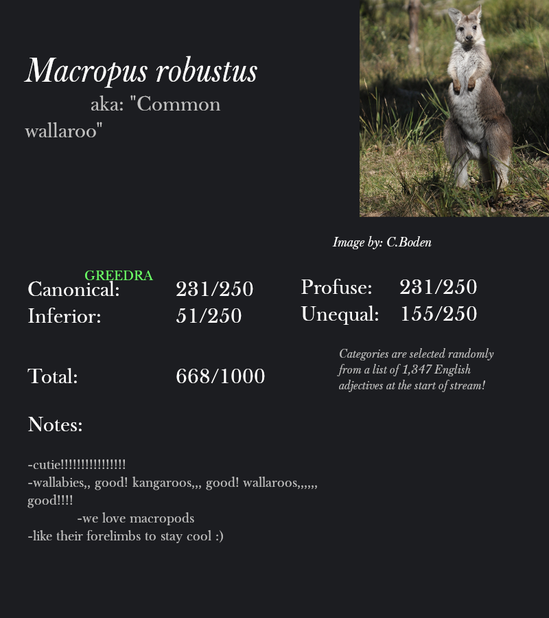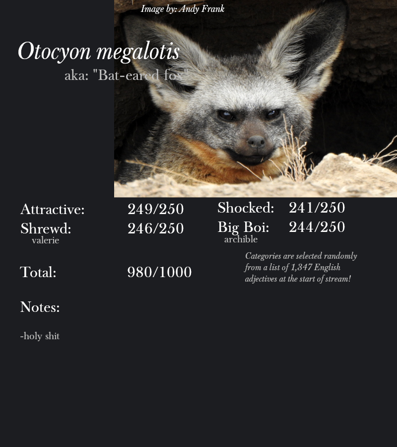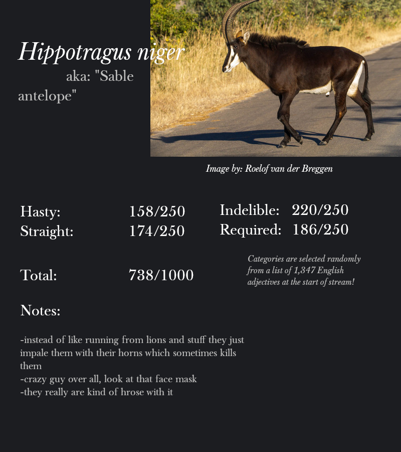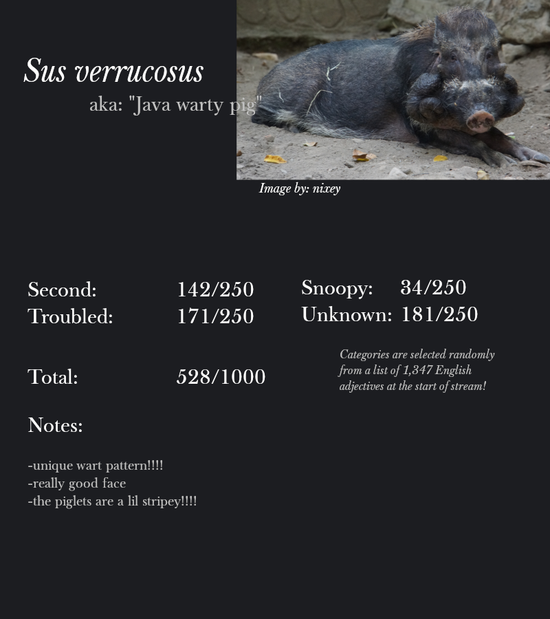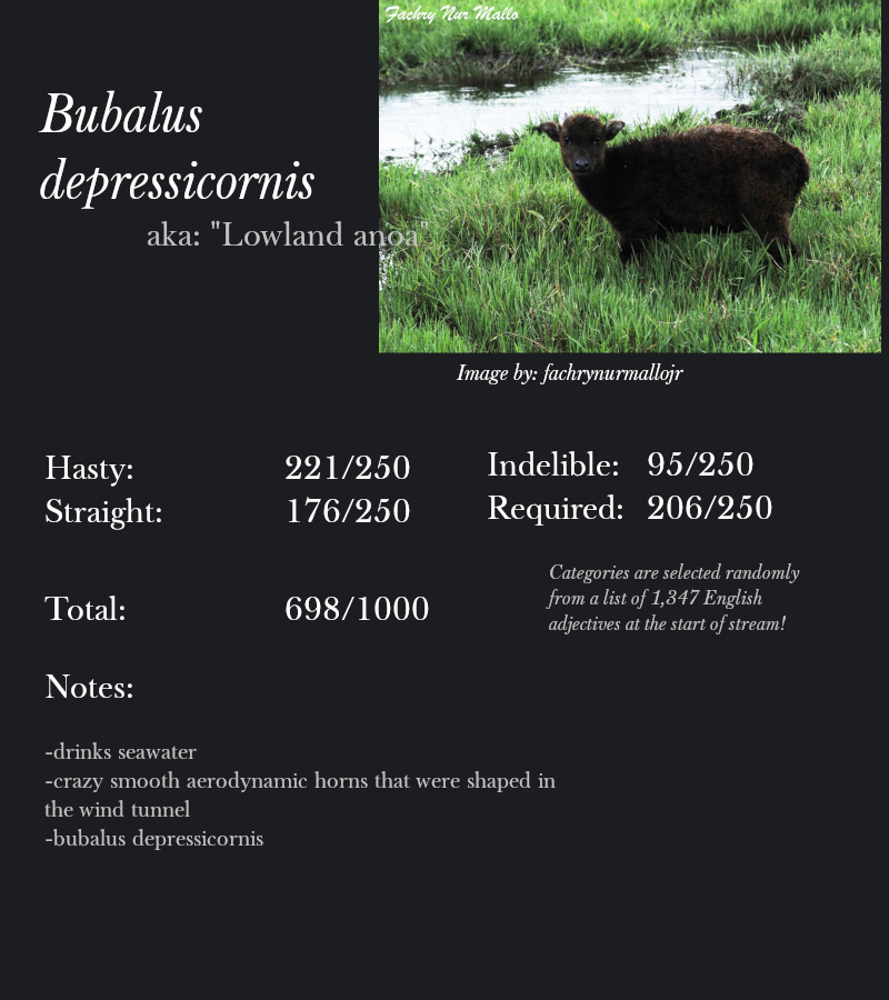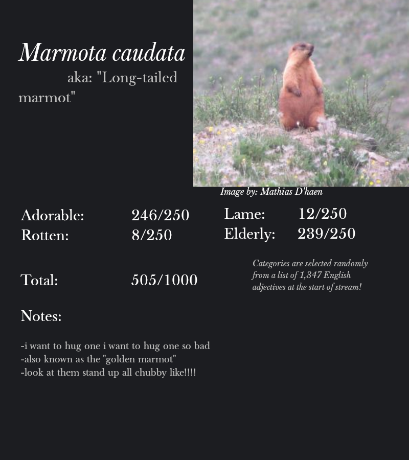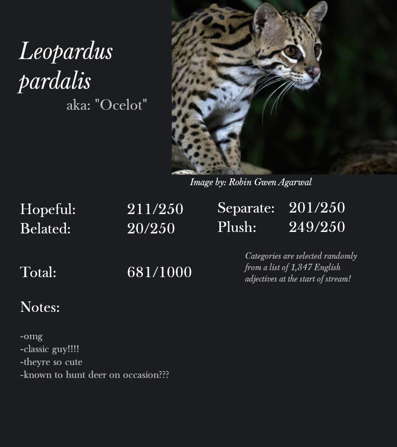Categories are selected randomly from a list of 1,347 English adjectives at the start of stream! Ultimate: 220/250 Wavy: 180/250 Image by: Royle Safaris Notes: