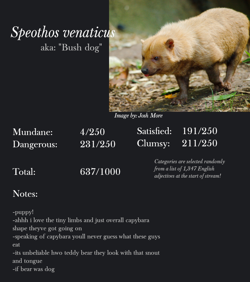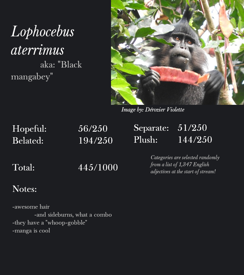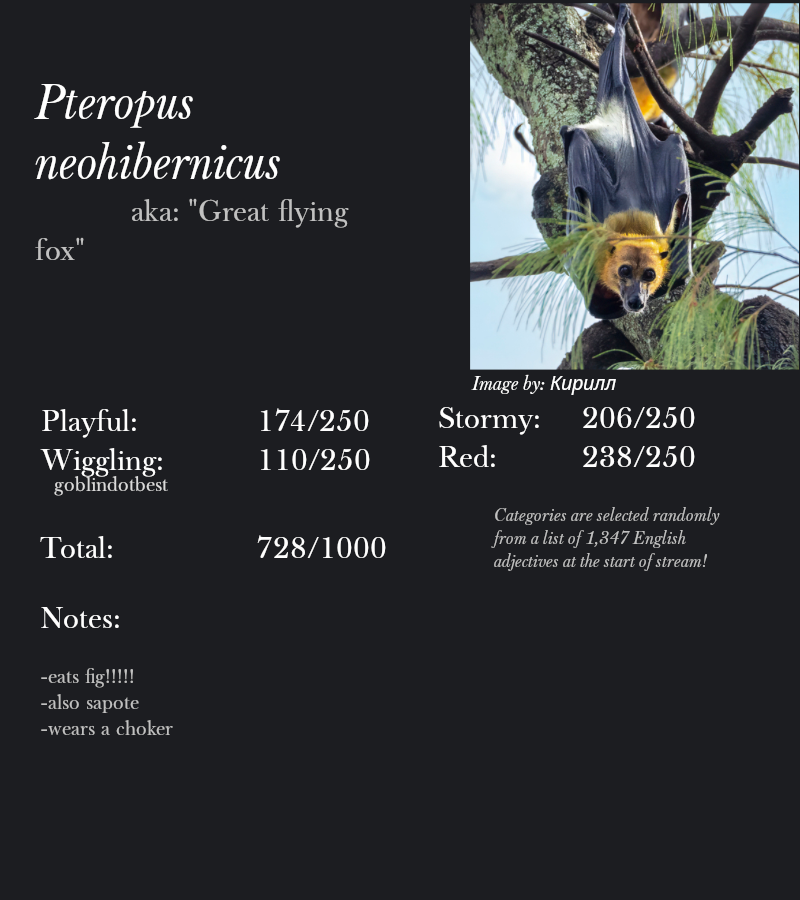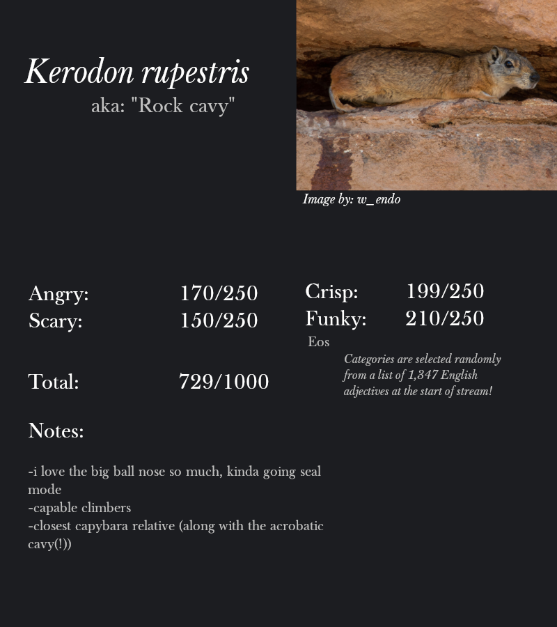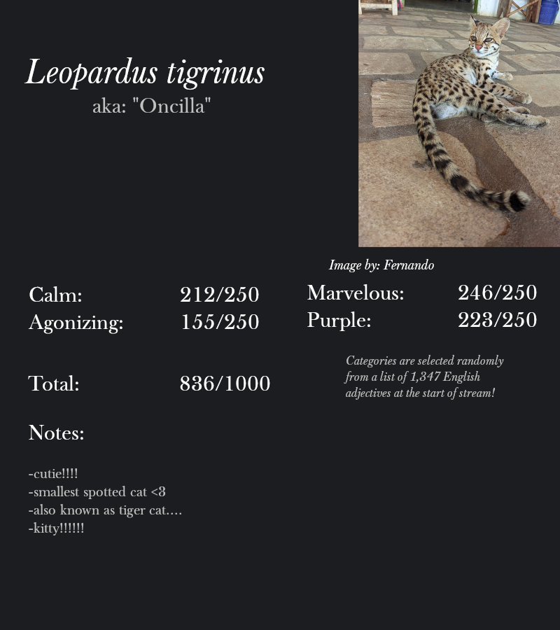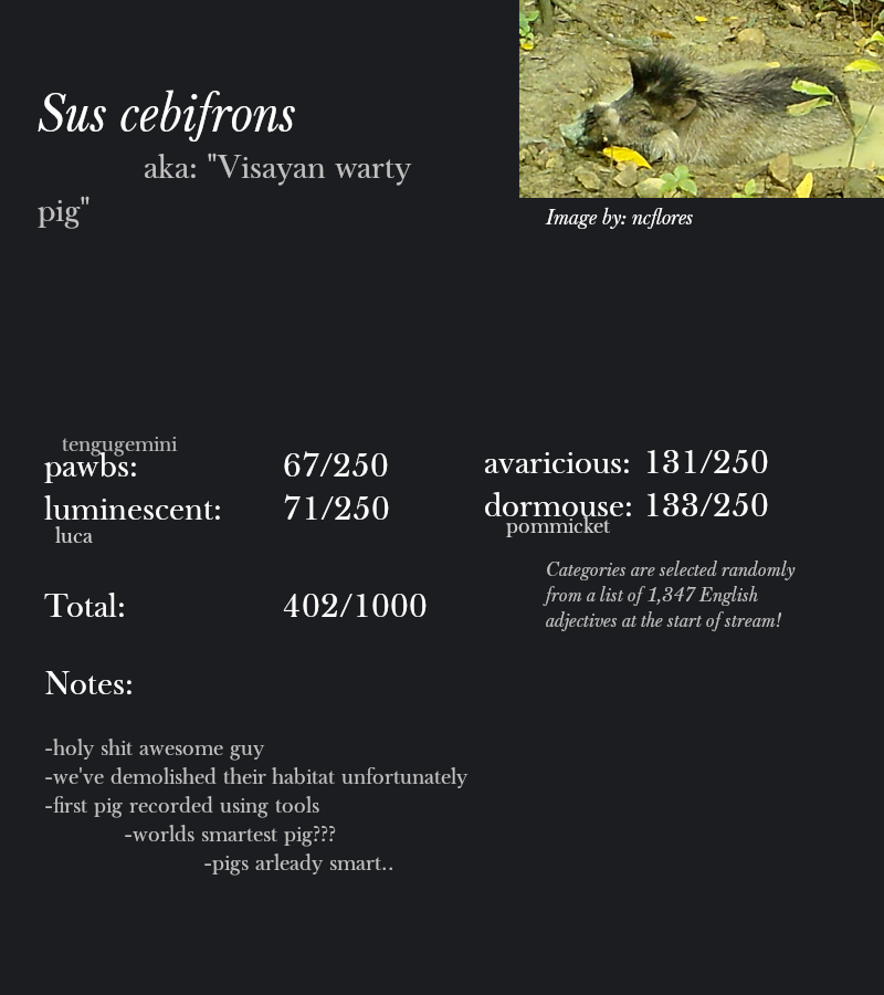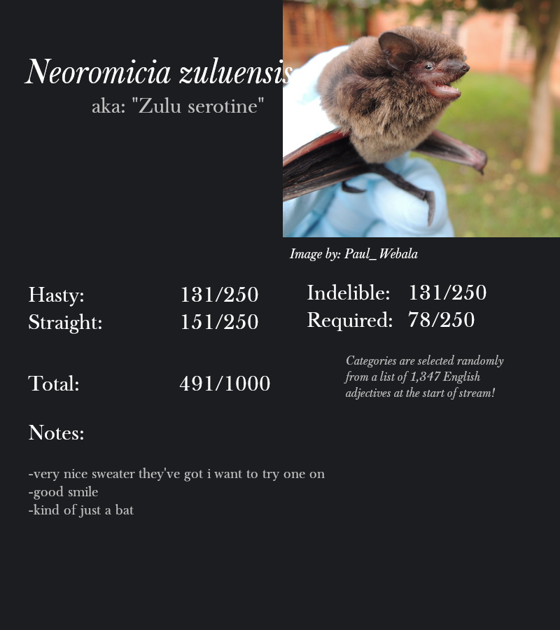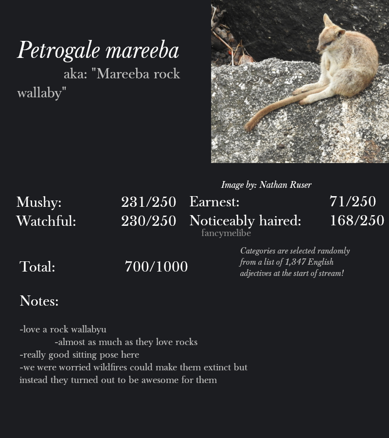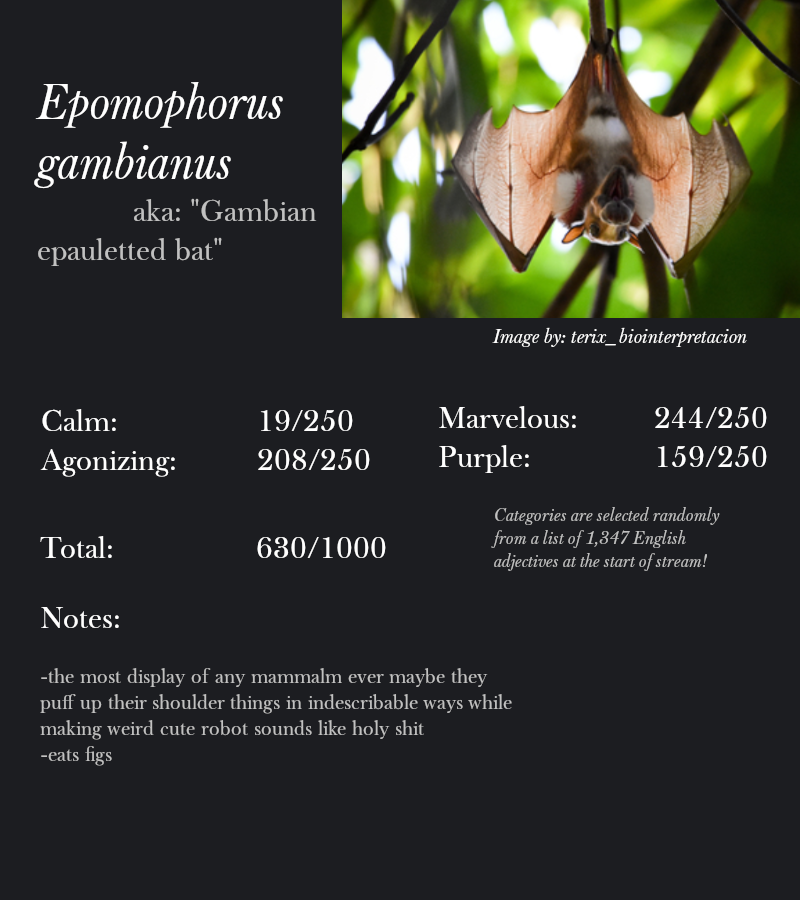 Categories are selected randomly from a list of 1,347 English adjectives at the start of stream! Ultimate: 220/250 Wavy: 180/250 Image by: Royle Safaris Notes: