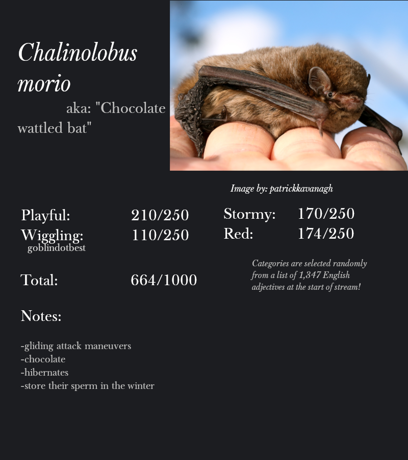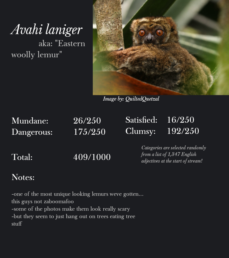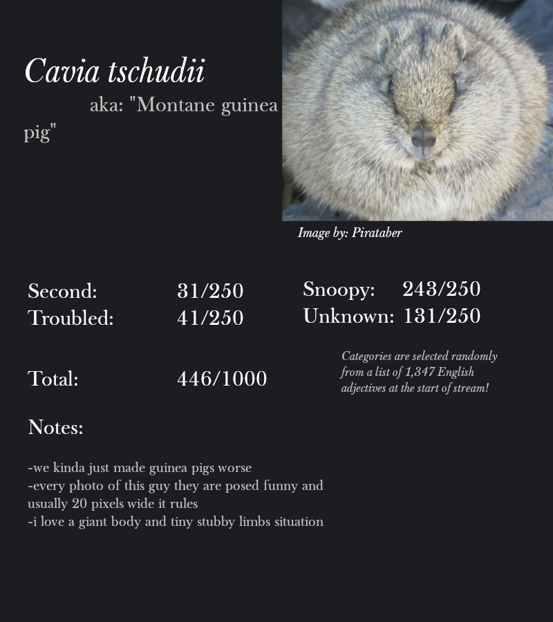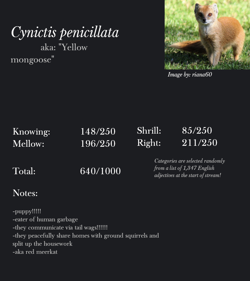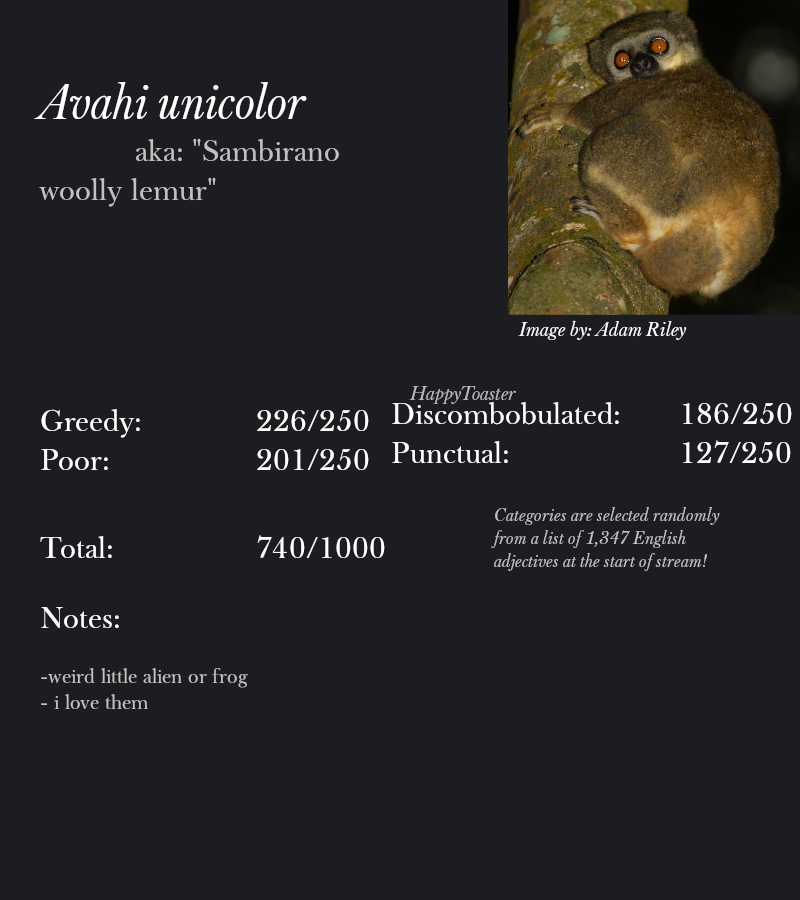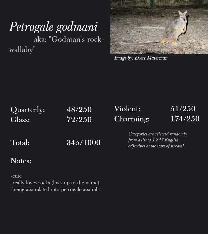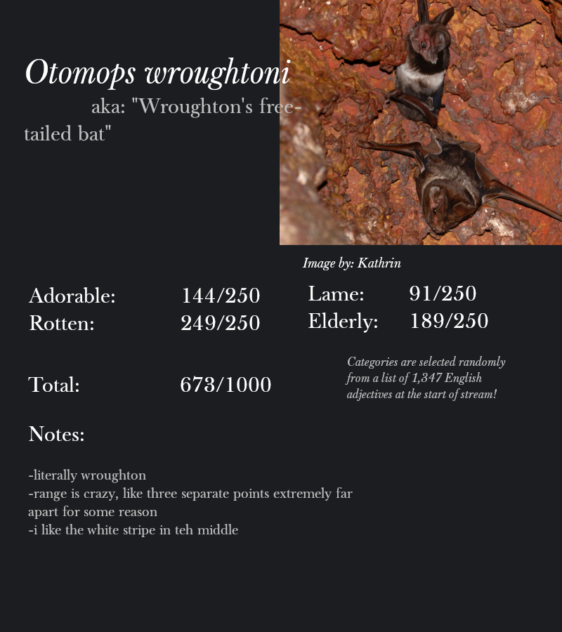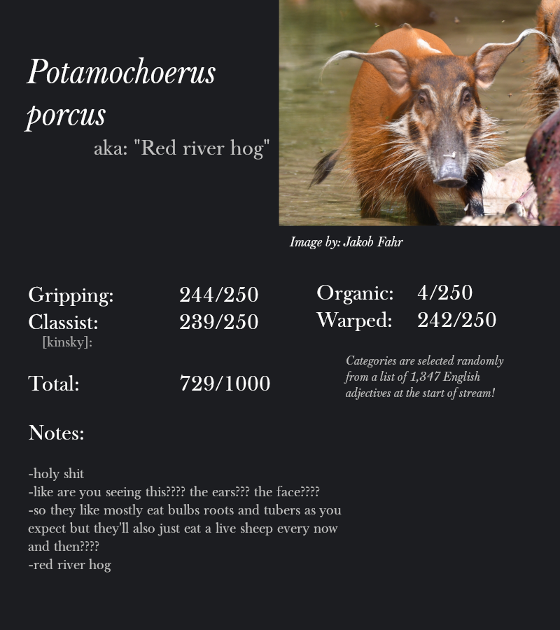 Categories are selected randomly from a list of 1,347 English adjectives at the start of stream! Ultimate: 220/250 Wavy: 180/250 Image by: Royle Safaris Notes: