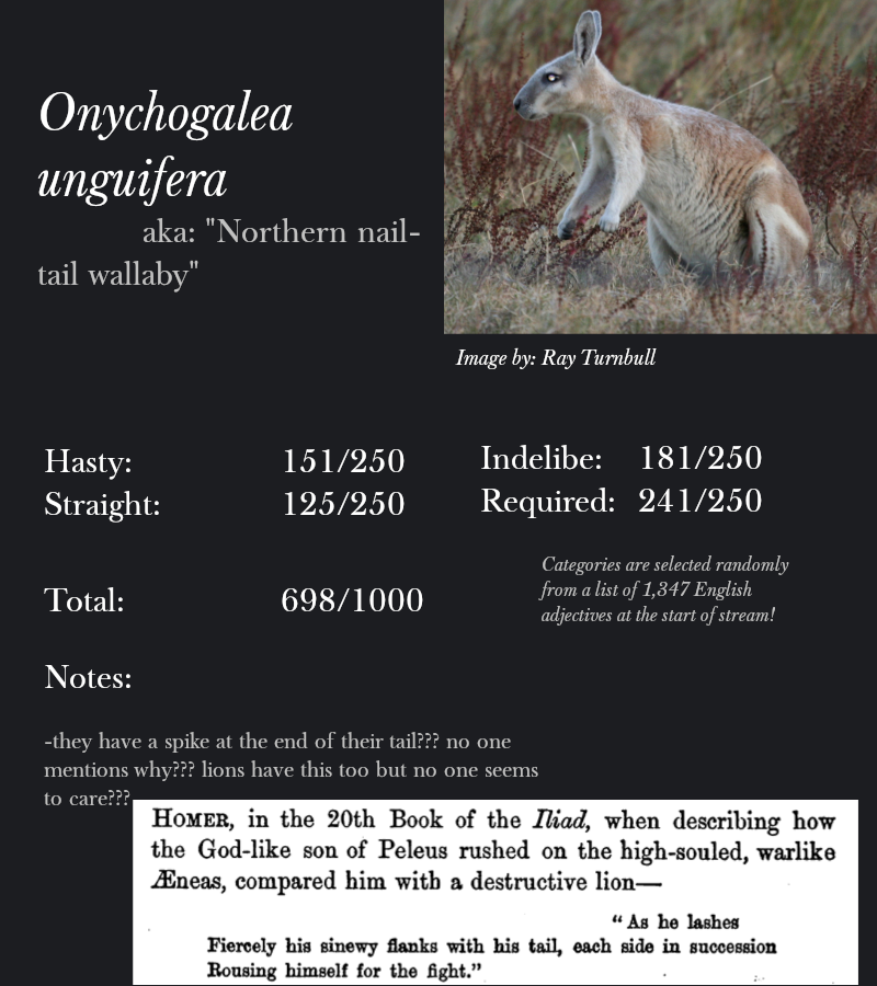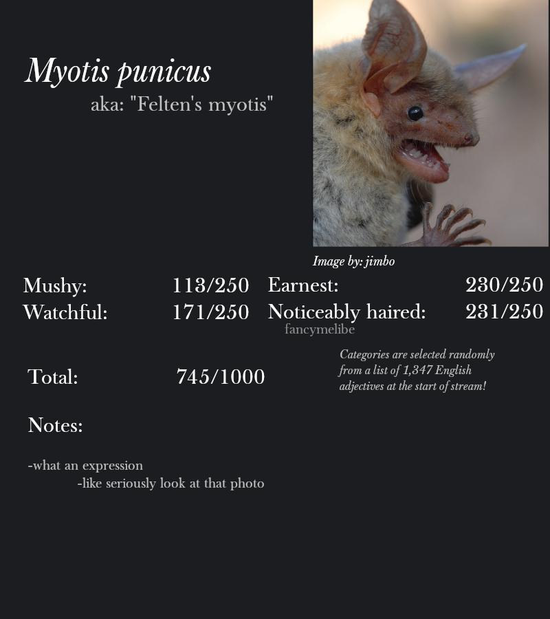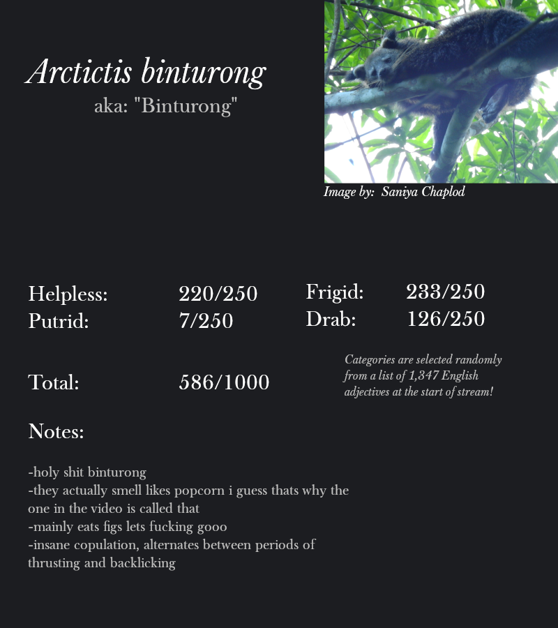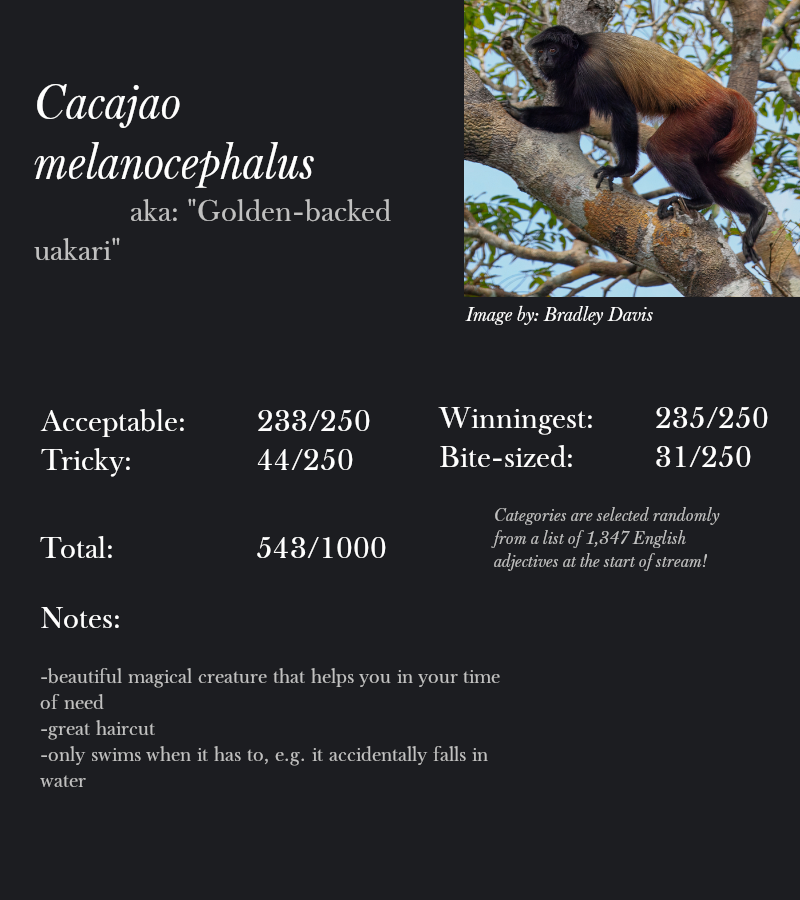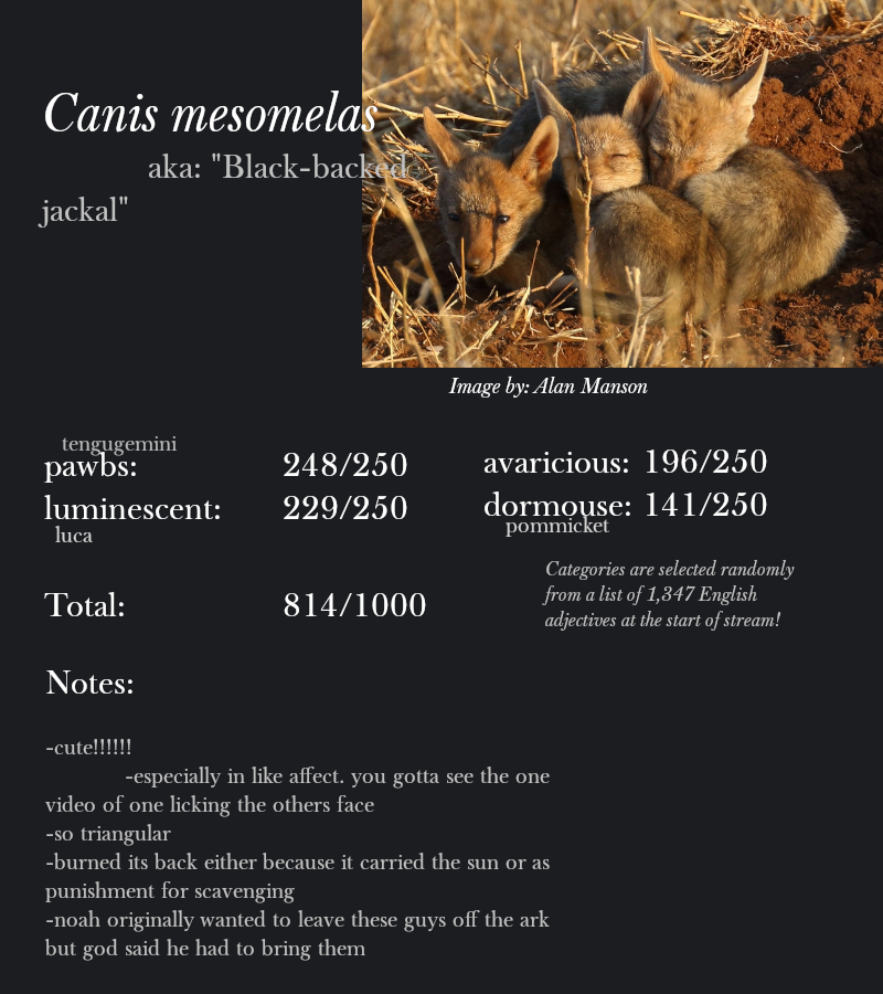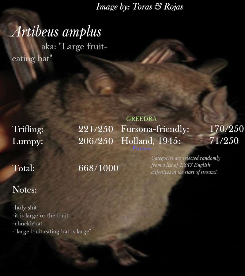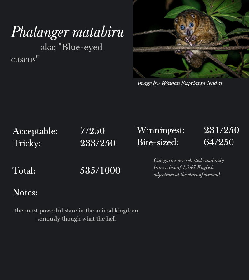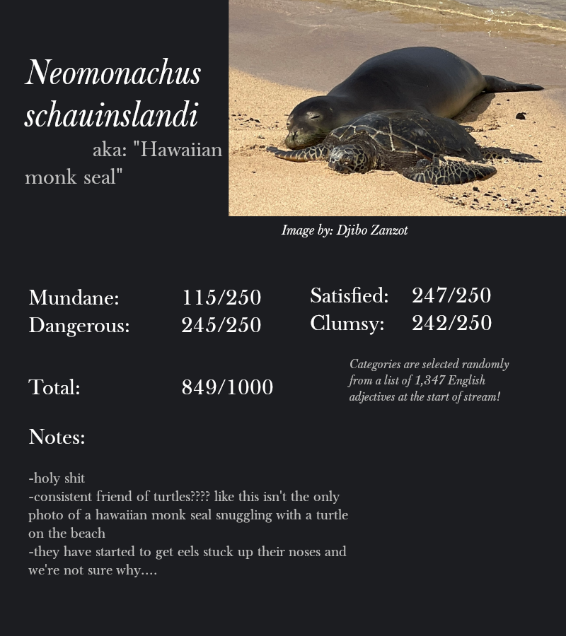 Categories are selected randomly from a list of 1,347 English adjectives at the start of stream! Ultimate: 220/250 Wavy: 180/250 Image by: Royle Safaris Notes: