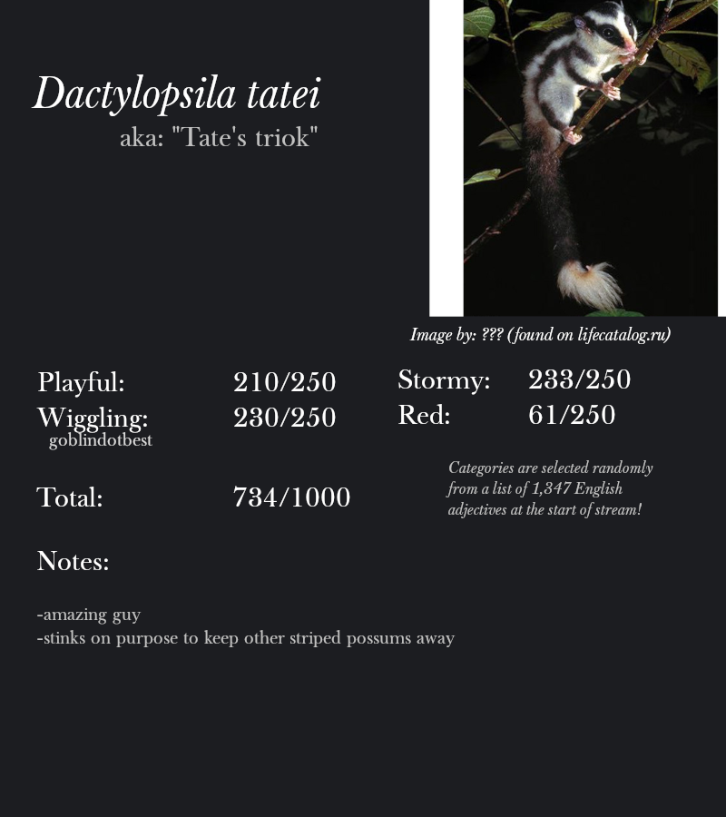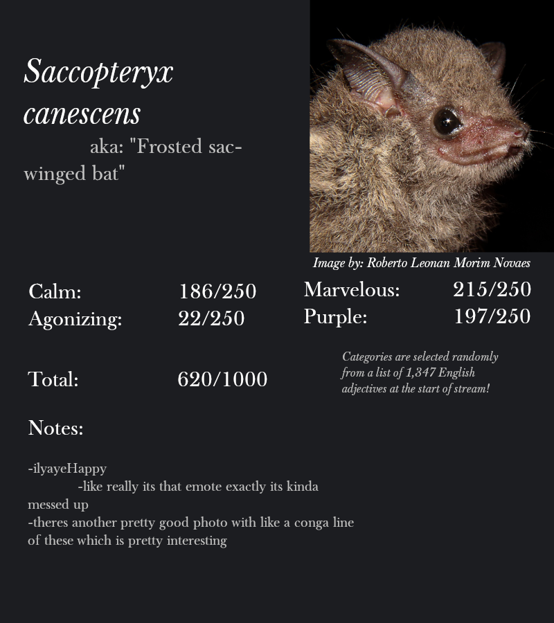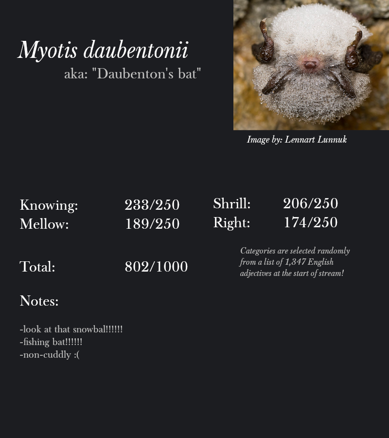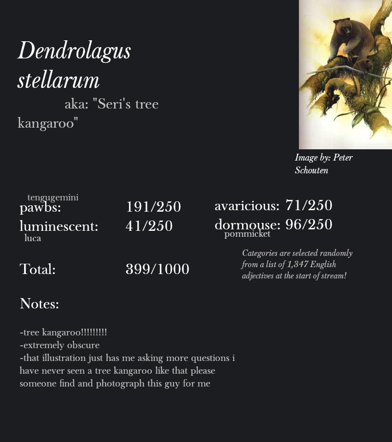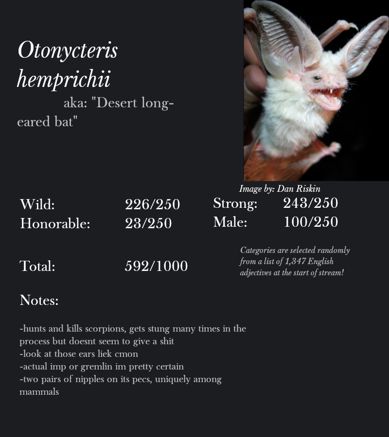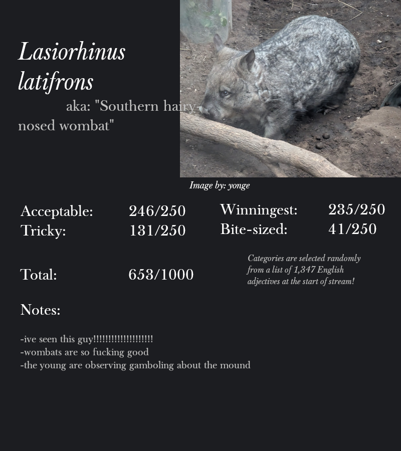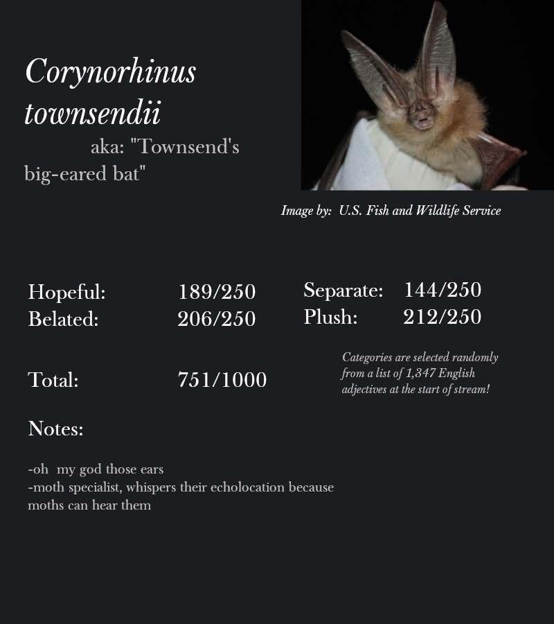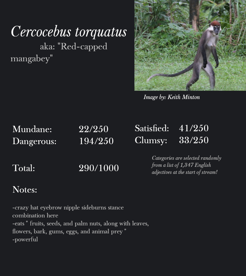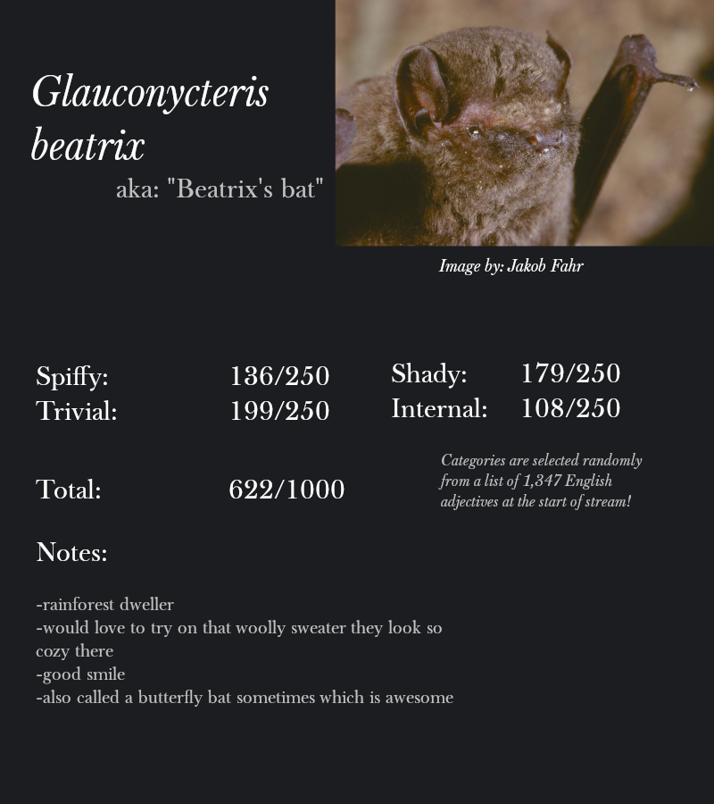 Categories are selected randomly from a list of 1,347 English adjectives at the start of stream! Ultimate: 220/250 Wavy: 180/250 Image by: Royle Safaris Notes: