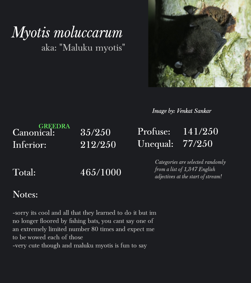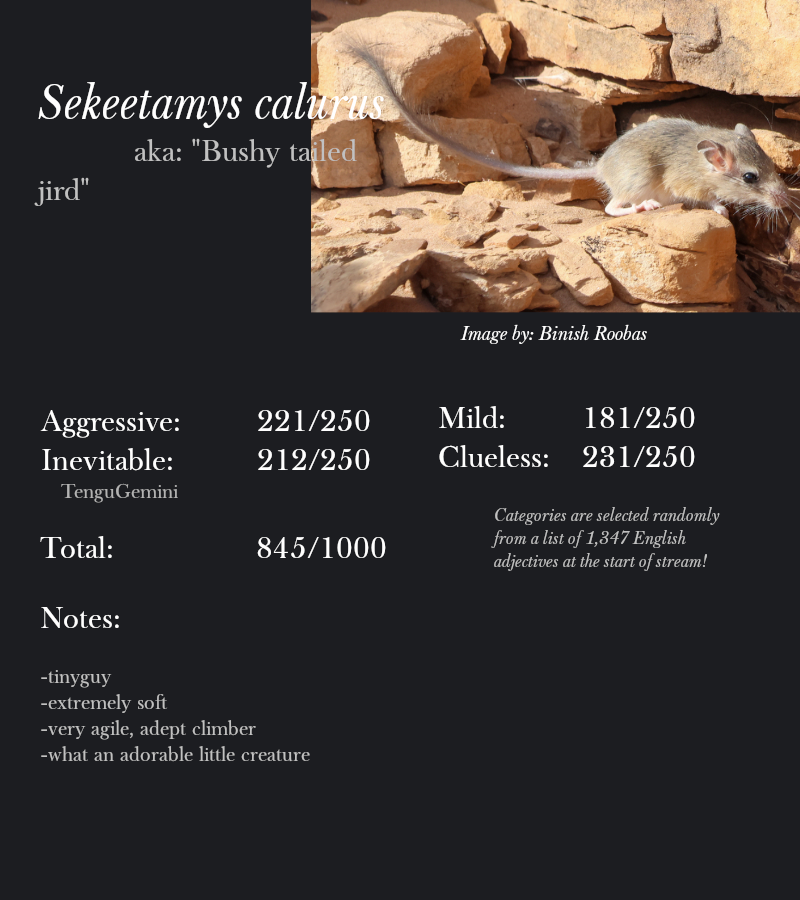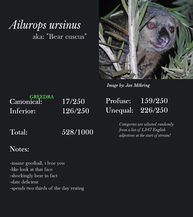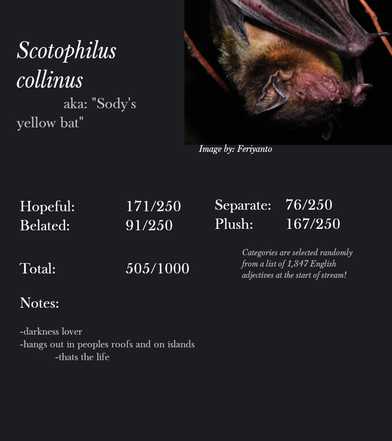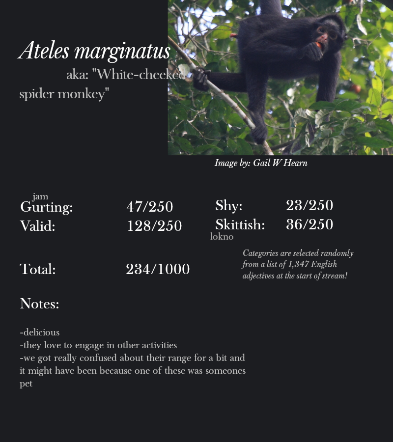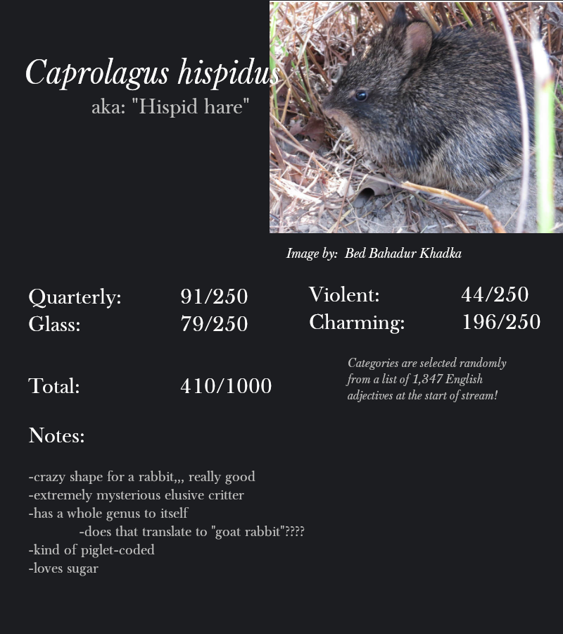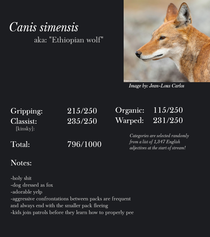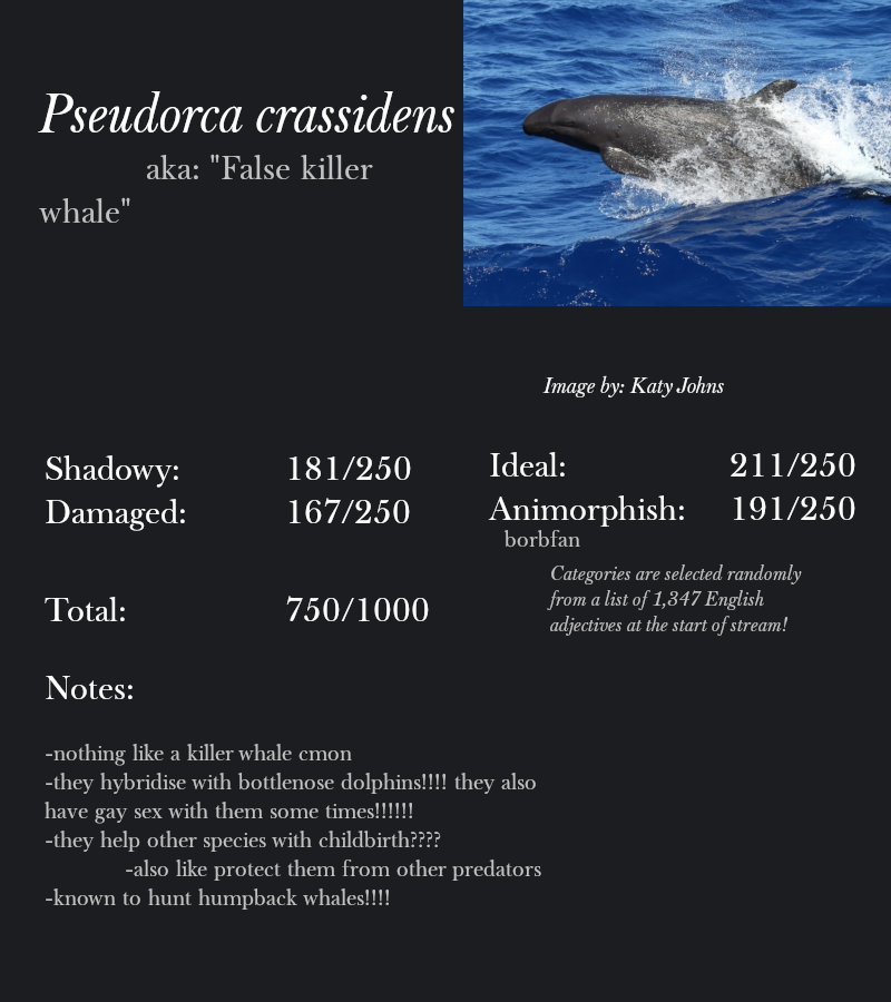 Categories are selected randomly from a list of 1,347 English adjectives at the start of stream! Ultimate: 220/250 Wavy: 180/250 Image by: Royle Safaris Notes: