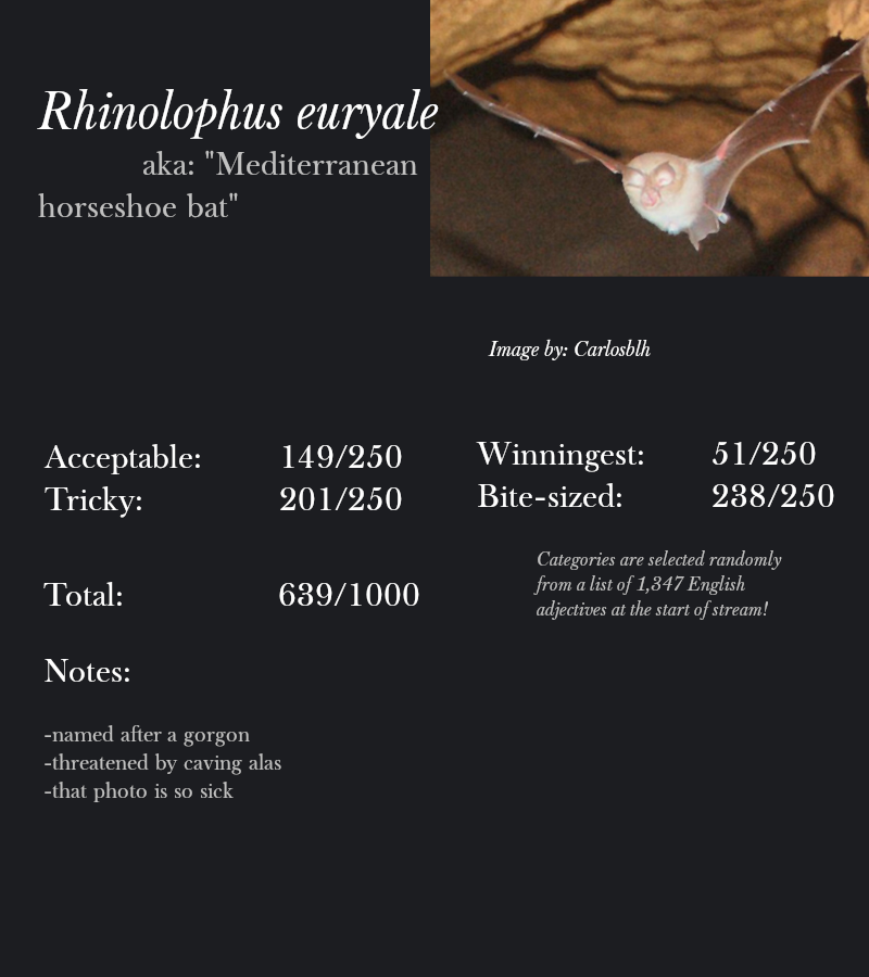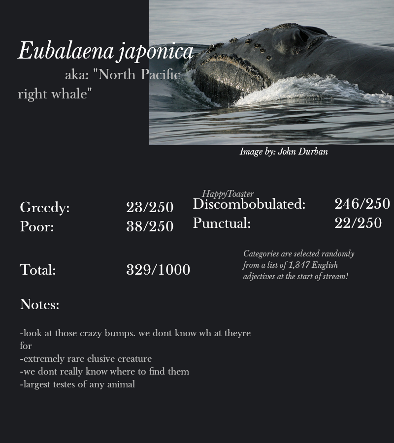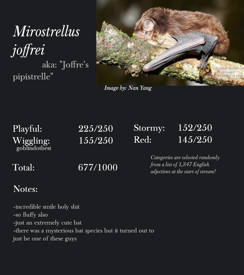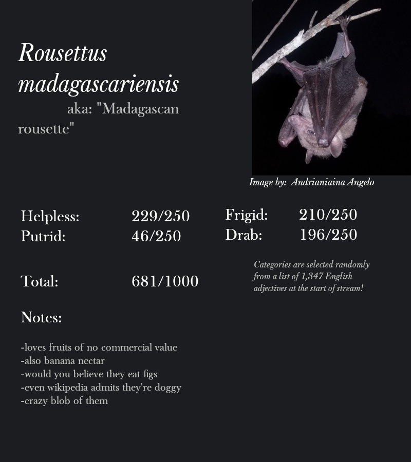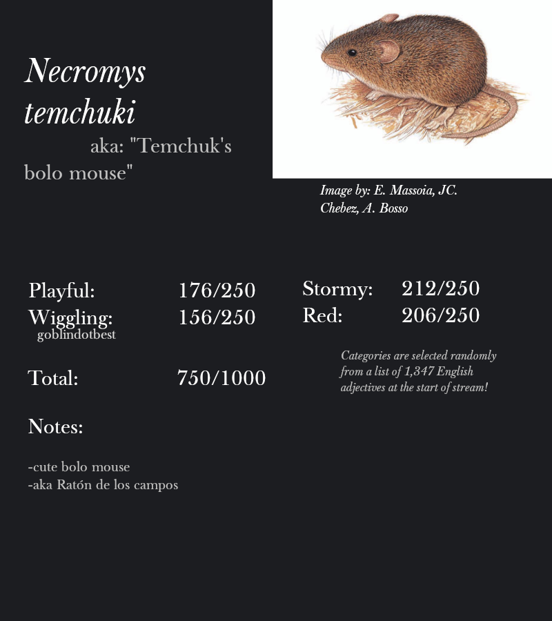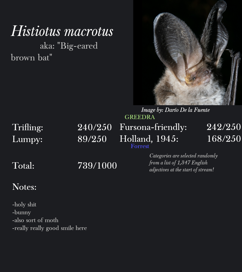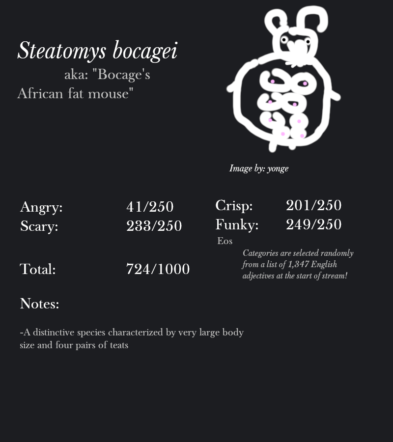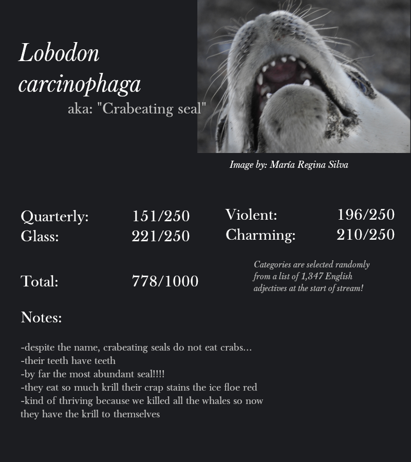 Categories are selected randomly from a list of 1,347 English adjectives at the start of stream! Ultimate: 220/250 Wavy: 180/250 Image by: Royle Safaris Notes: