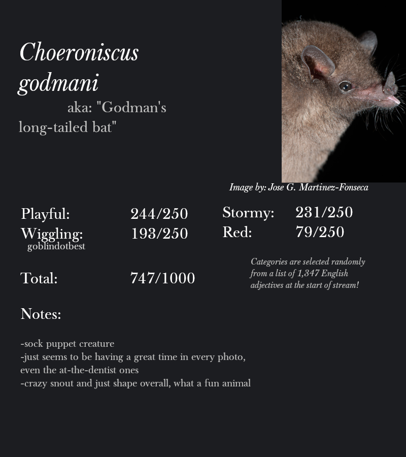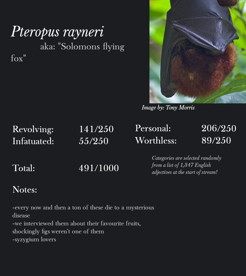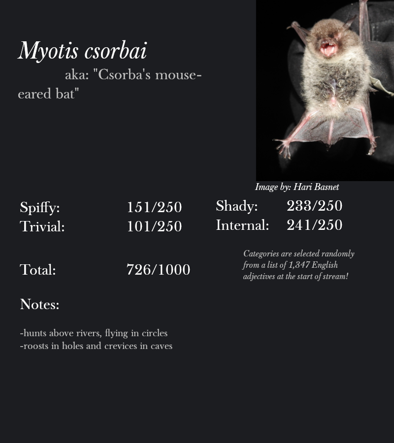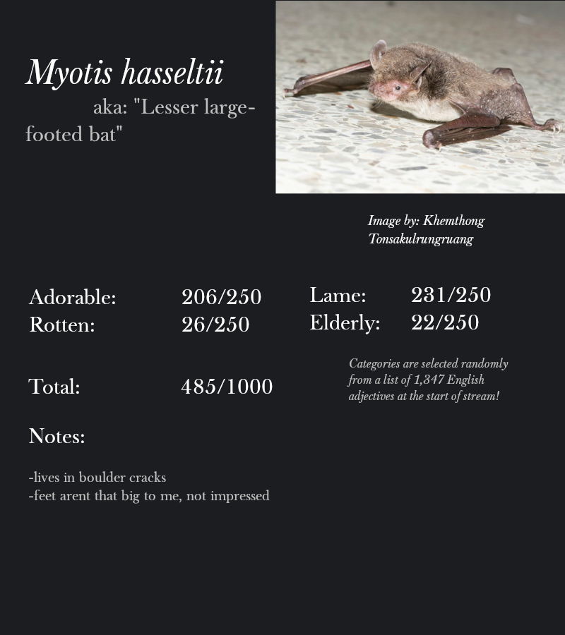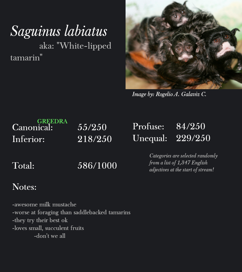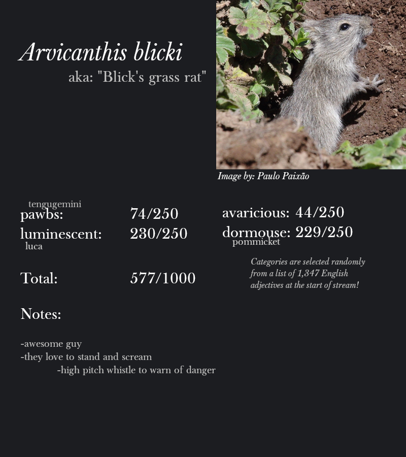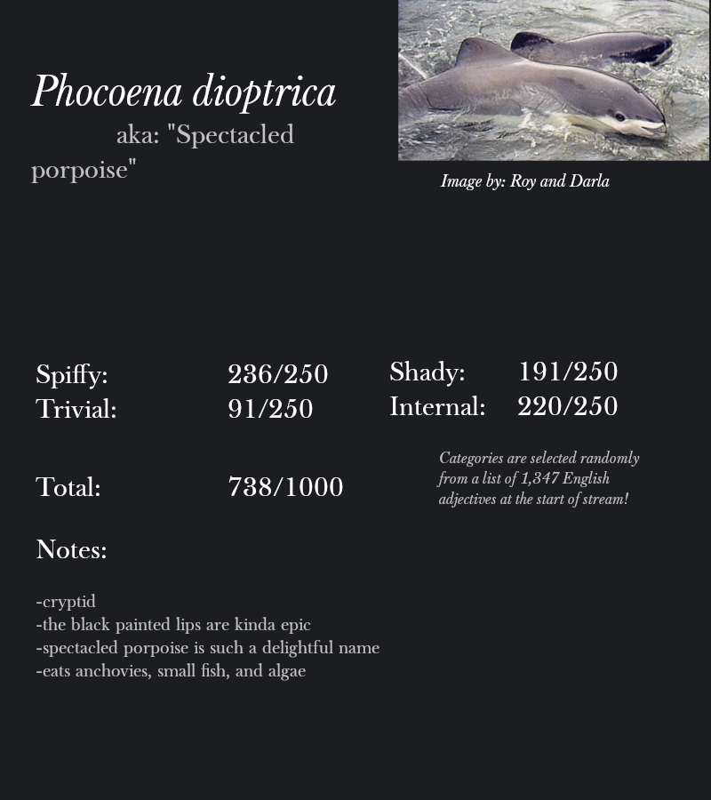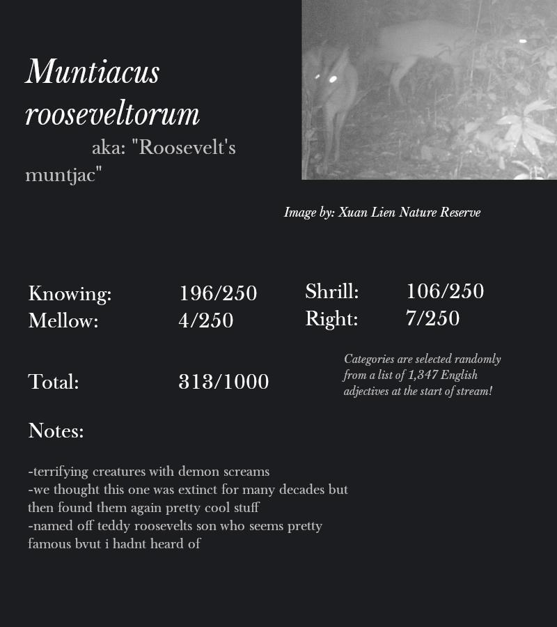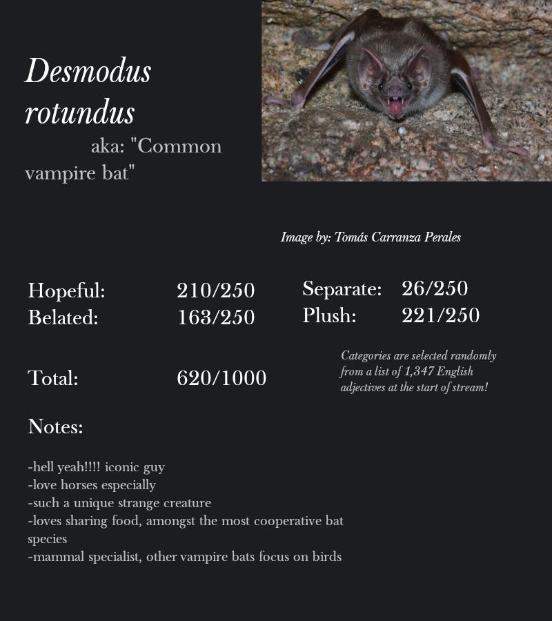 Categories are selected randomly from a list of 1,347 English adjectives at the start of stream! Ultimate: 220/250 Wavy: 180/250 Image by: Royle Safaris Notes: