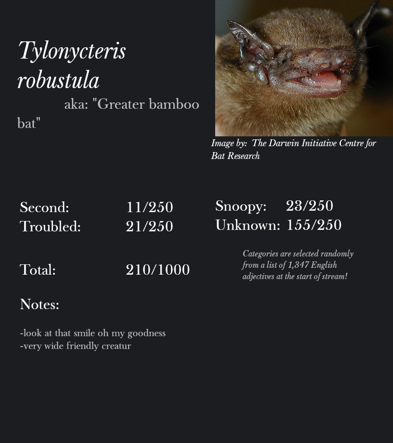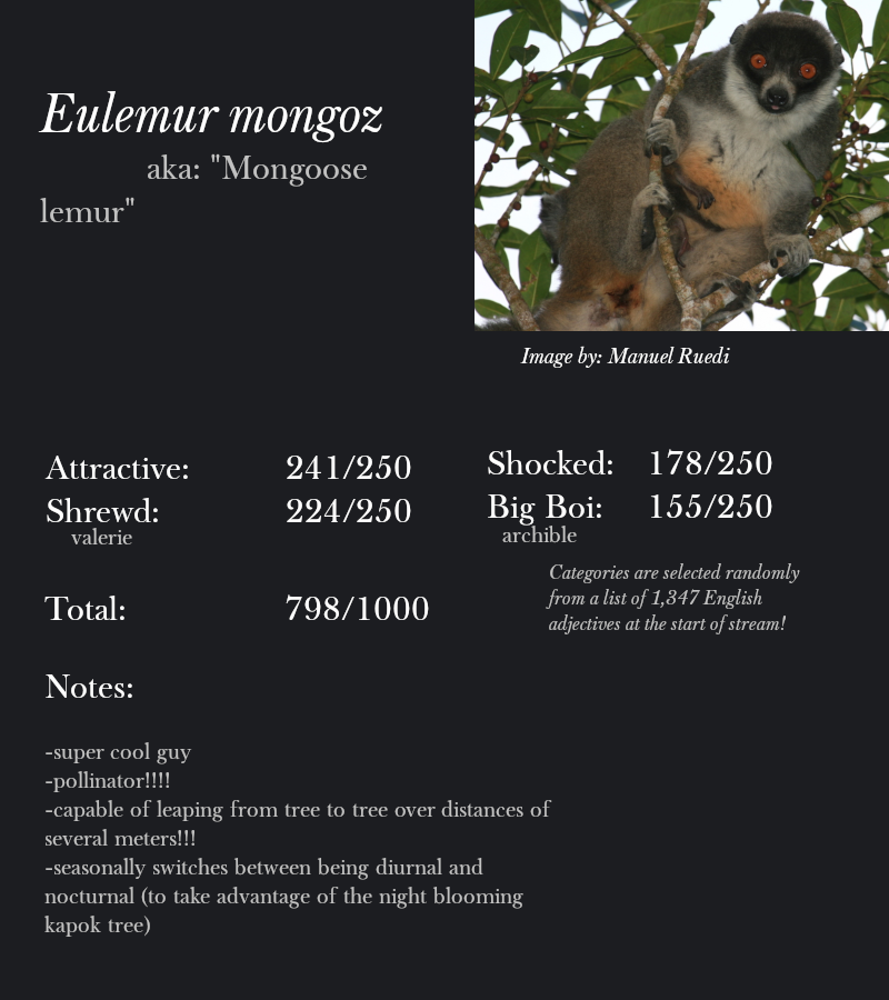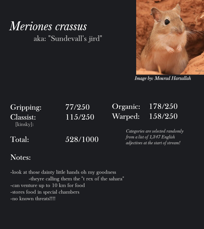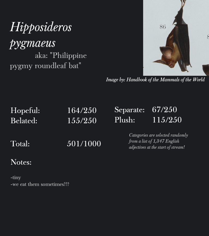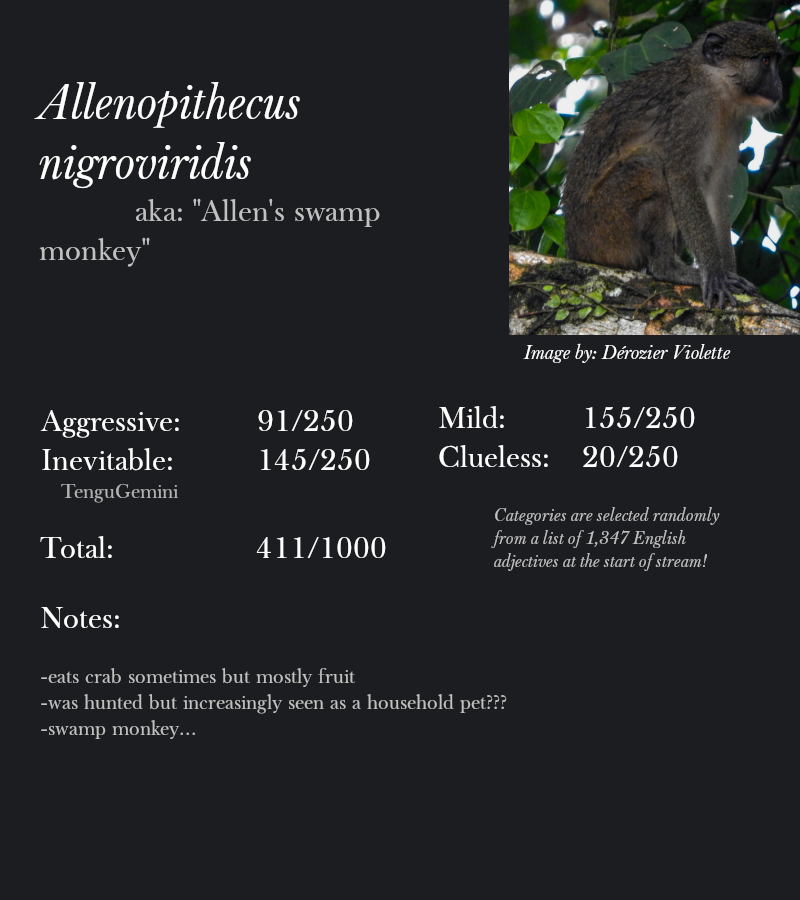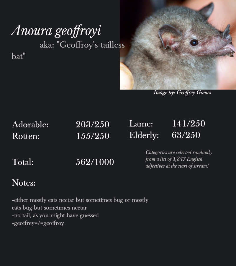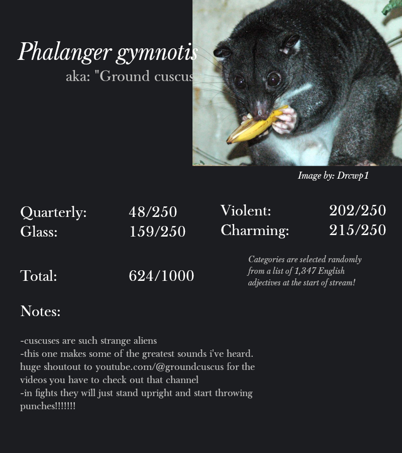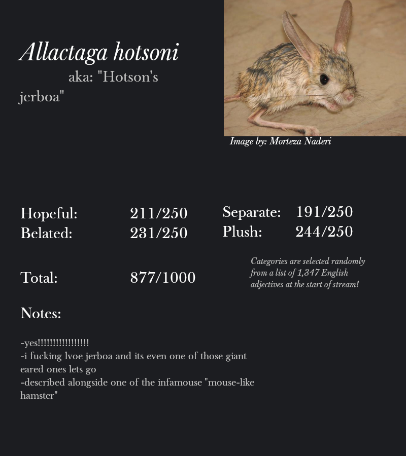 Categories are selected randomly from a list of 1,347 English adjectives at the start of stream! Ultimate: 220/250 Wavy: 180/250 Image by: Royle Safaris Notes: