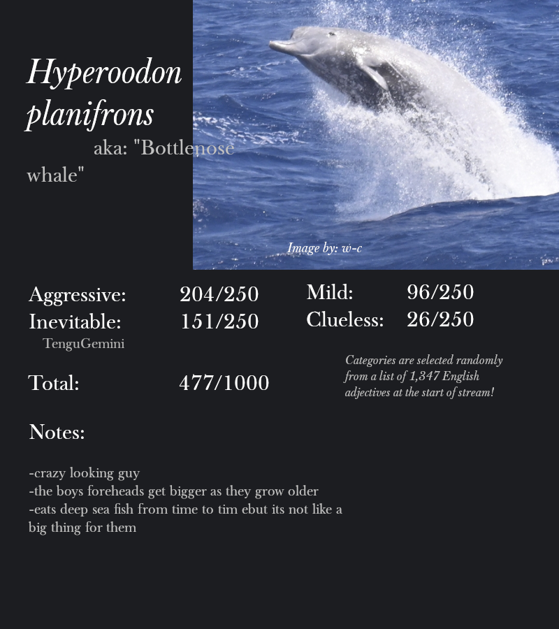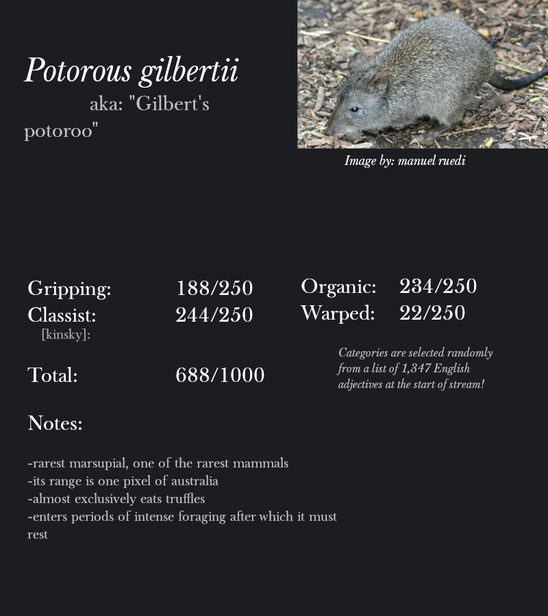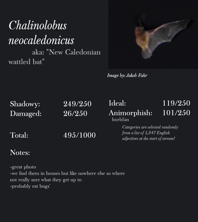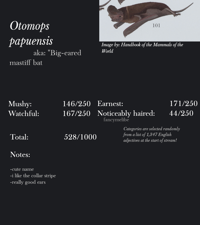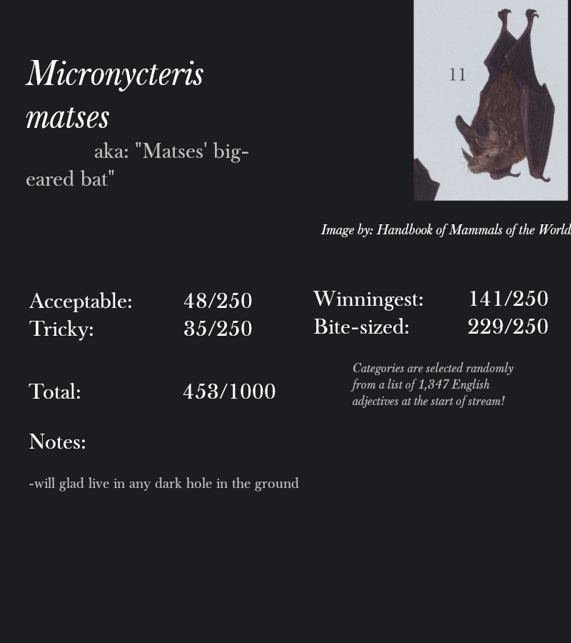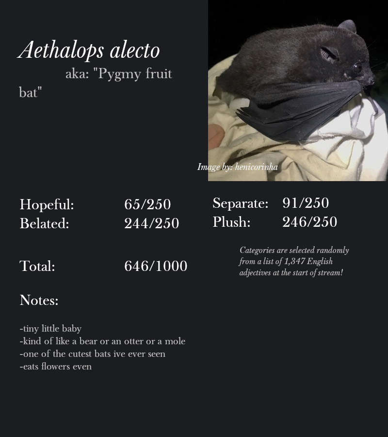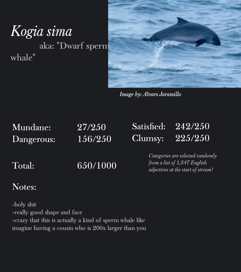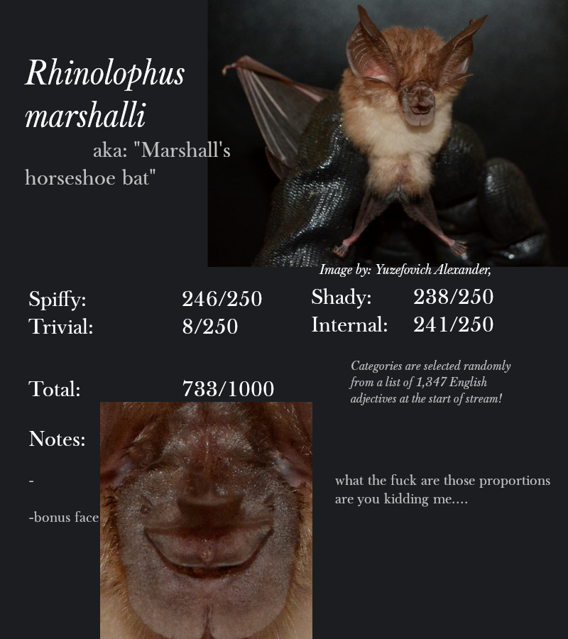 Categories are selected randomly from a list of 1,347 English adjectives at the start of stream! Ultimate: 220/250 Wavy: 180/250 Image by: Royle Safaris Notes: