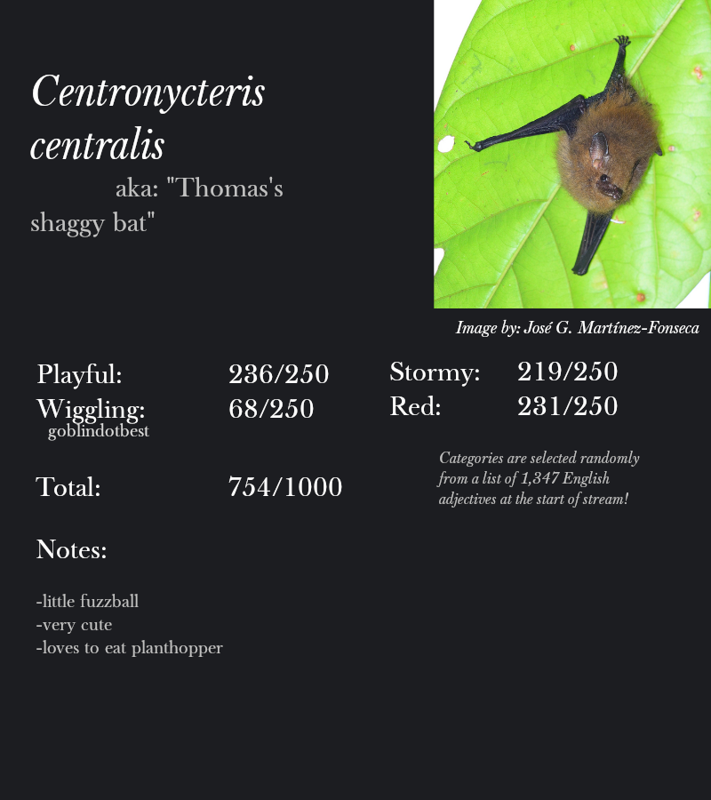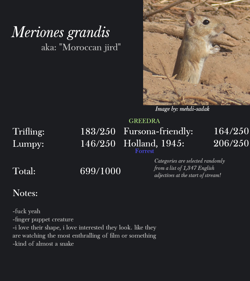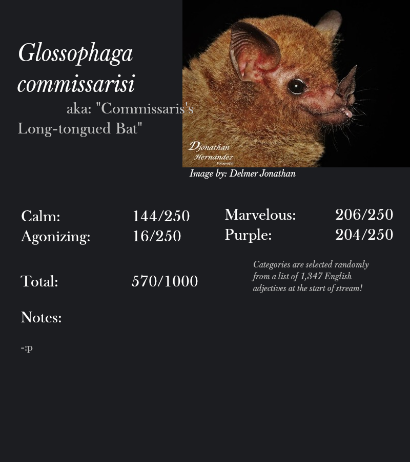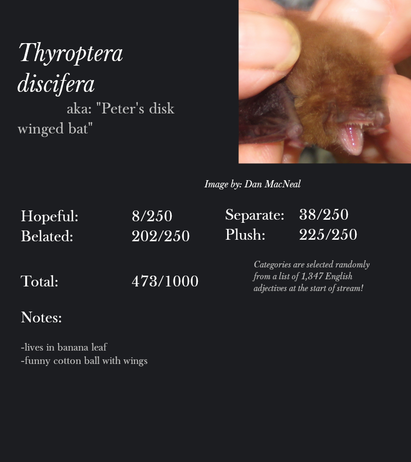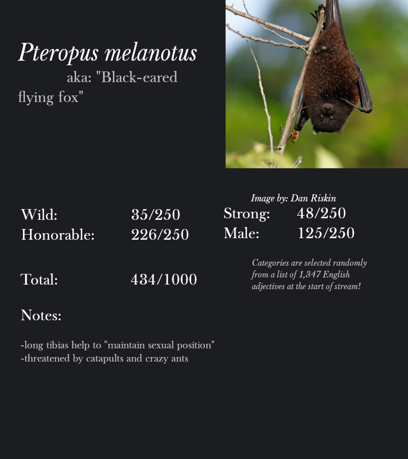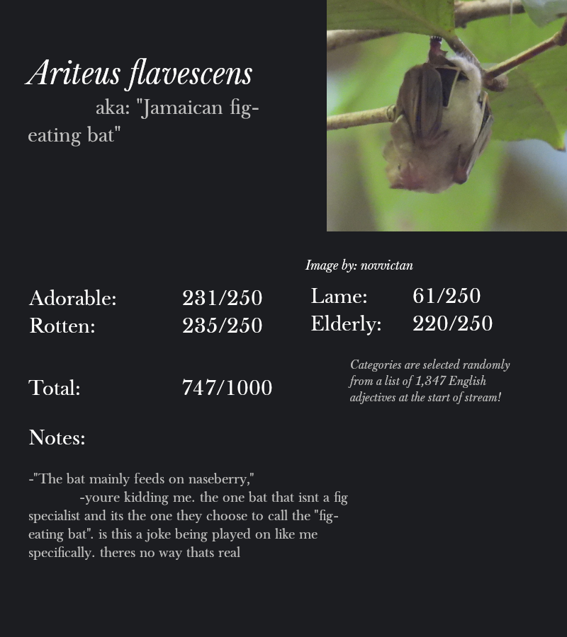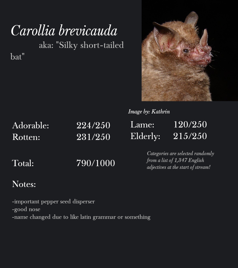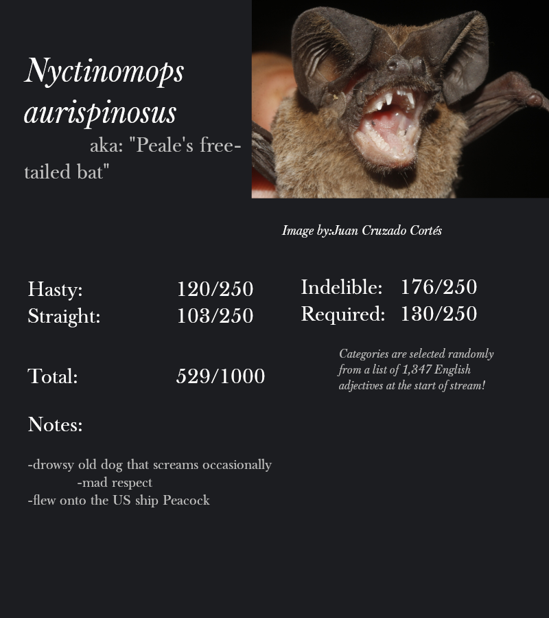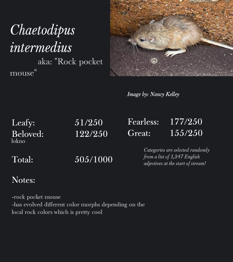 Categories are selected randomly from a list of 1,347 English adjectives at the start of stream! Ultimate: 220/250 Wavy: 180/250 Image by: Royle Safaris Notes: