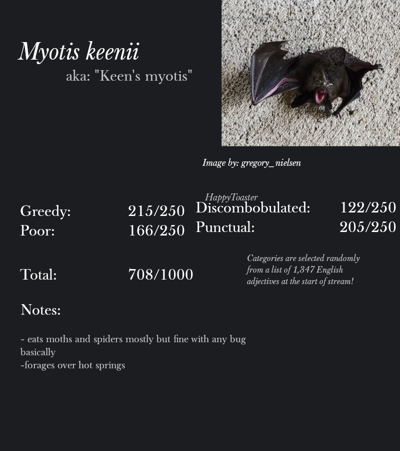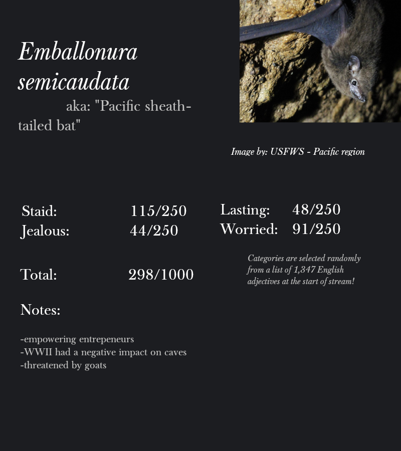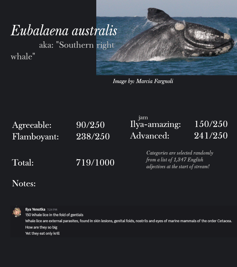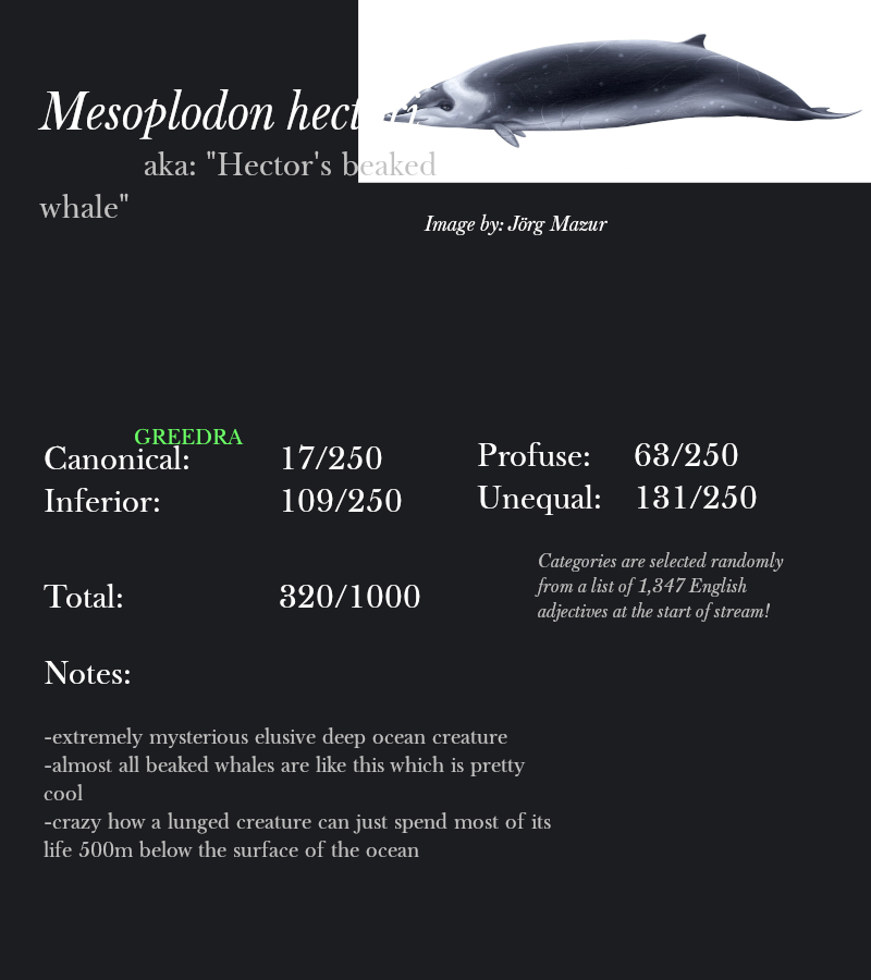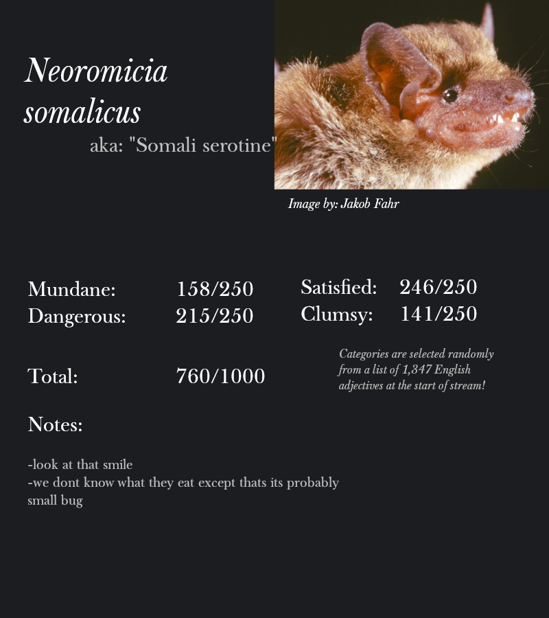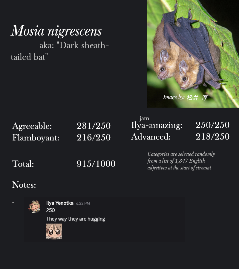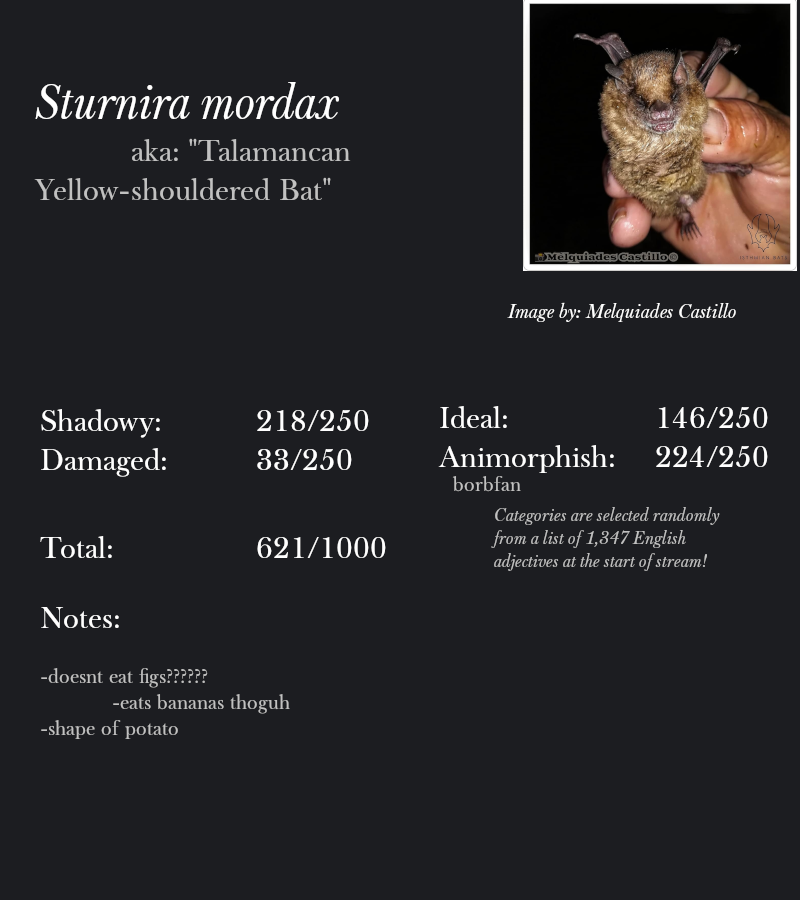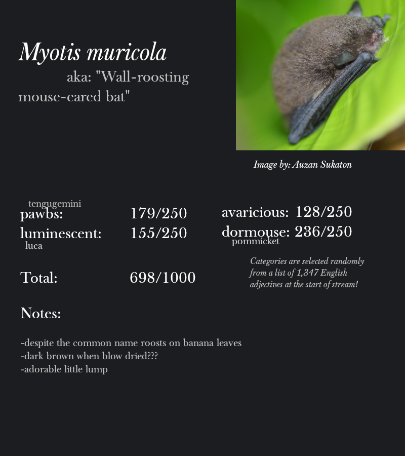 Categories are selected randomly from a list of 1,347 English adjectives at the start of stream! Ultimate: 220/250 Wavy: 180/250 Image by: Royle Safaris Notes: