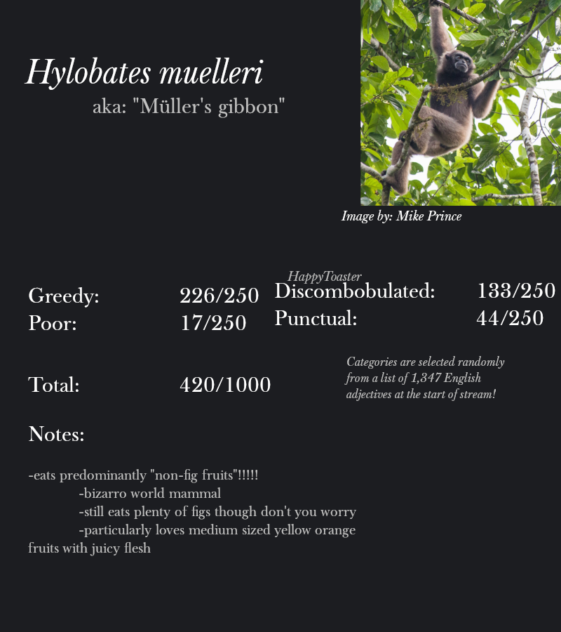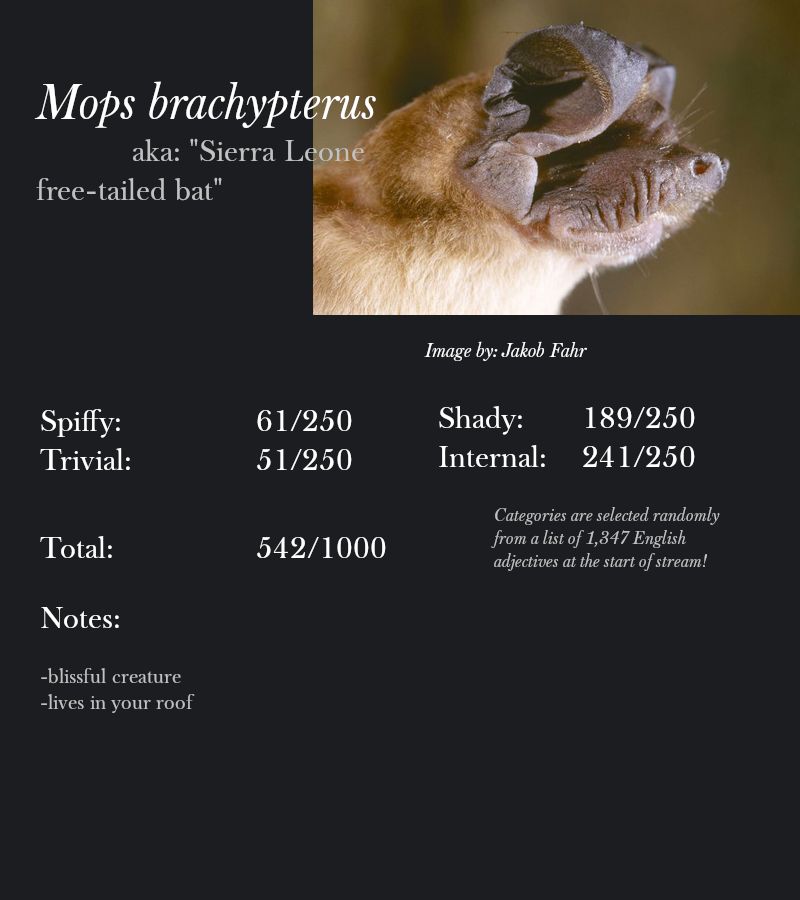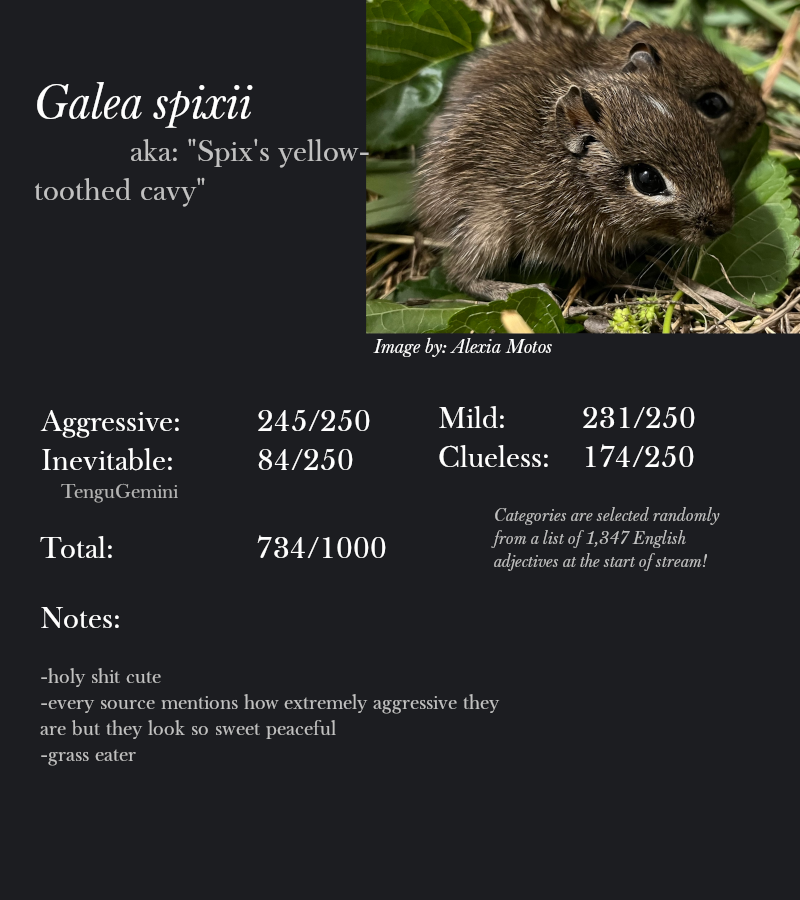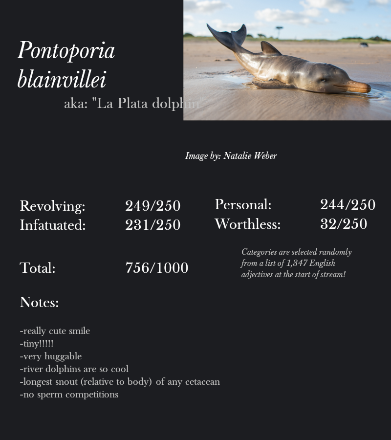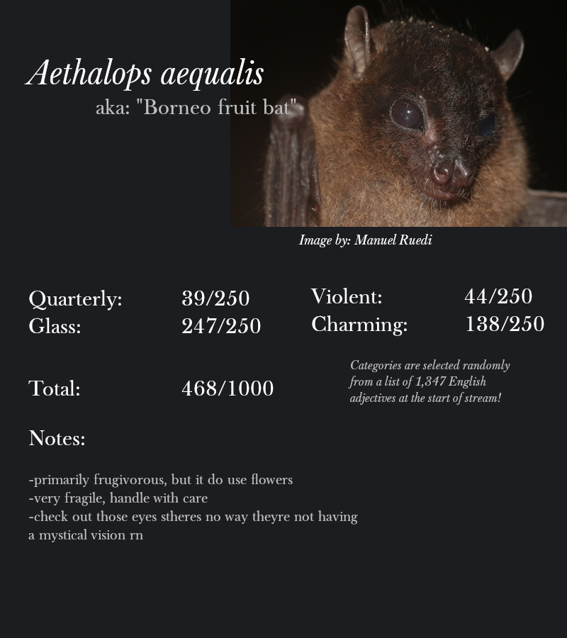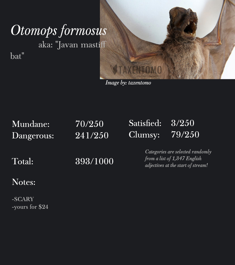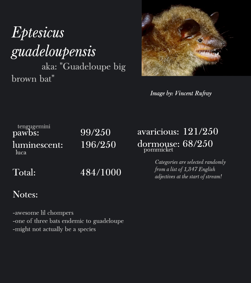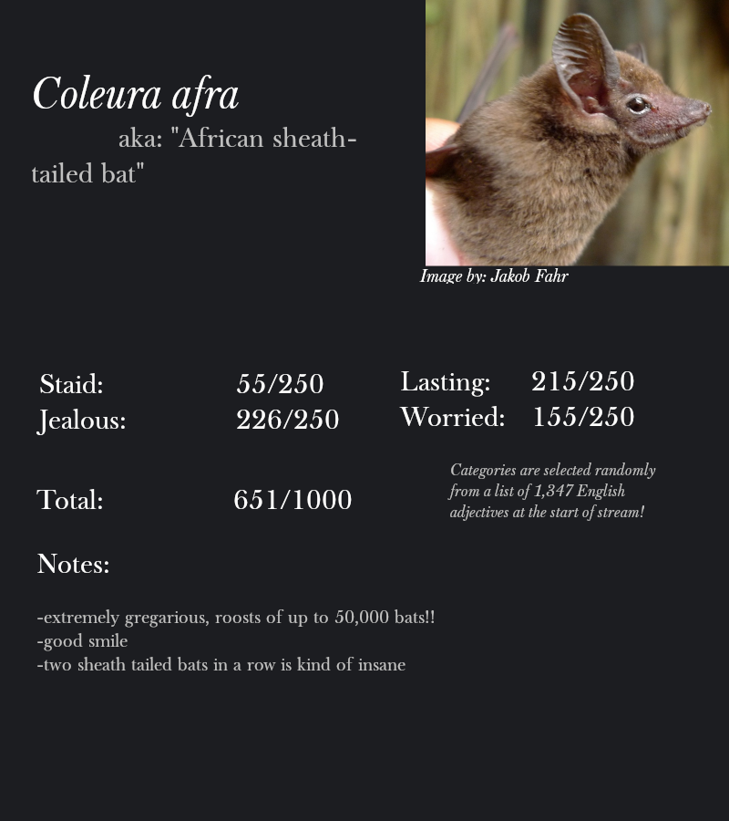 Categories are selected randomly from a list of 1,347 English adjectives at the start of stream! Ultimate: 220/250 Wavy: 180/250 Image by: Royle Safaris Notes: