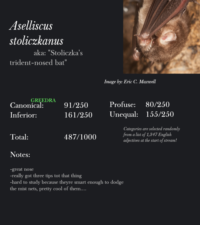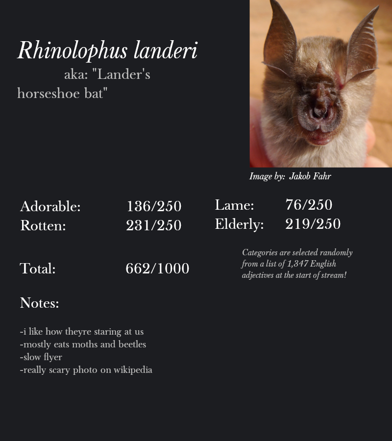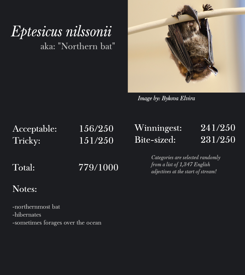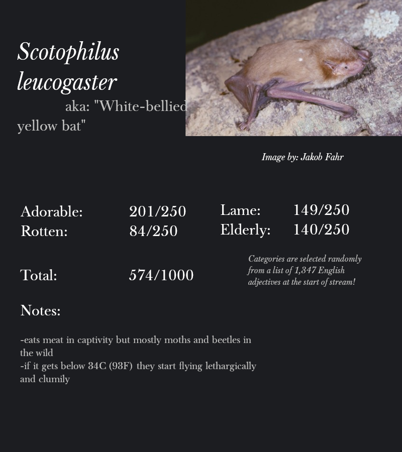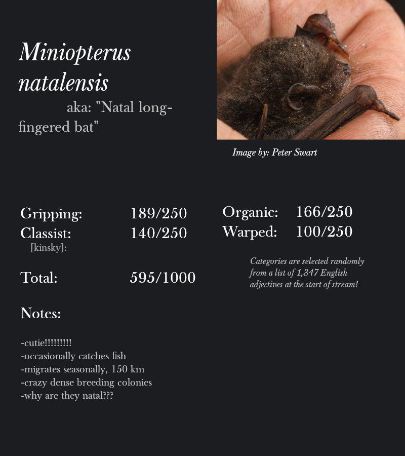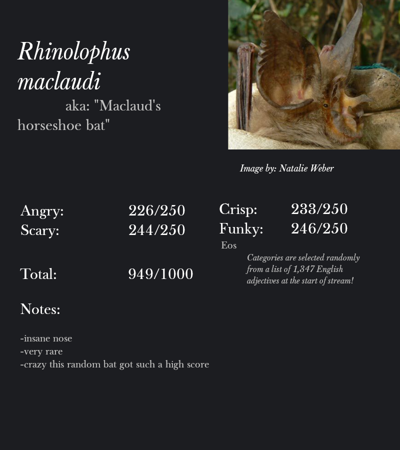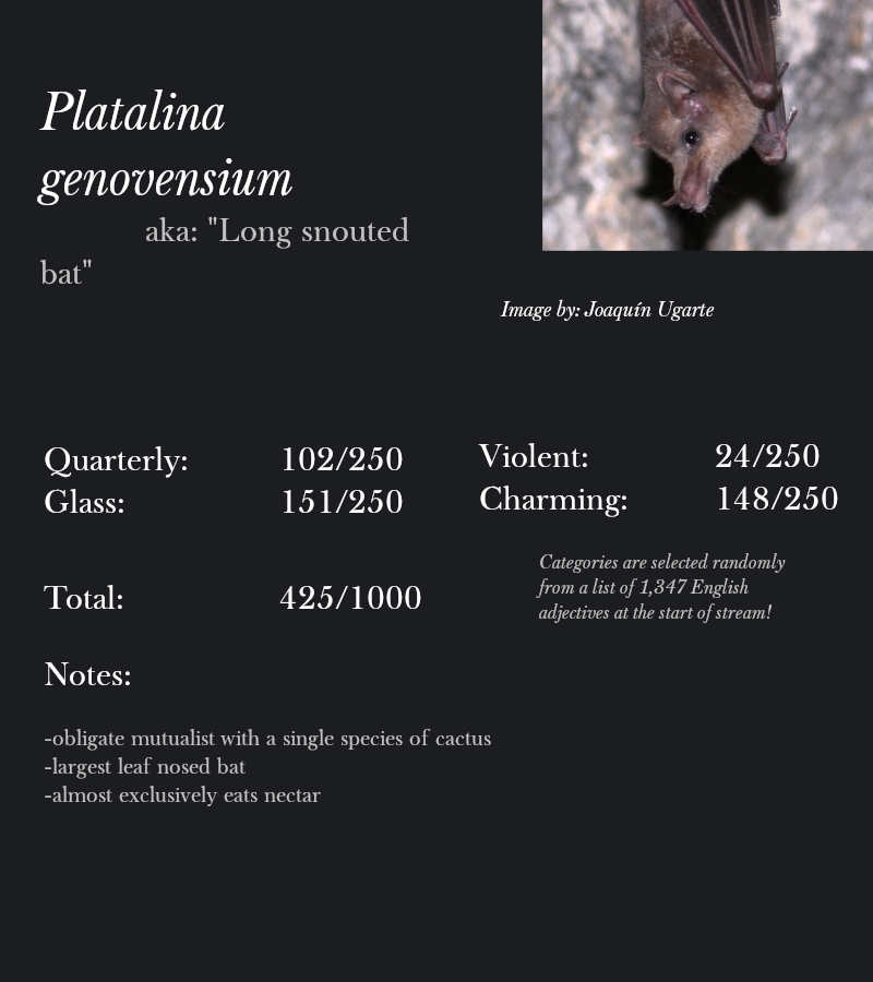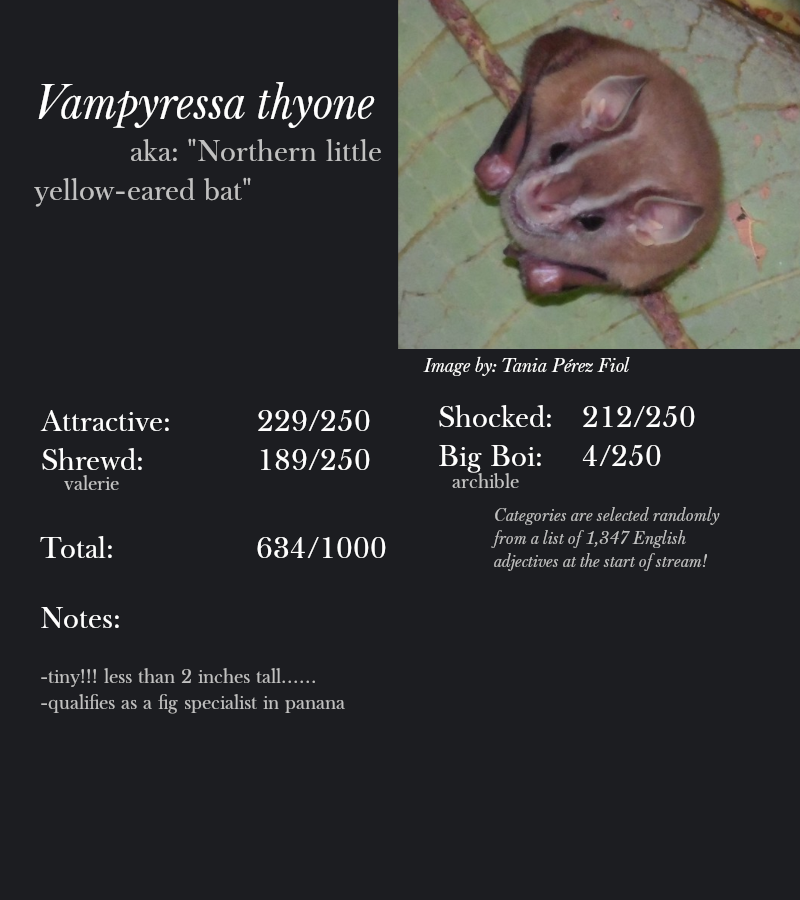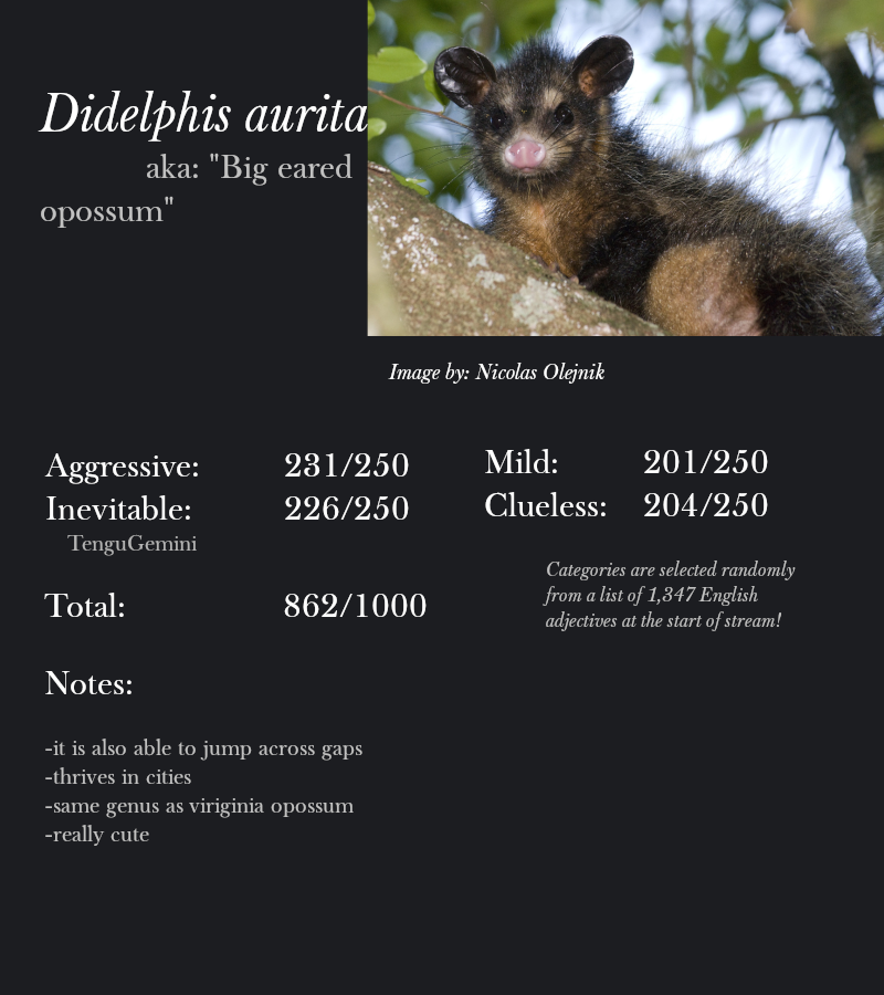 Categories are selected randomly from a list of 1,347 English adjectives at the start of stream! Ultimate: 220/250 Wavy: 180/250 Image by: Royle Safaris Notes: