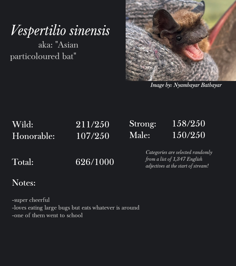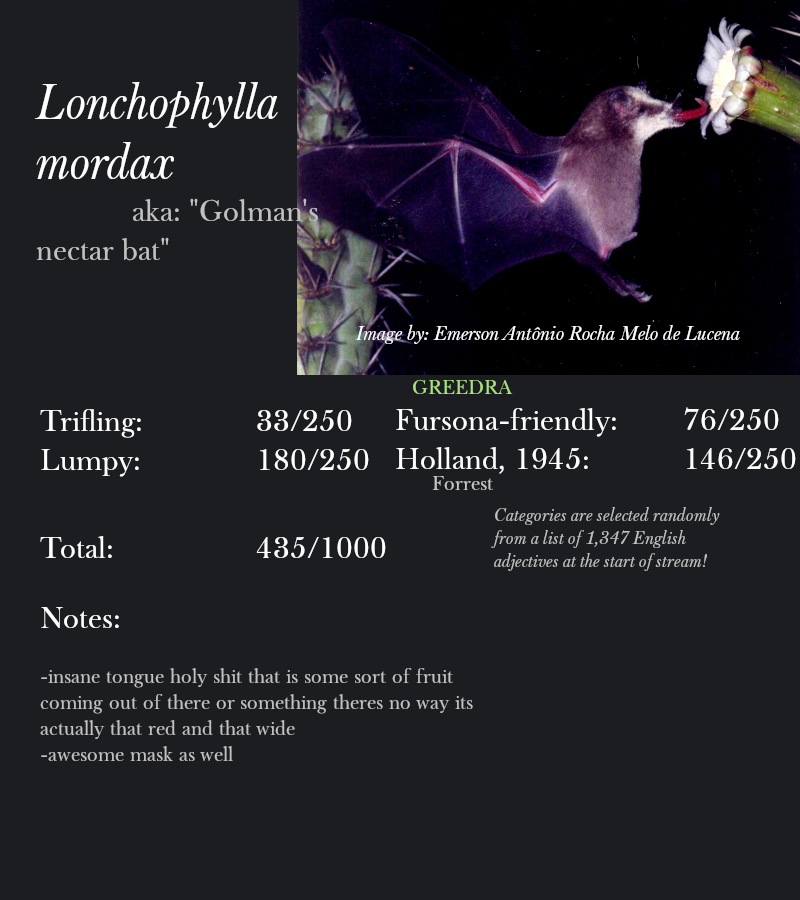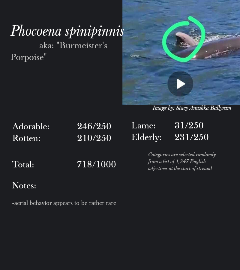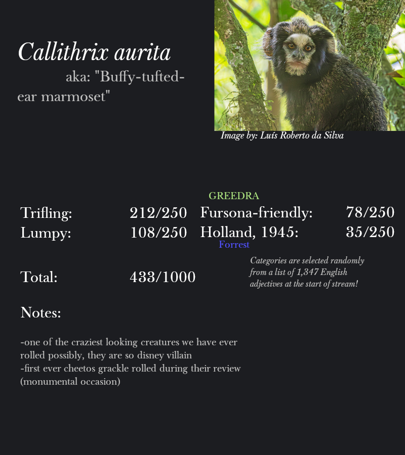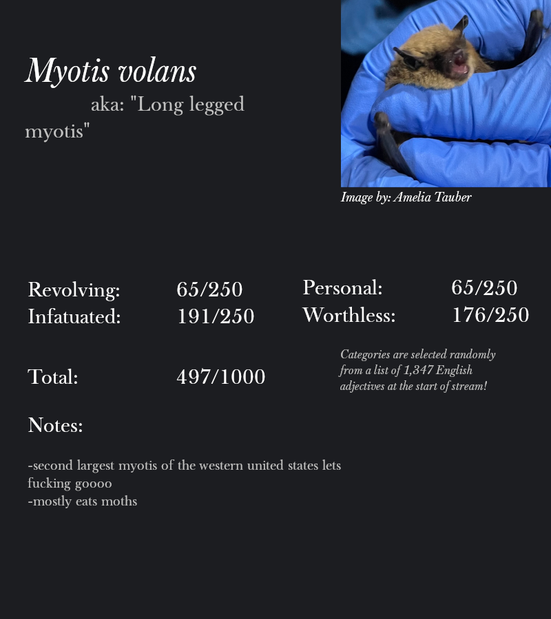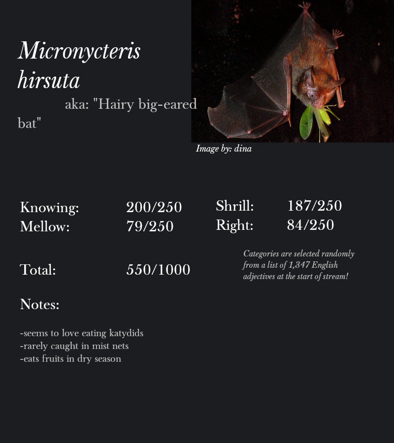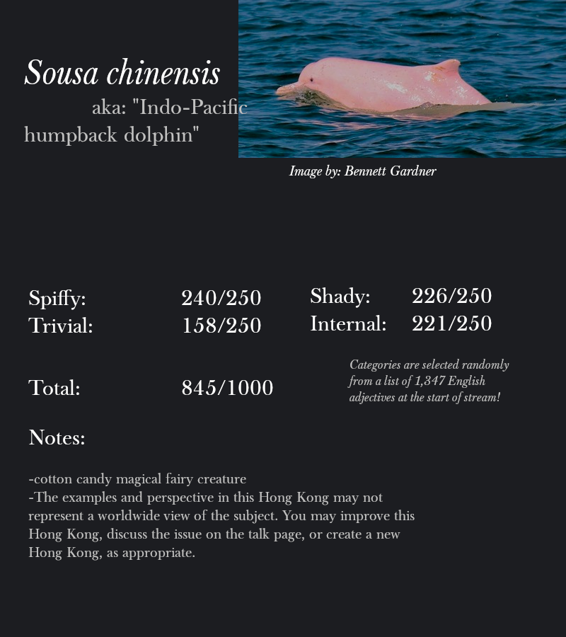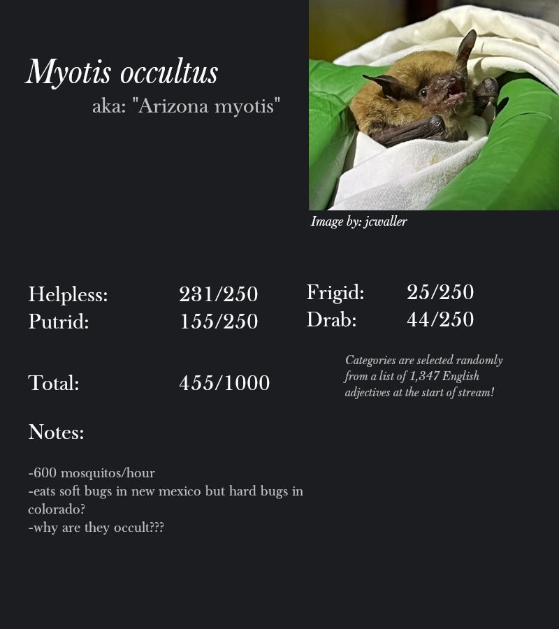 Categories are selected randomly from a list of 1,347 English adjectives at the start of stream! Ultimate: 220/250 Wavy: 180/250 Image by: Royle Safaris Notes: