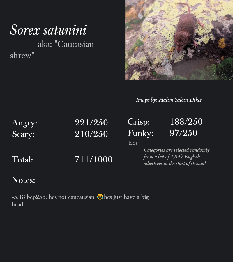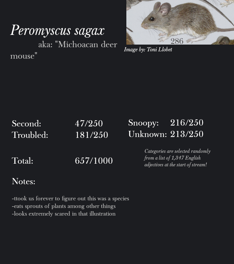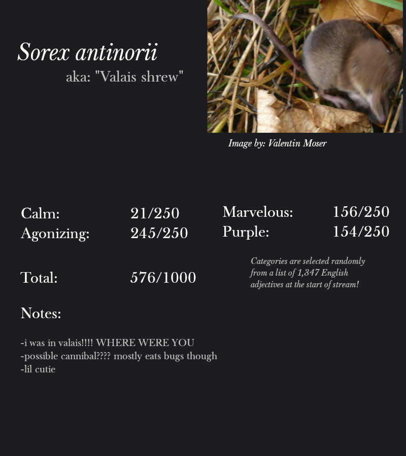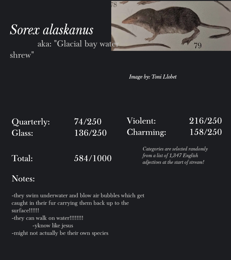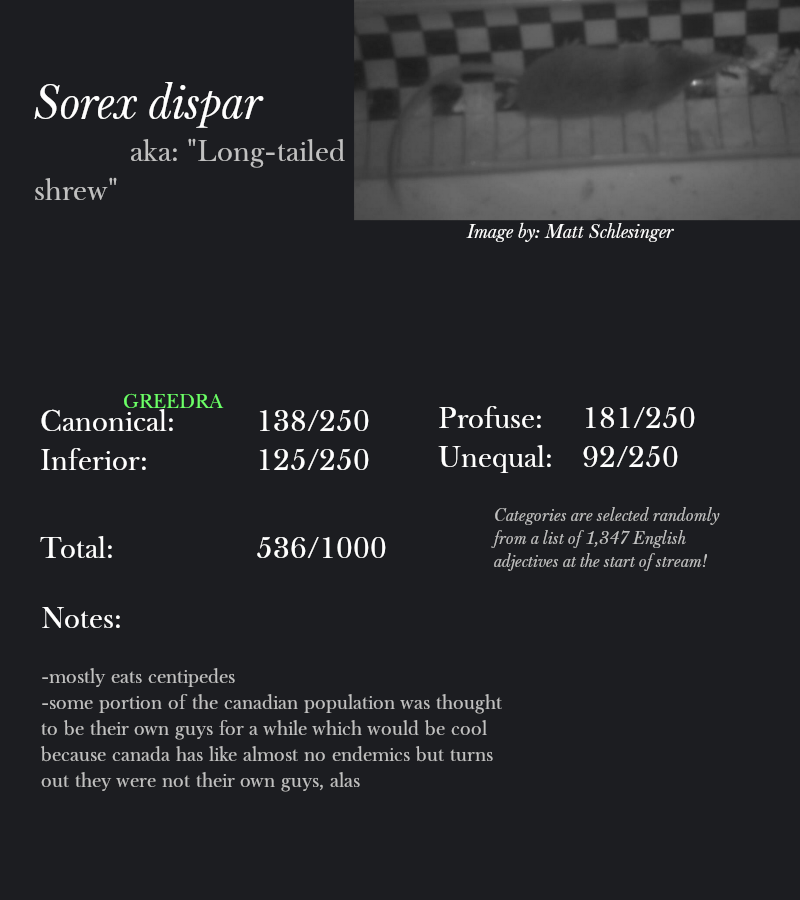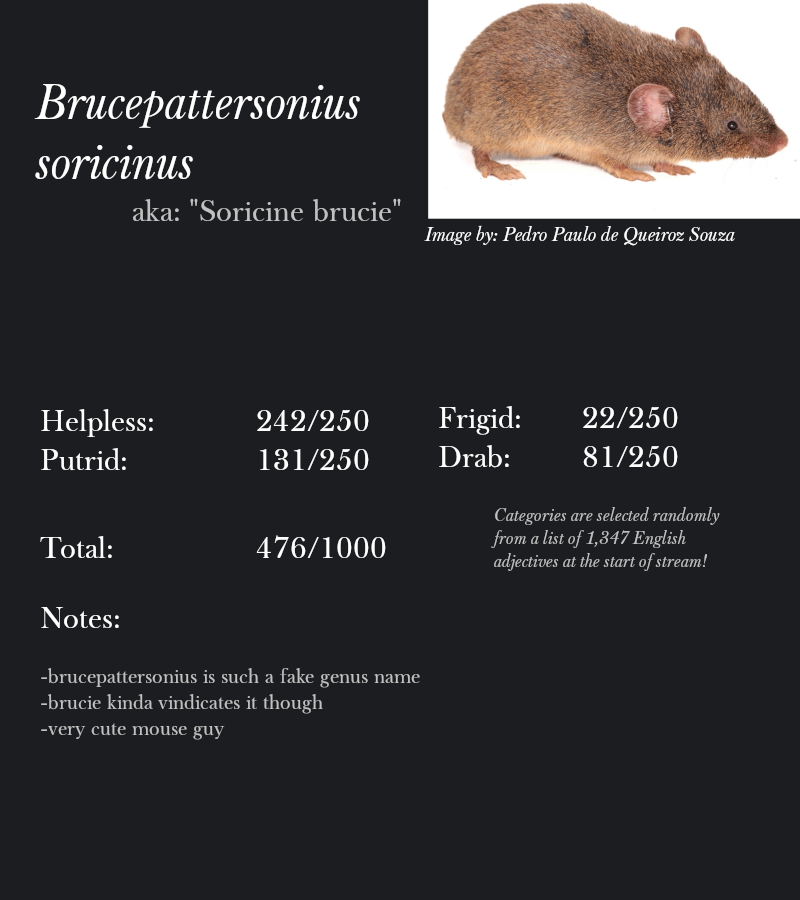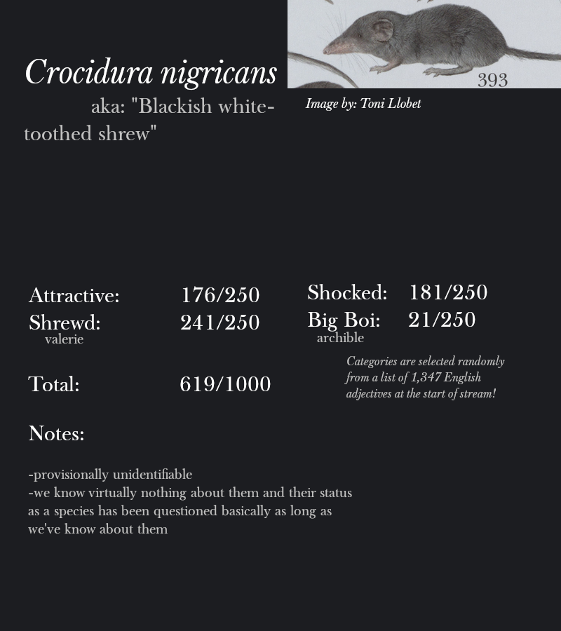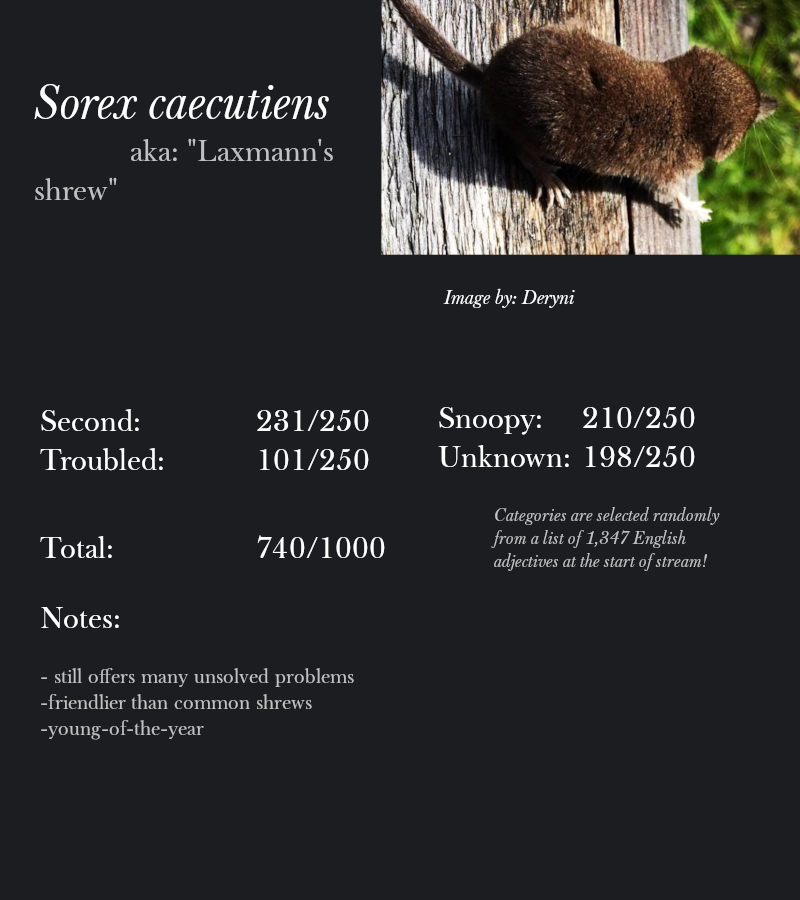 Sorex veraecrucis aka: "Veracruz shrew" os Impressionable: 71/250 Squiggly: 64/250 Peaceful: 188/250 Fake: 100/250 Categories from a list are of 1 selected ,347 Eng randomly lish Total: 423/1000 Categ from or a ies list ar of select 1,347 ed rando English adjectives at the start of stream! Notes: -its om baby y pa -its baby omy sais y pave asrey omy sais pave asrey -living its best life