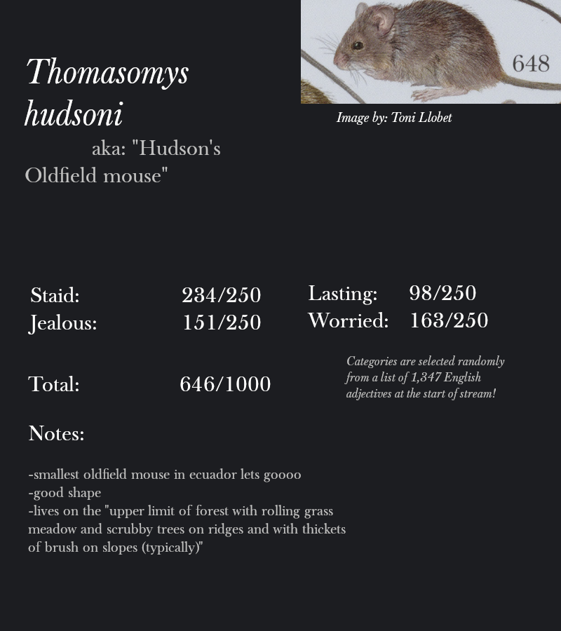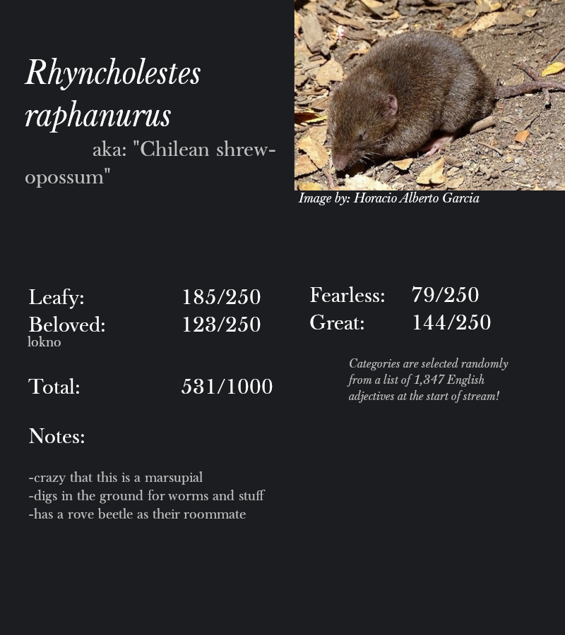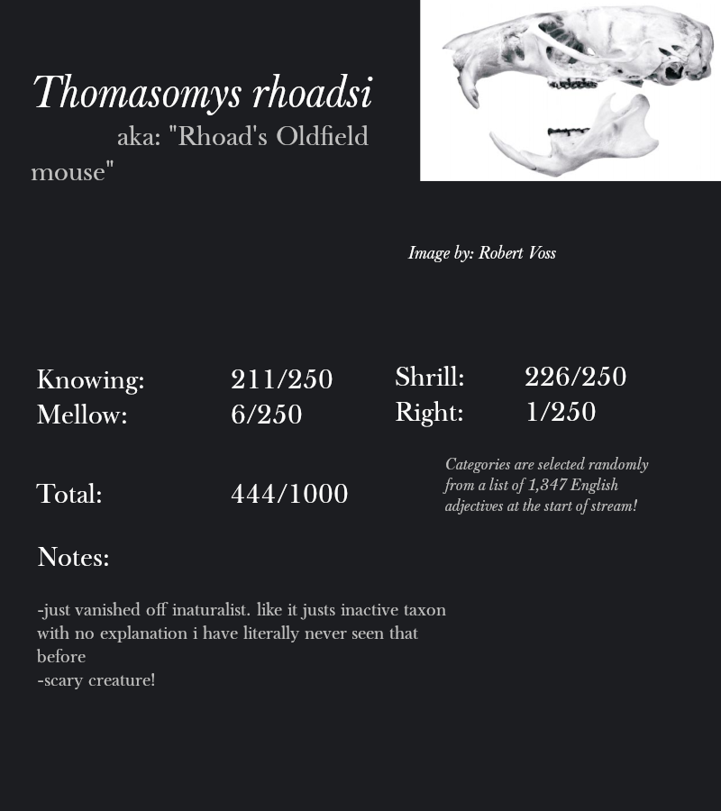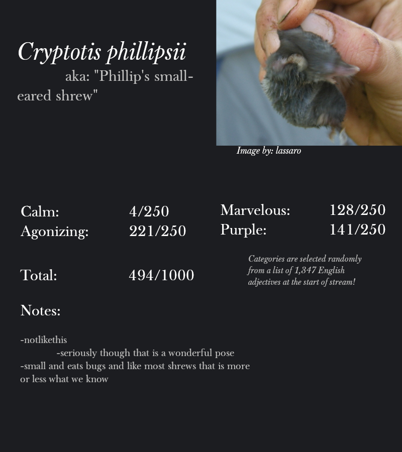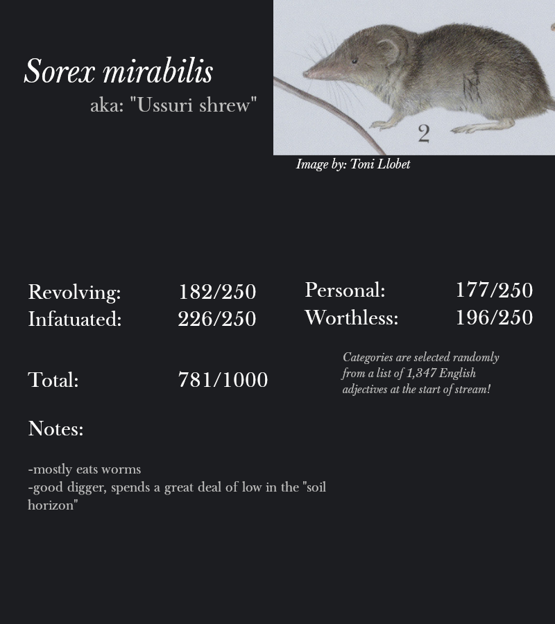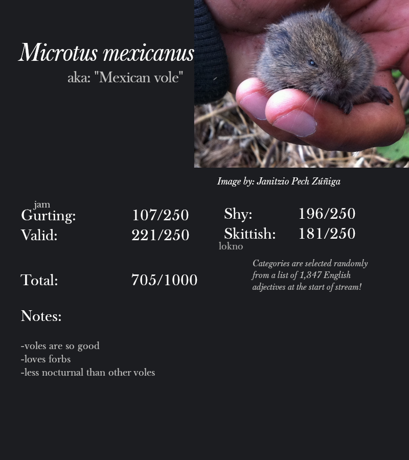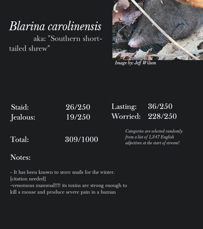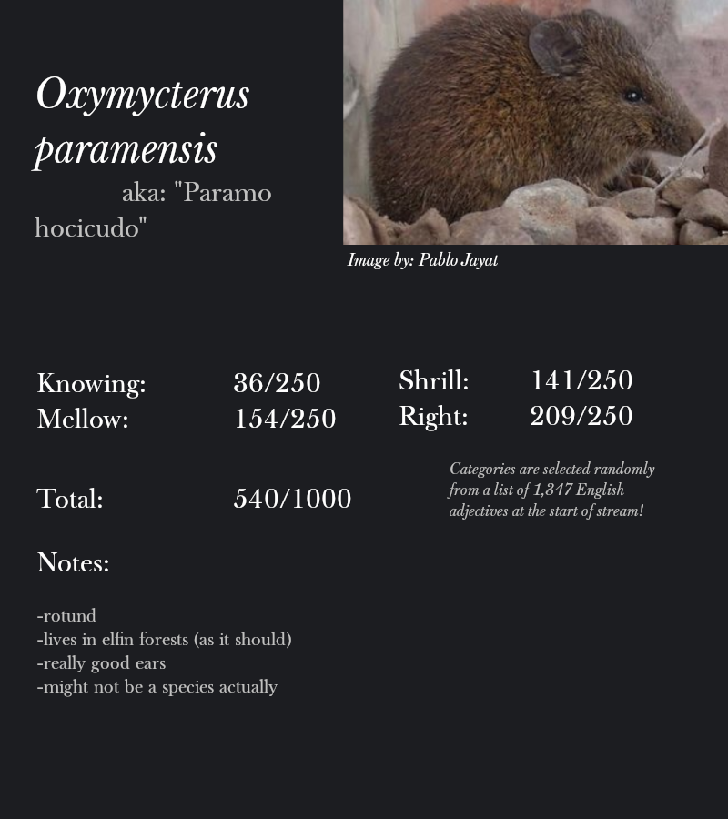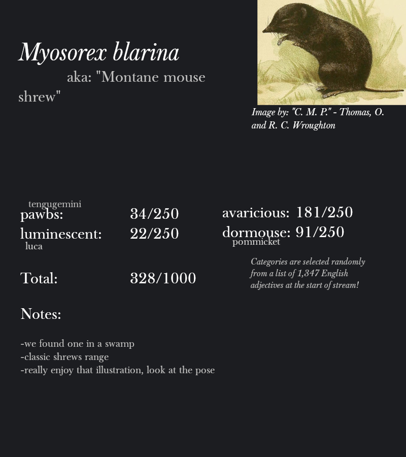 Sorex veraecrucis aka: "Veracruz shrew" os Impressionable: 71/250 Squiggly: 64/250 Peaceful: 188/250 Fake: 100/250 Categories from a list are of 1 selected ,347 Eng randomly lish Total: 423/1000 Categ from or a ies list ar of select 1,347 ed rando English adjectives at the start of stream! Notes: -its om baby y pa -its baby omy sais y pave asrey omy sais pave asrey -living its best life
