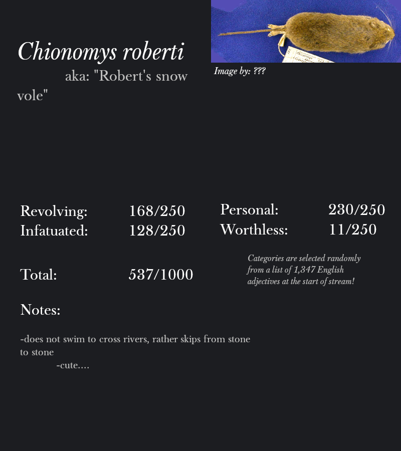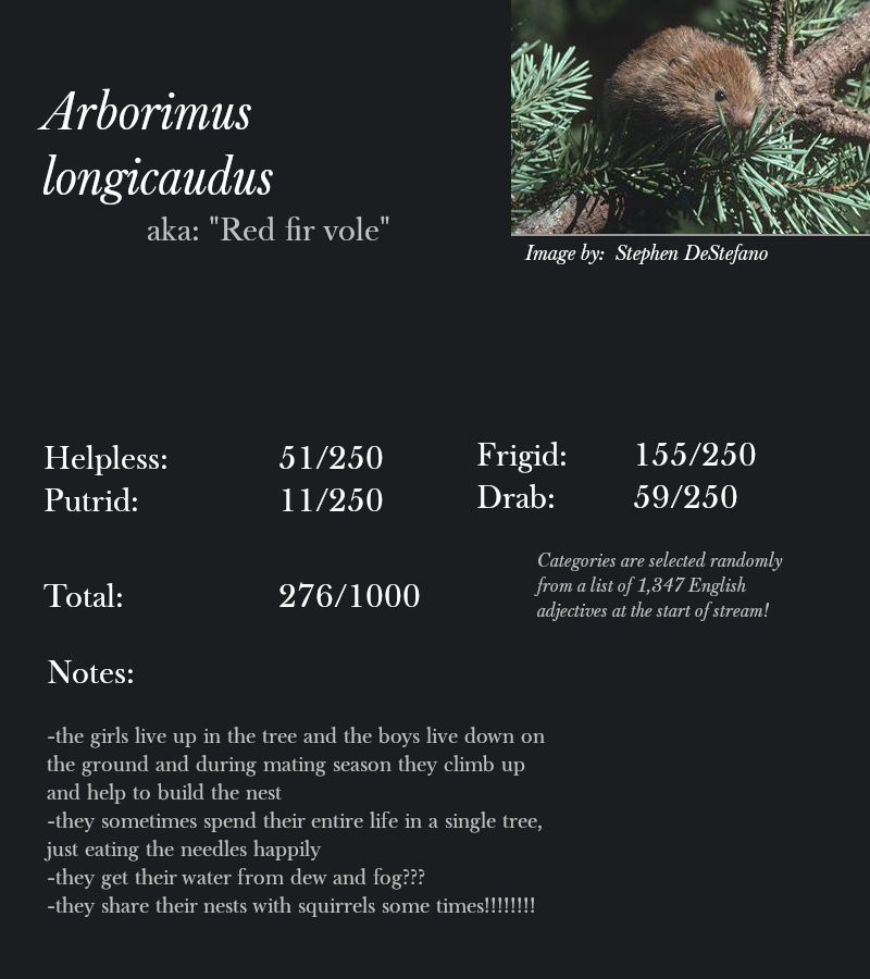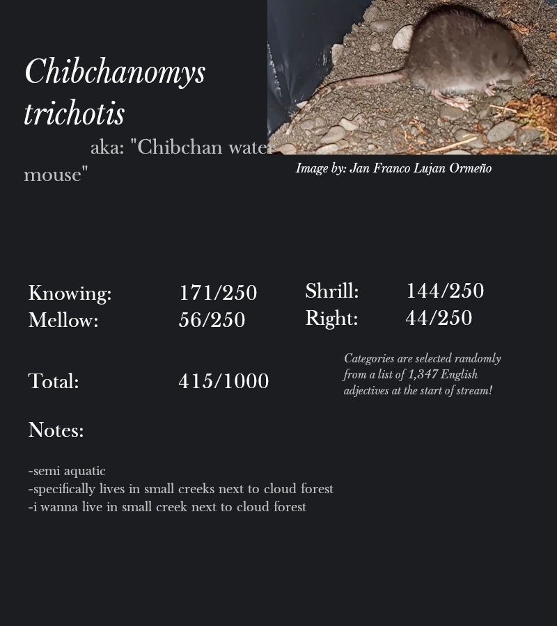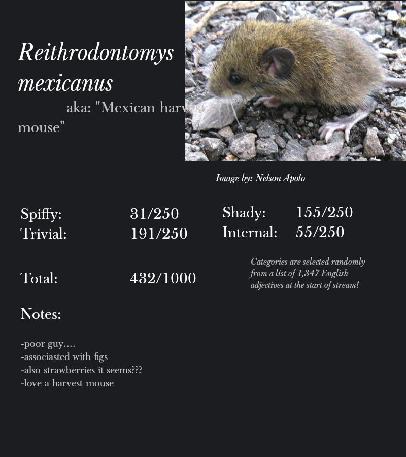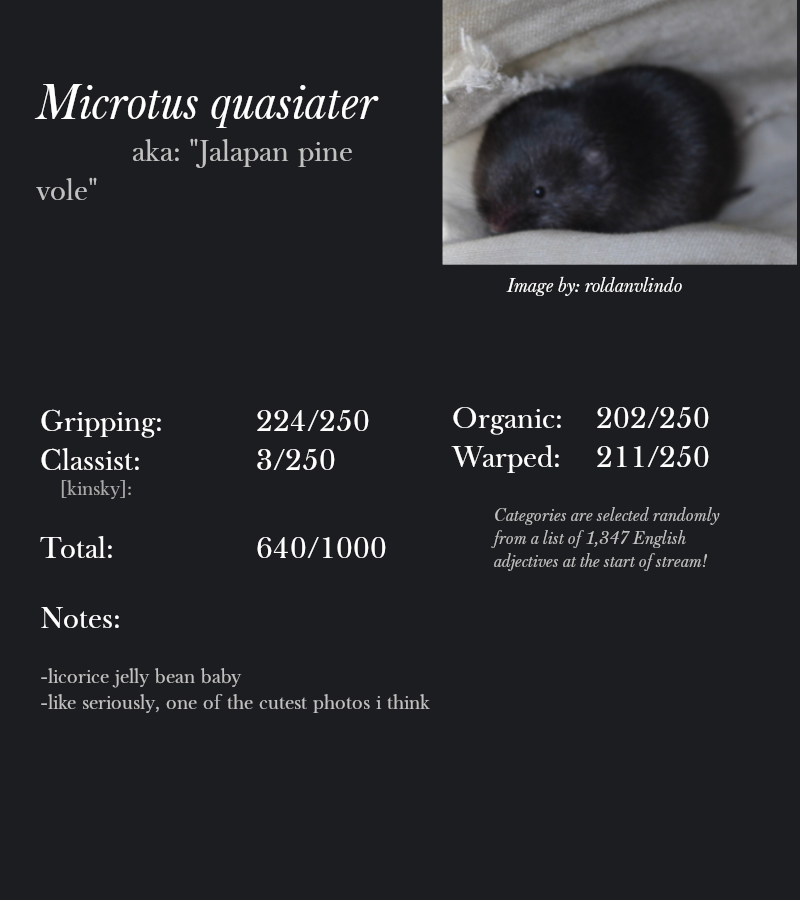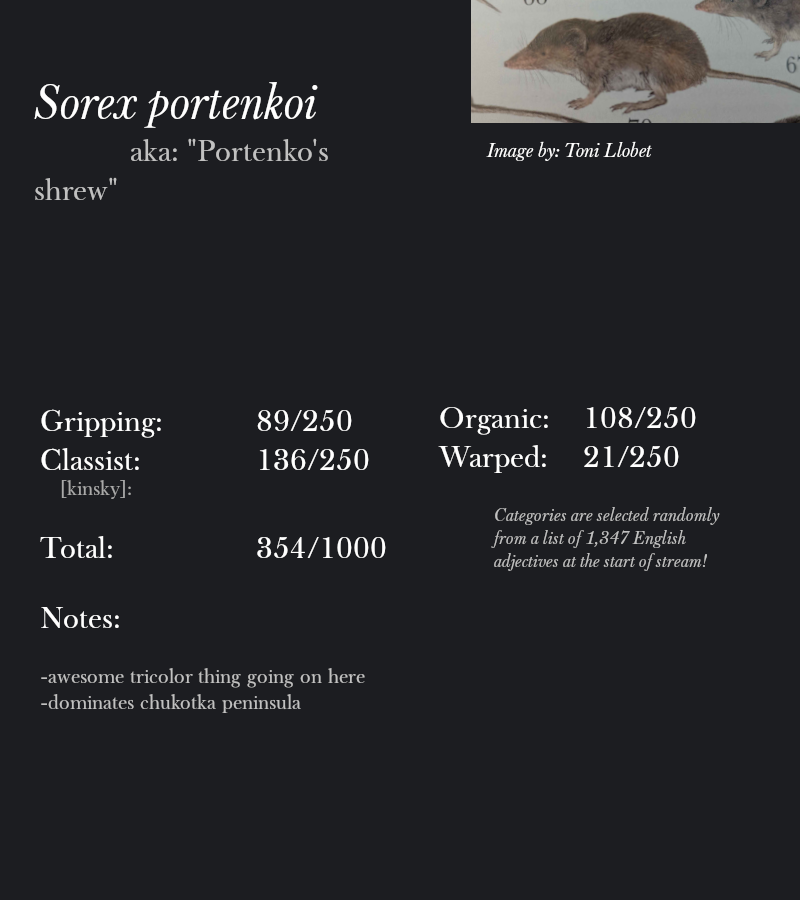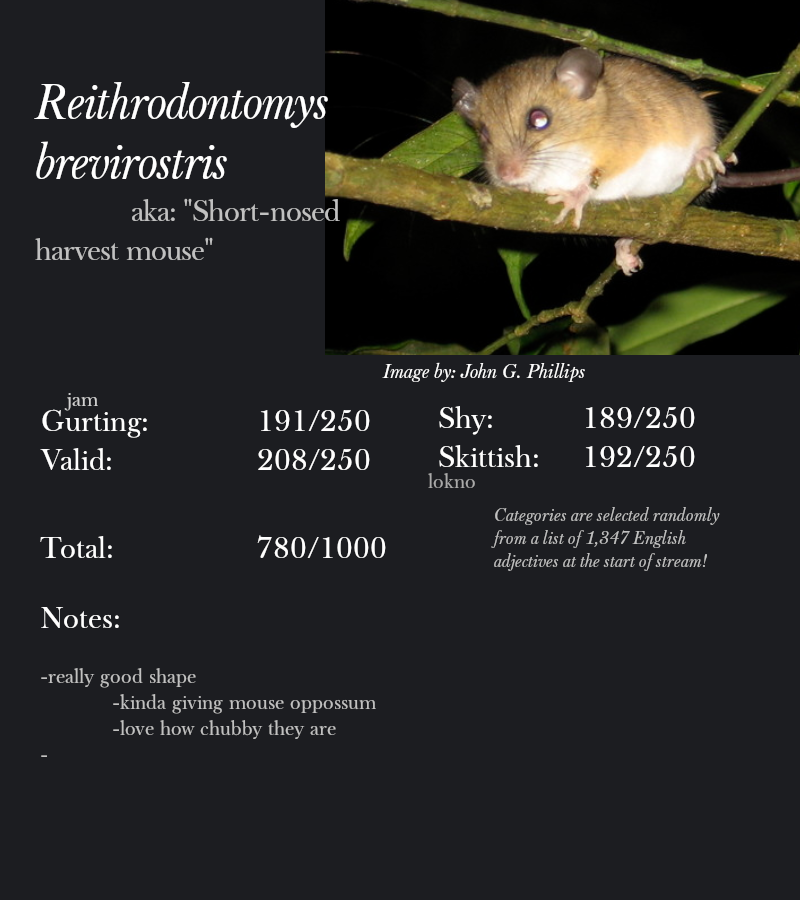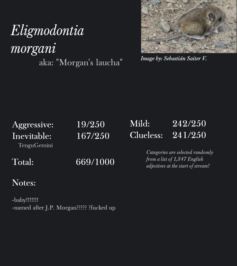 Sorex veraecrucis aka: "Veracruz shrew" os Impressionable: 71/250 Squiggly: 64/250 Peaceful: 188/250 Fake: 100/250 Categories from a list are of 1 selected ,347 Eng randomly lish Total: 423/1000 Categ from or a ies list ar of select 1,347 ed rando English adjectives at the start of stream! Notes: -its om baby y pa -its baby omy sais y pave asrey omy sais pave asrey -living its best life