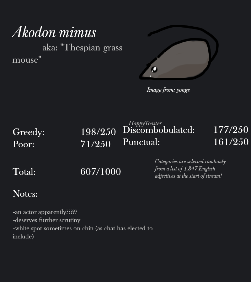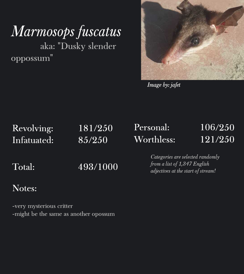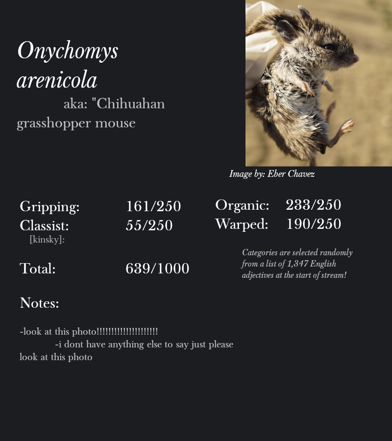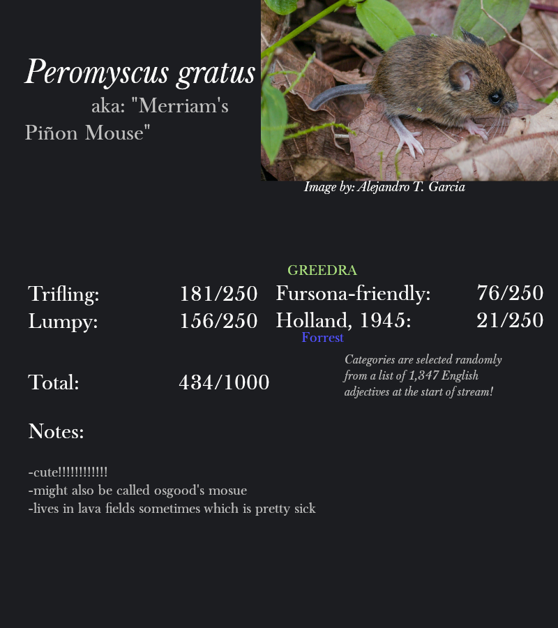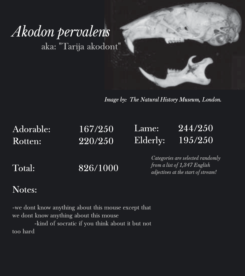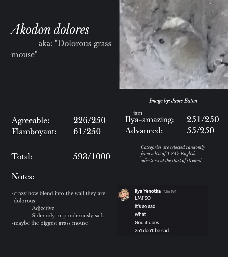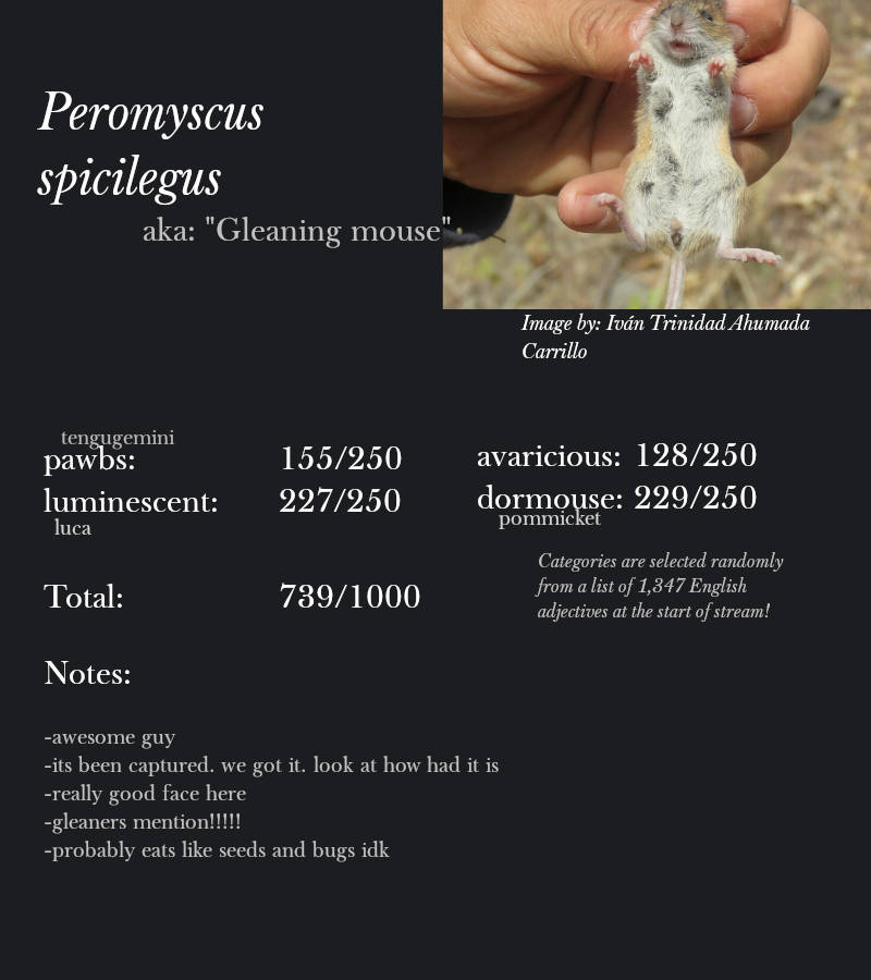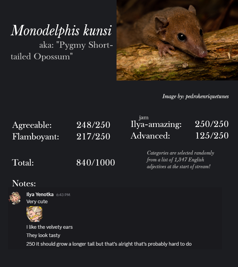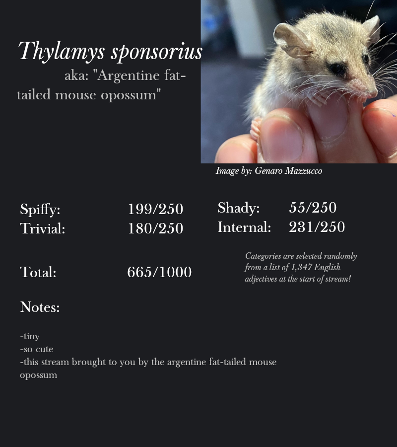 Sorex veraecrucis aka: "Veracruz shrew" os Impressionable: 71/250 Squiggly: 64/250 Peaceful: 188/250 Fake: 100/250 Categories from a list are of 1 selected ,347 Eng randomly lish Total: 423/1000 Categ from or a ies list ar of select 1,347 ed rando English adjectives at the start of stream! Notes: -its om baby y pa -its baby omy sais y pave asrey omy sais pave asrey -living its best life
