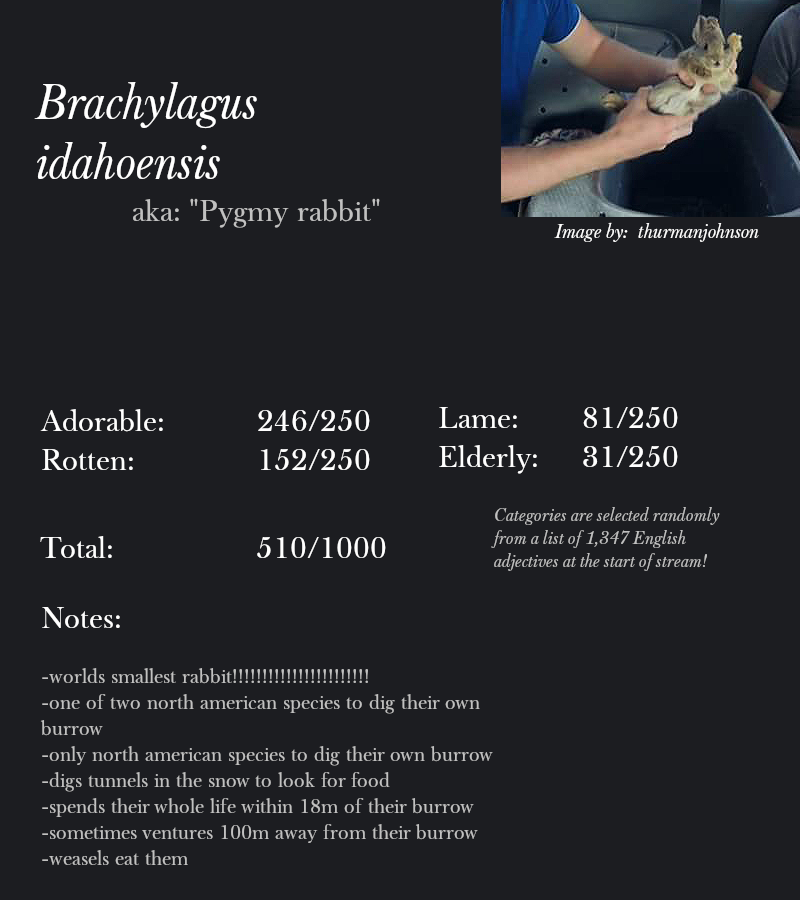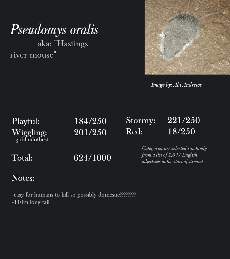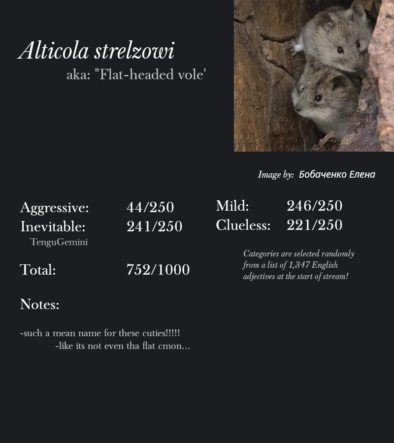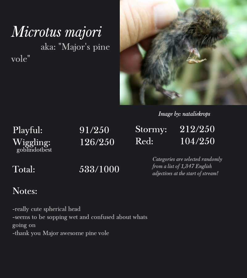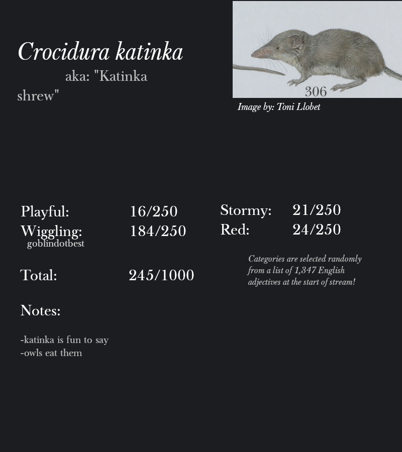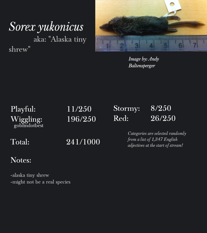 -alaska tiny shrew -might not be a real species Total: 241/1000 goblindotbest Playful: 11/250 Wiggling: 196/250