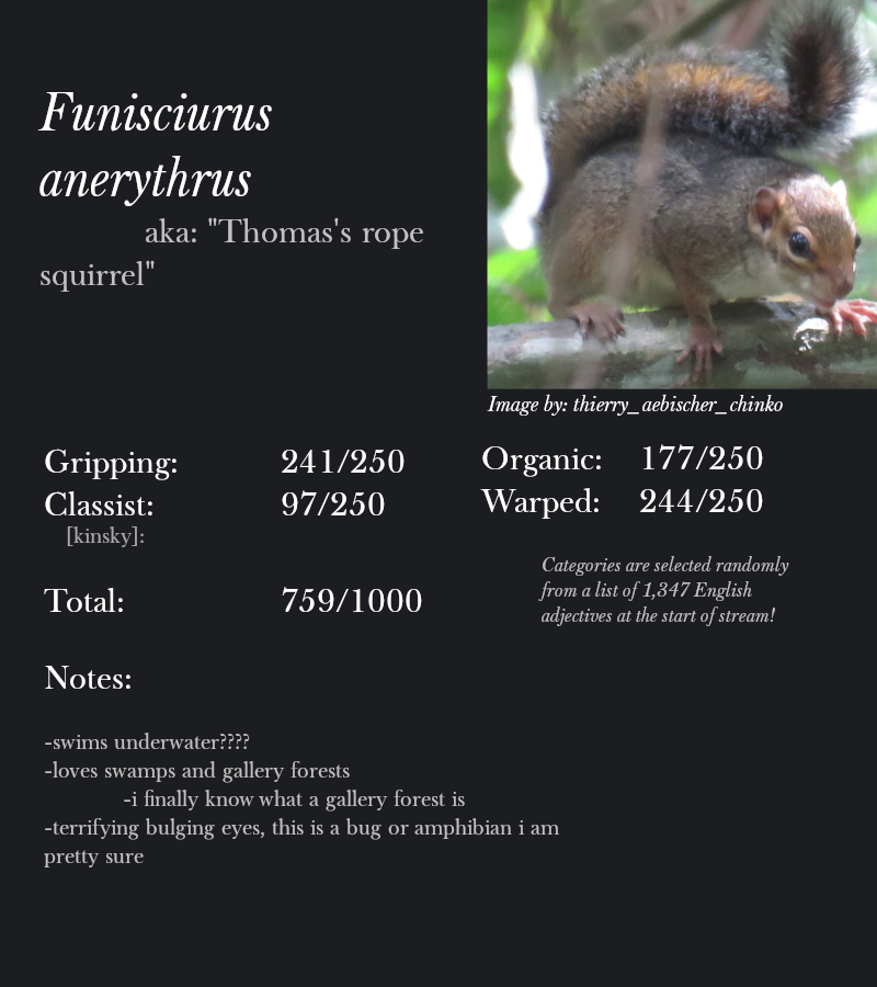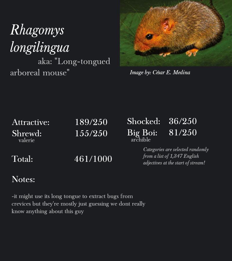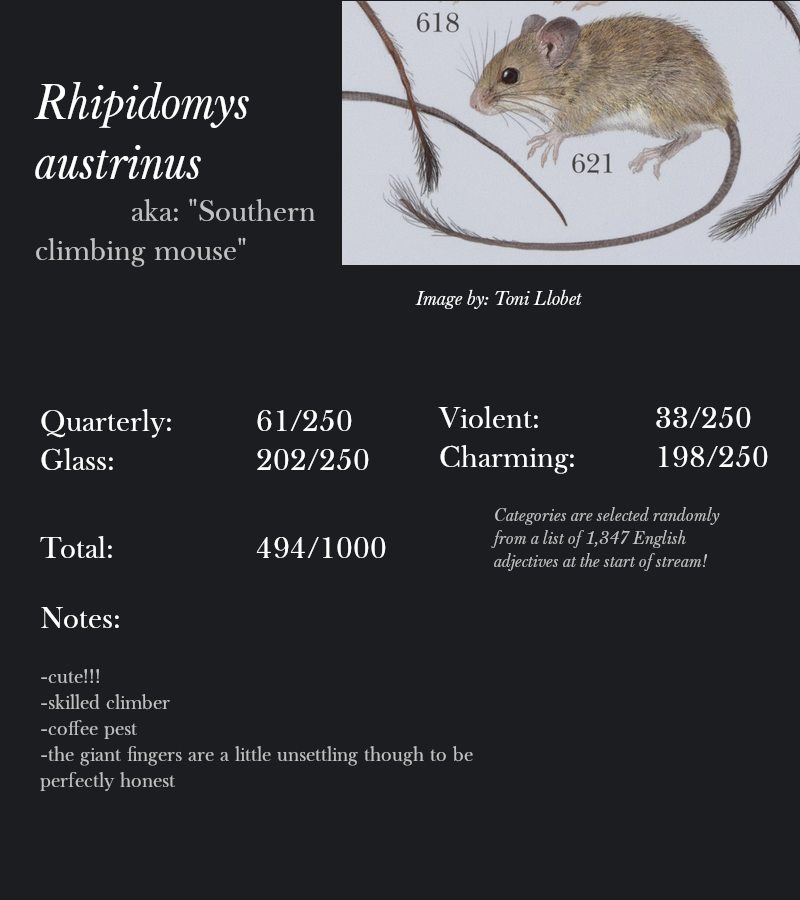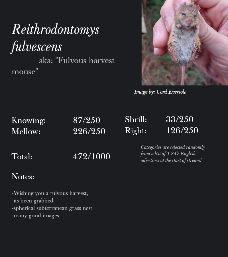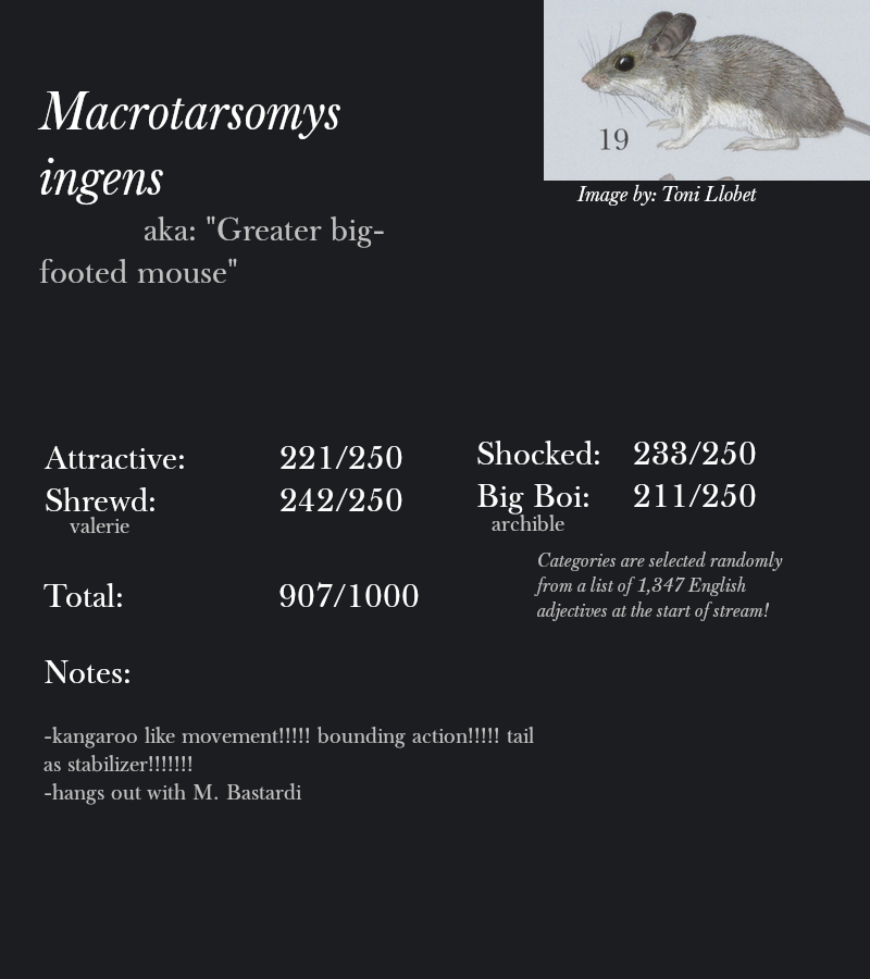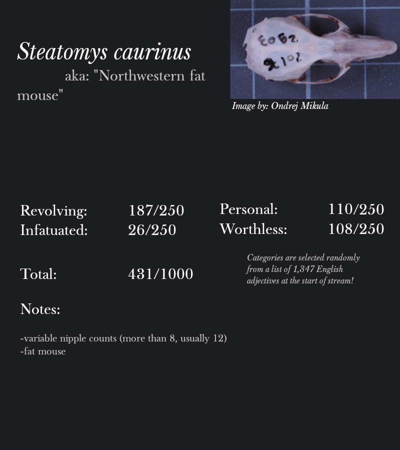 I stream mammal reviews every Monday and Saturday at 4pm Pacific on twitch!
