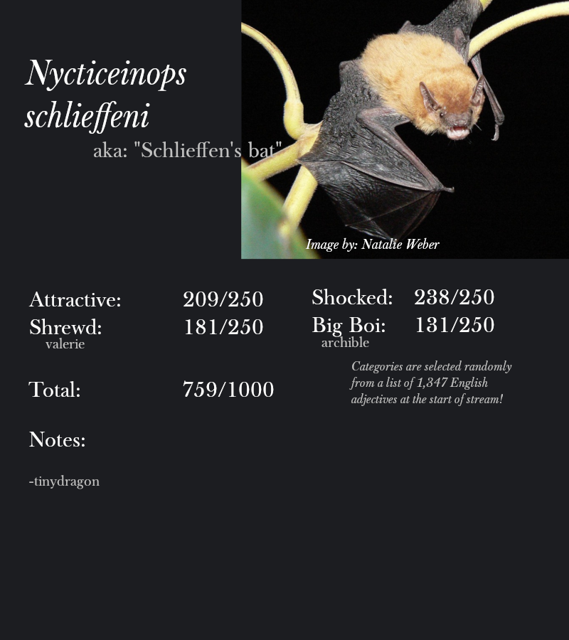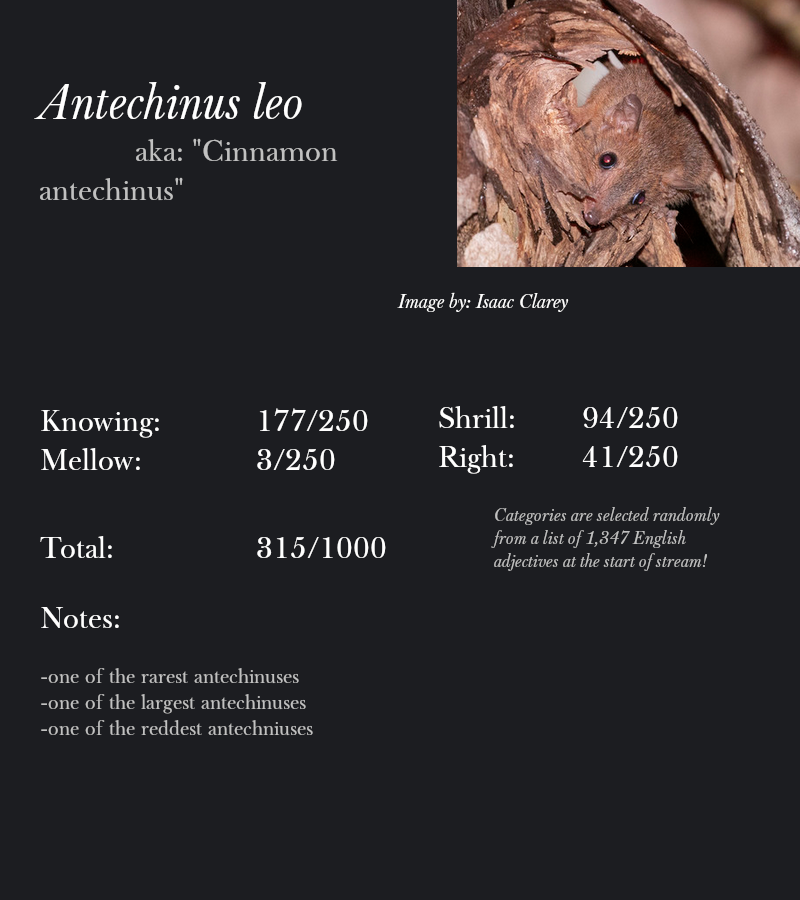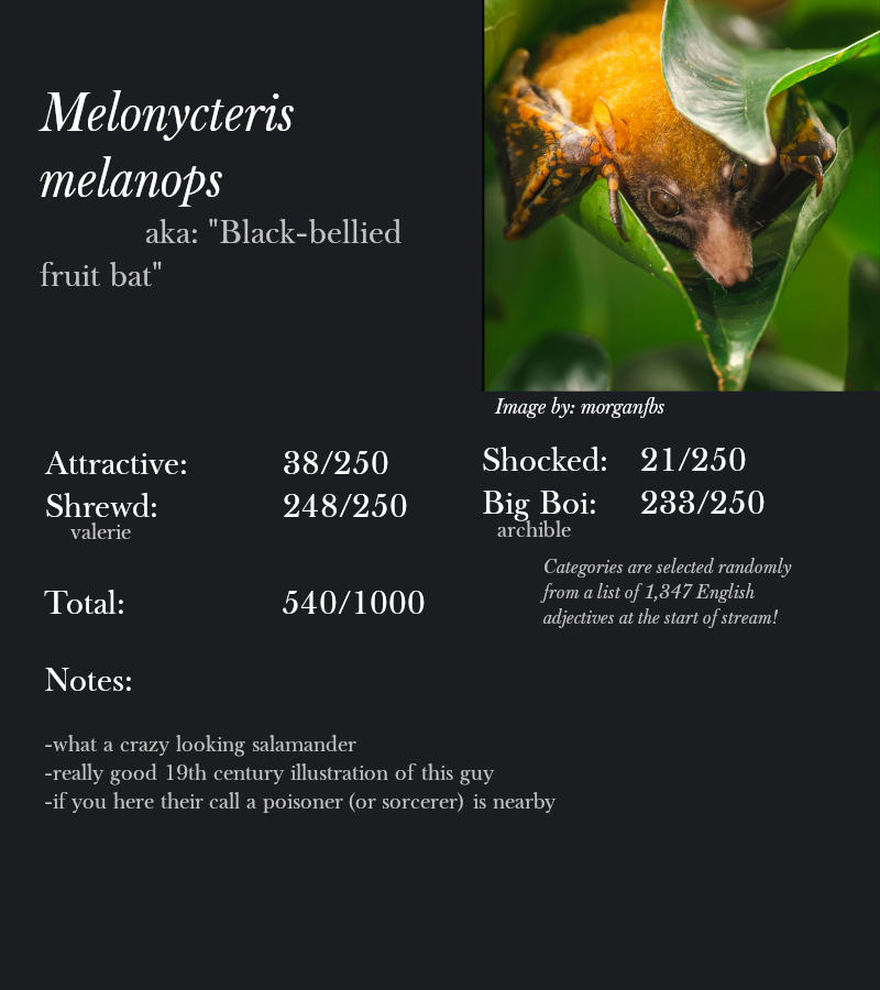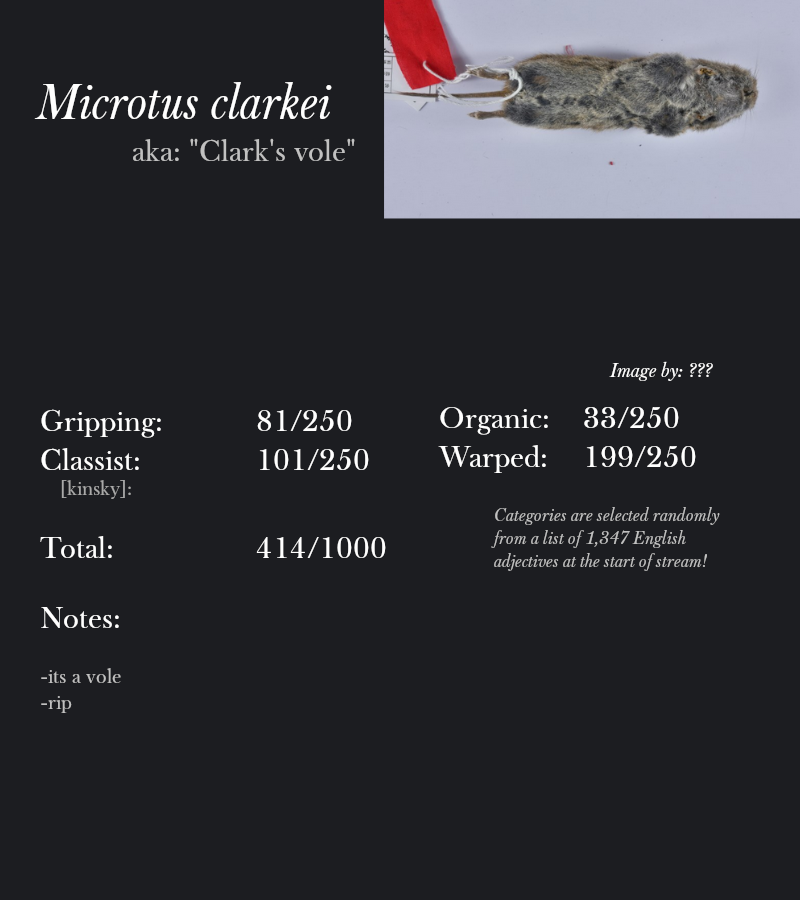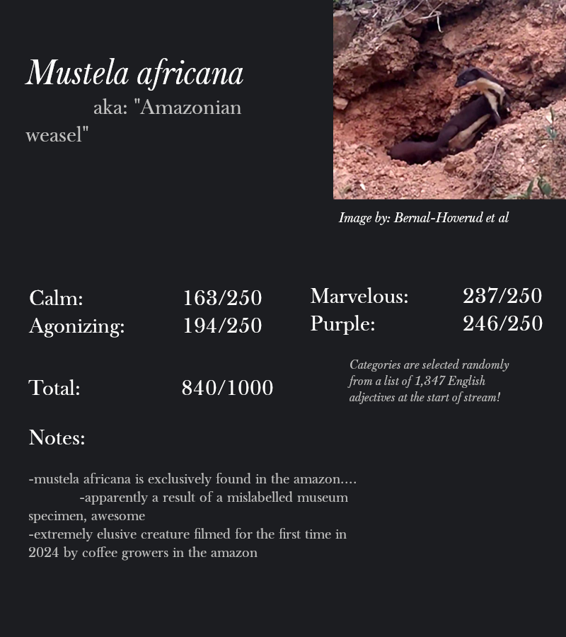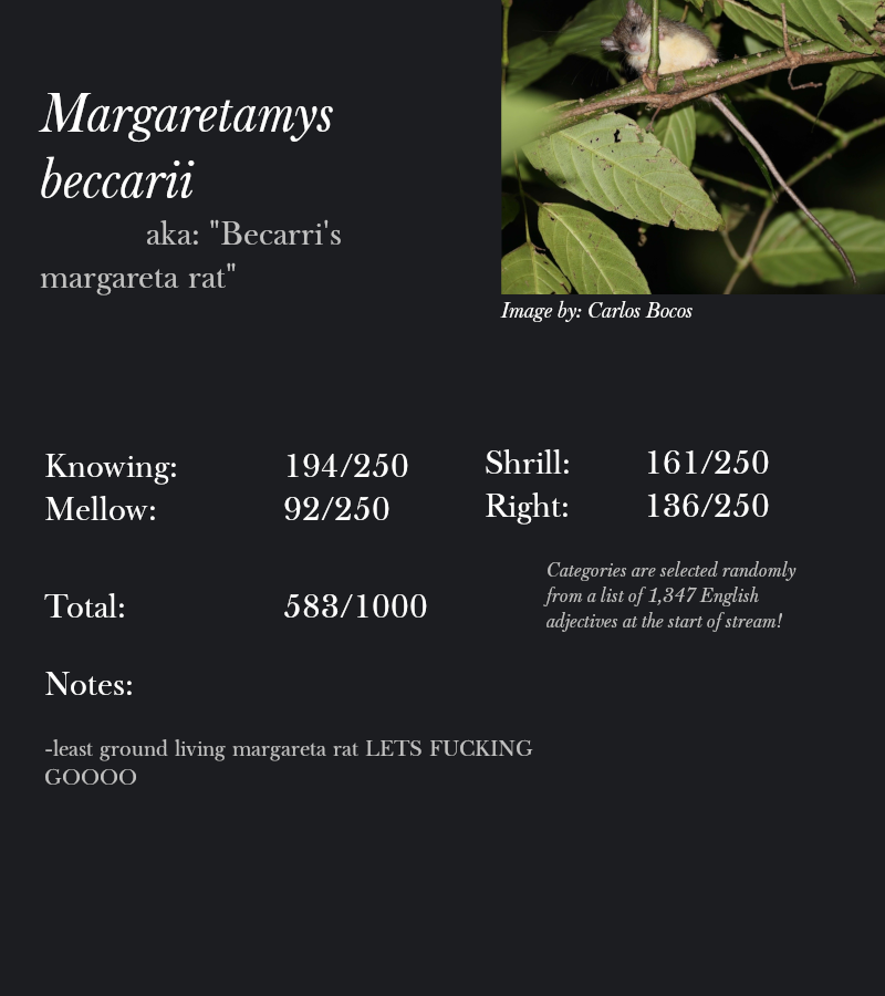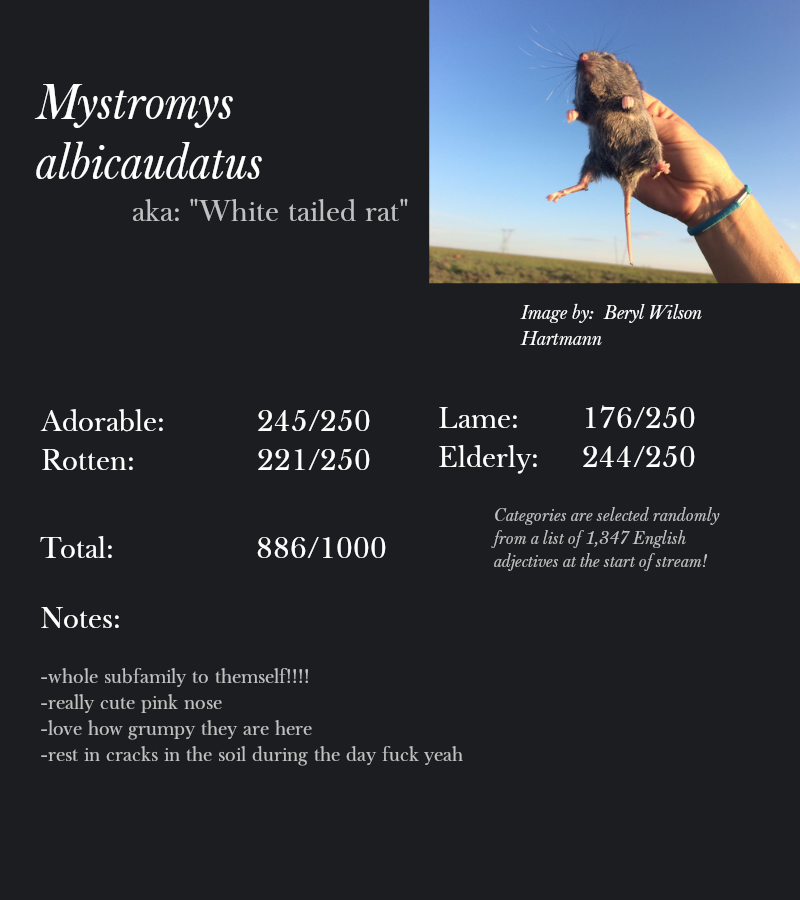 I stream mammal reviews every Monday and Saturday at 4pm Pacific on twitch!