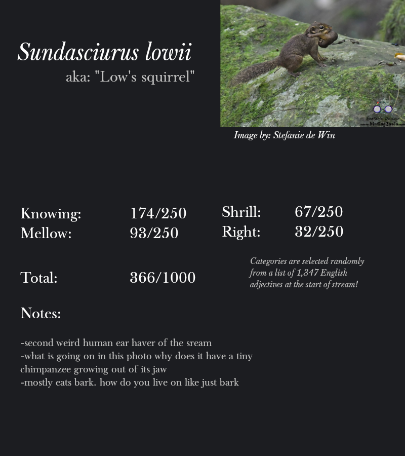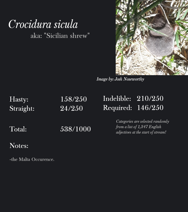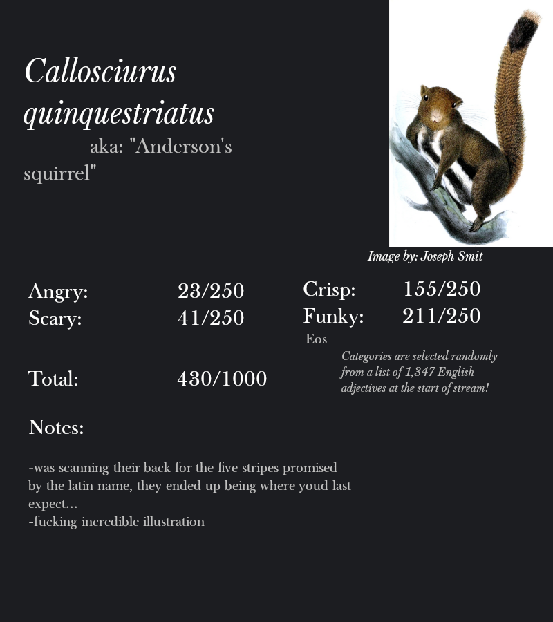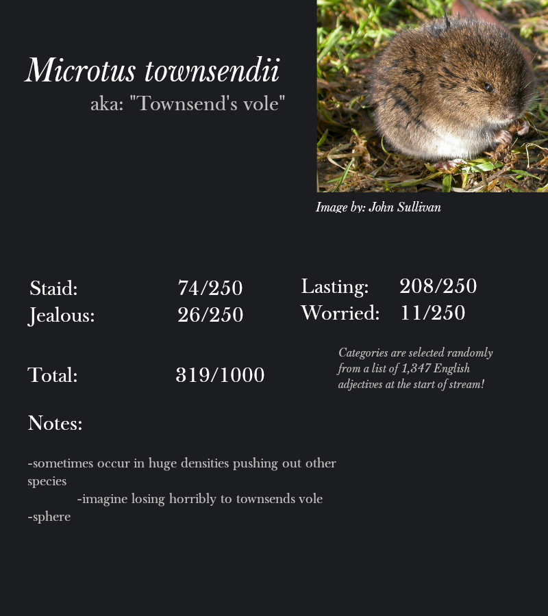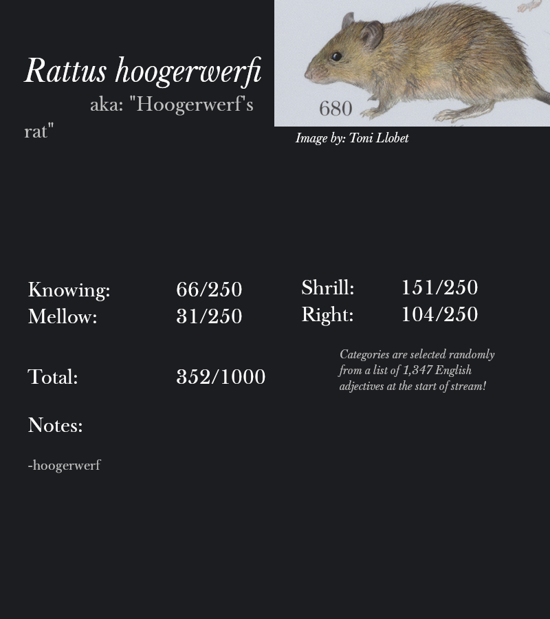 Categories are selected randomly from a list of 1,347 English adjectives at the start of stream! Shrill: 26/250 Right: 228/250 Image by: William Stephens Notes: