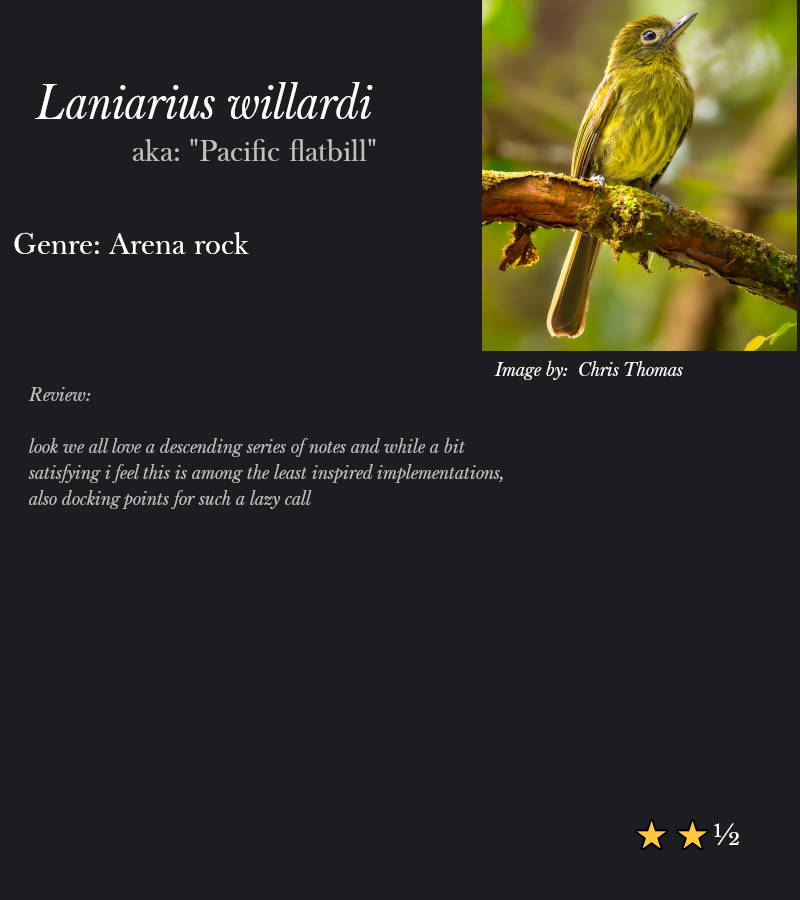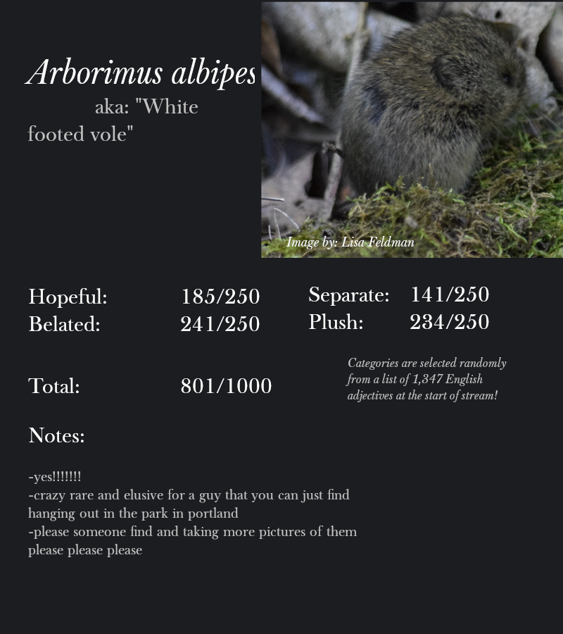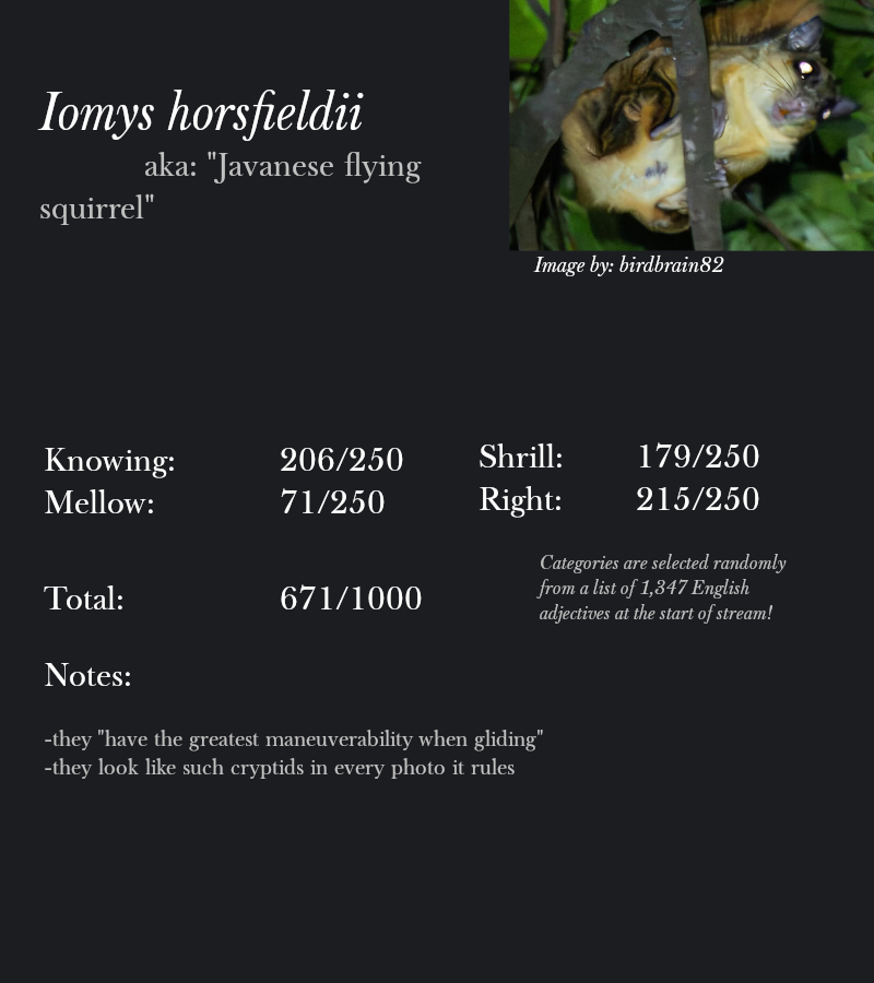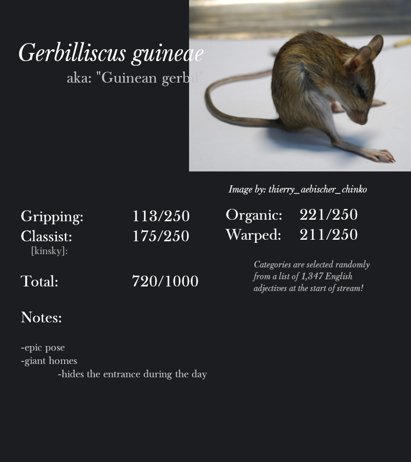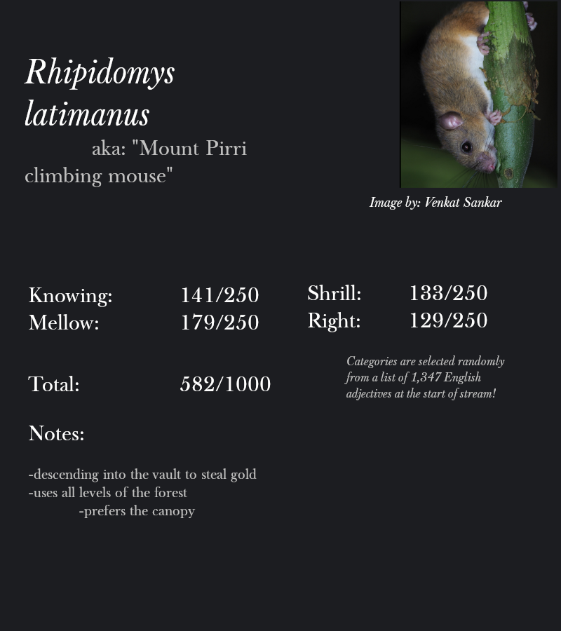 Categories are selected randomly from a list of 1,347 English adjectives at the start of stream! Shrill: 26/250 Right: 228/250 Image by: William Stephens Notes: