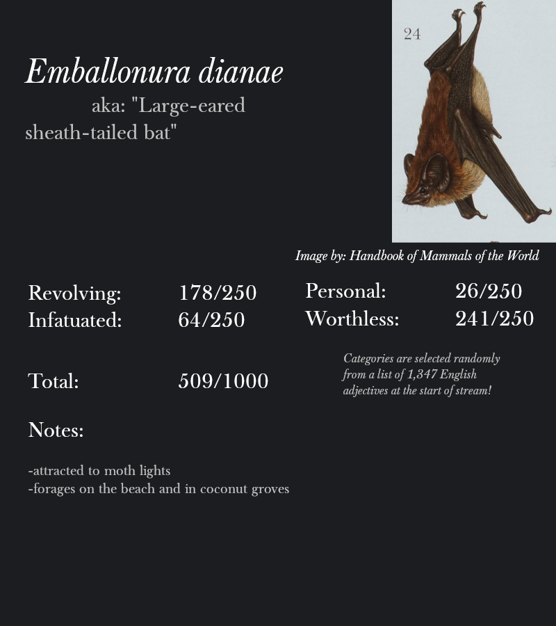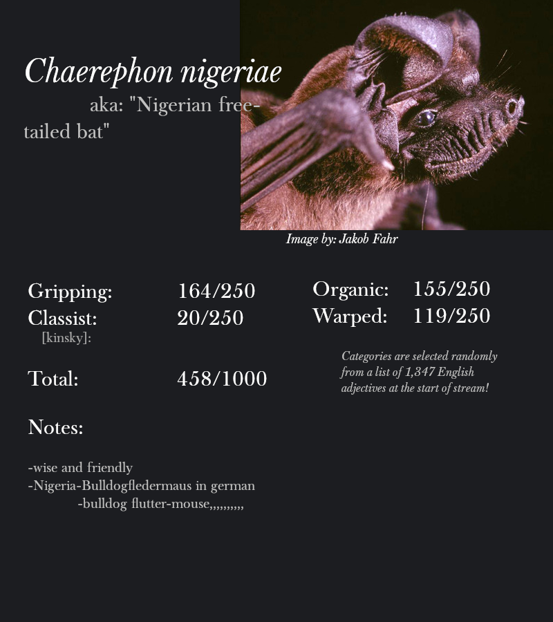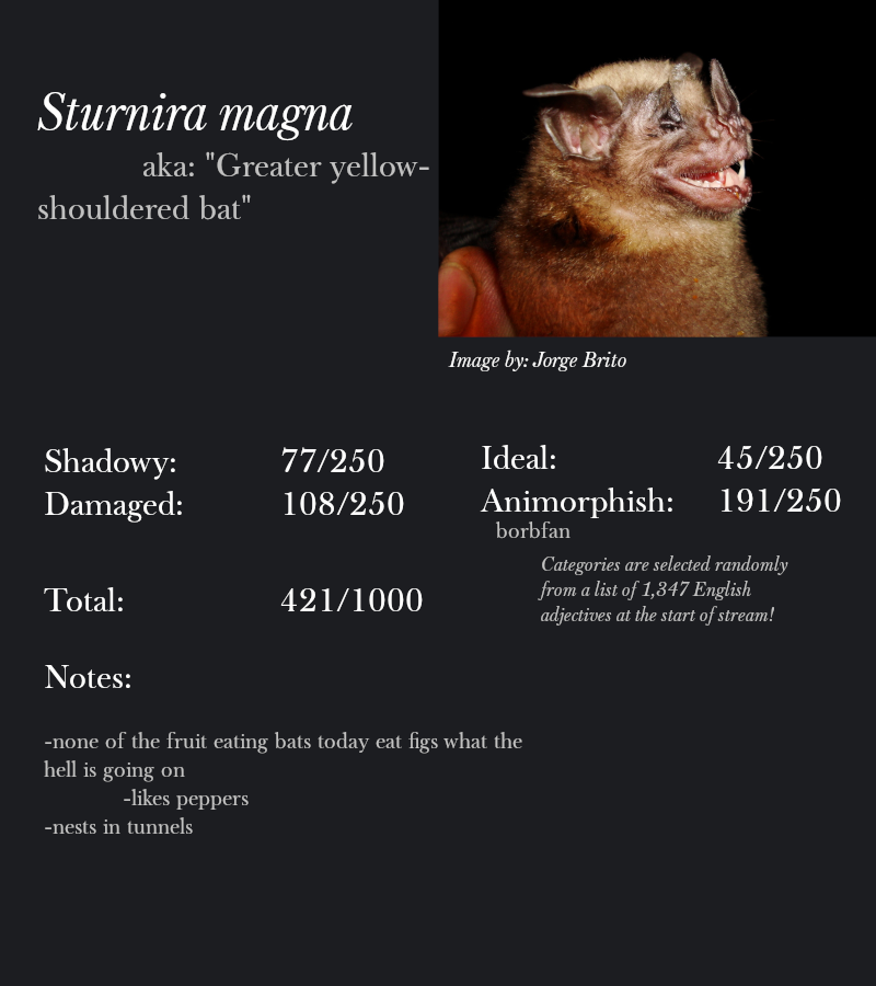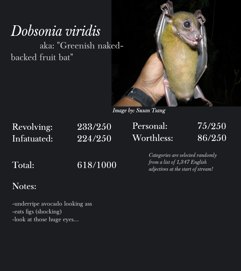 Categories are selected randomly from a list of 1,347 English adjectives at the start of stream! Shocked: 241/250 Big Boi: 191/250 Image by: Kawada et. al. ?