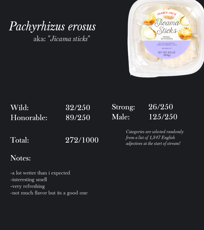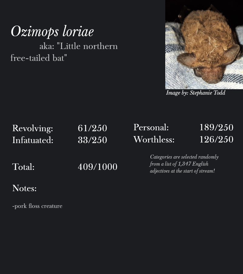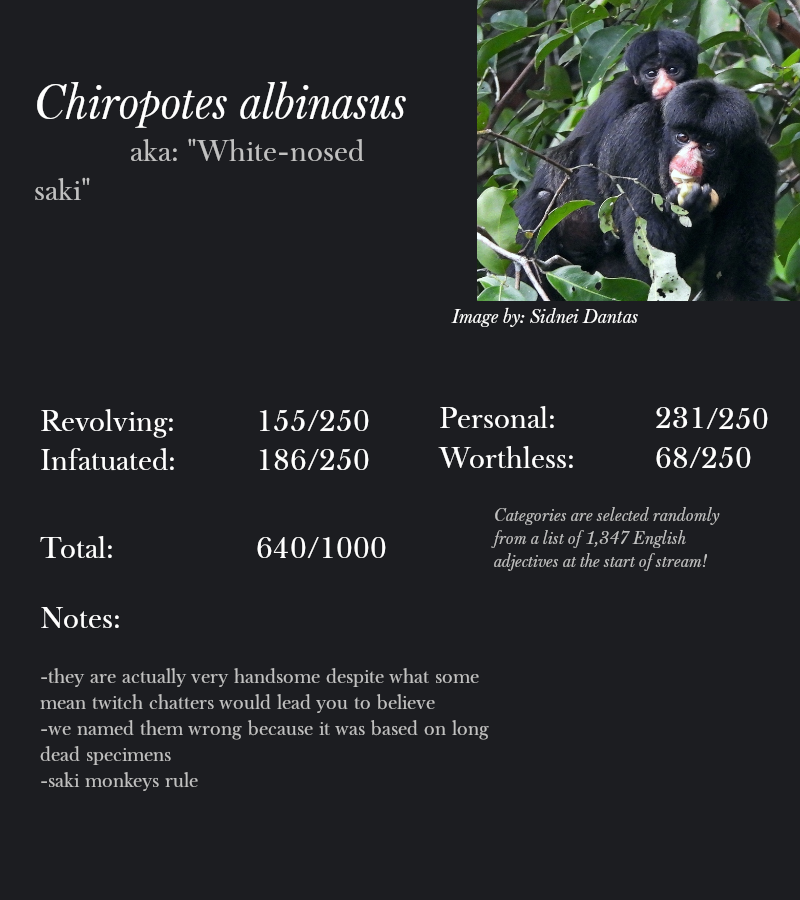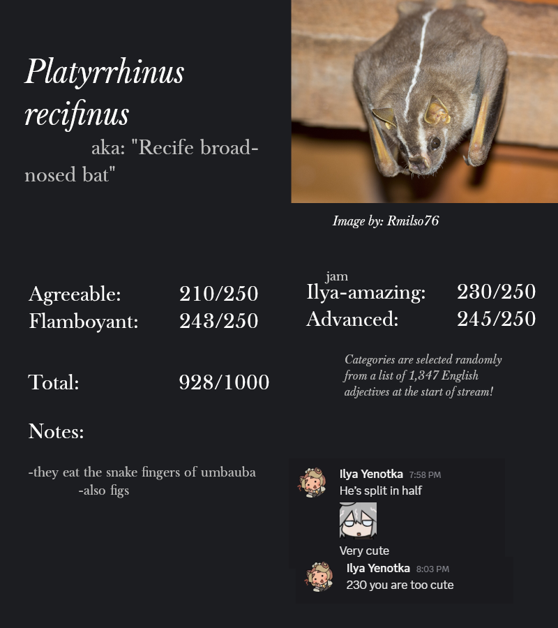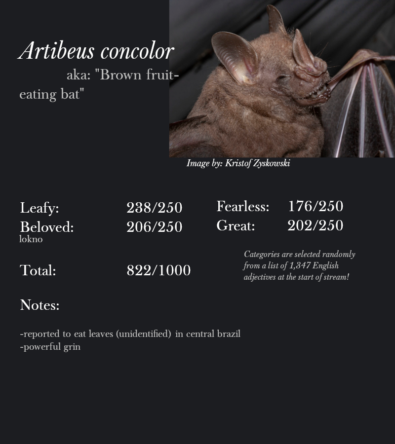 Categories are selected randomly from a list of 1,347 English adjectives at the start of stream! Shocked: 241/250 Big Boi: 191/250 Image by: Kawada et. al. ?