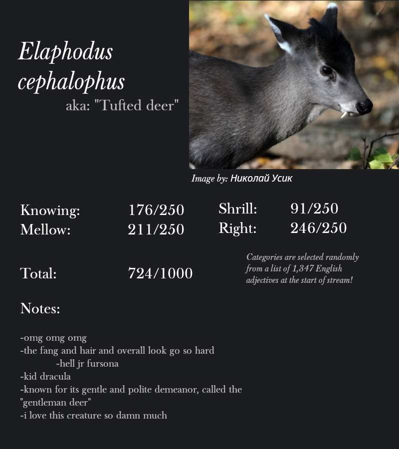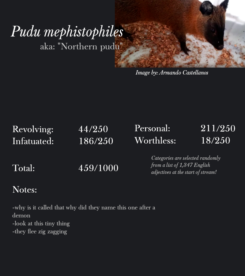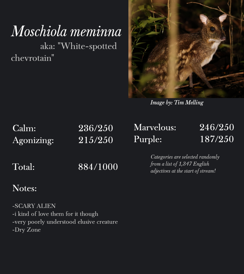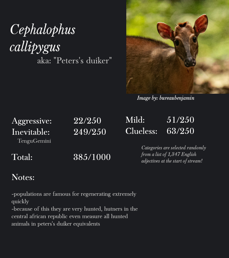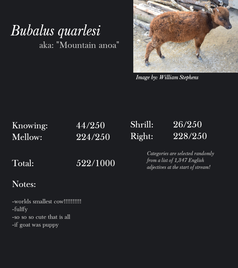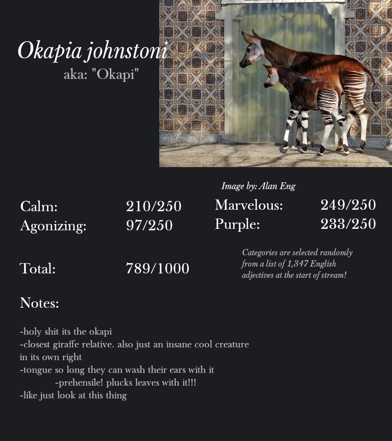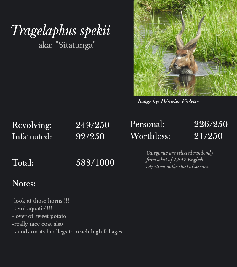Stimulating: 174/250 Uncomfortable: 221/250 Total: 648/1000 Notes: -Unnerving gaze -Why is its snout so wet -What the hell is the duiker Weighty: 82/250 Heavy: 171/250 Categories froma list are of 1 selected ,347 Eng randomly glish Categ froma ies list ar of select 1,347 ed rando English adjectives at the start of stream!