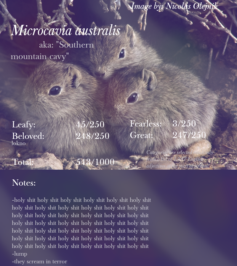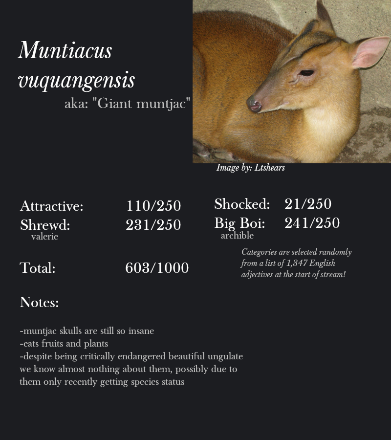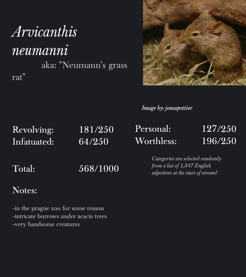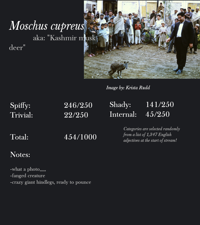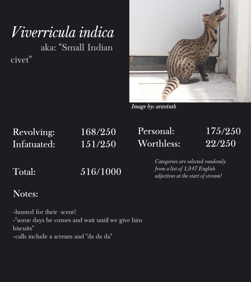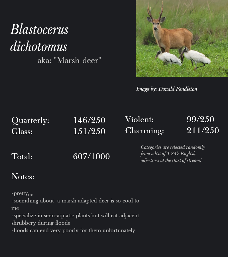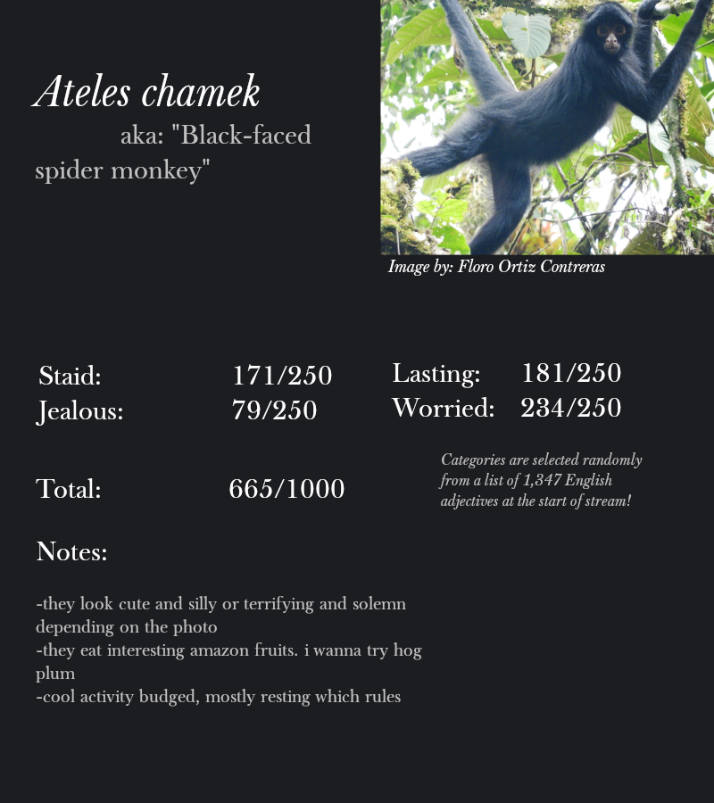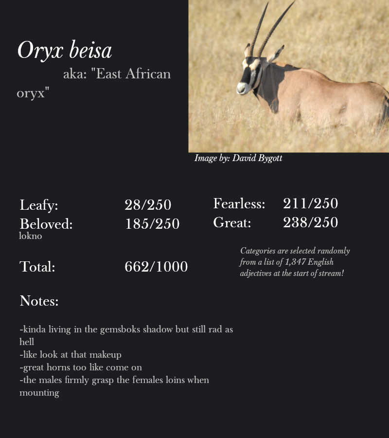 Stimulating: 174/250 Uncomfortable: 221/250 Total: 648/1000 Notes: -Unnerving gaze -Why is its snout so wet -What the hell is the duiker Weighty: 82/250 Heavy: 171/250 Categories froma list are of 1 selected ,347 Eng randomly glish Categ froma ies list ar of select 1,347 ed rando English adjectives at the start of stream!