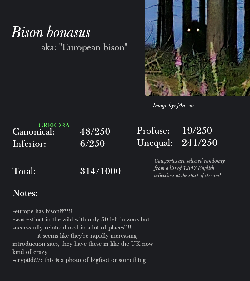 -europe has bison?????? -was extinct in the wild with only 50 left in zoos but successfully reintroduced in a lot of places!!!! -it seems like they're rapidly increasing introduction sites, they have these in like the UK now kind of crazy -cryptid???? this is a photo of bigfoot or something Total: 314/1000 GREEDRA Canonical: 48/250 Inferior: 6/250