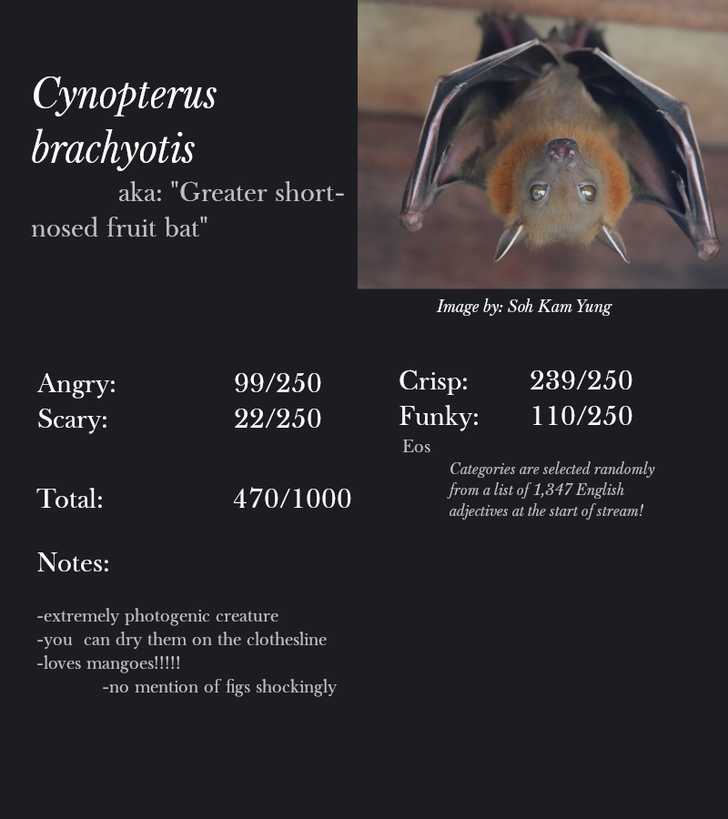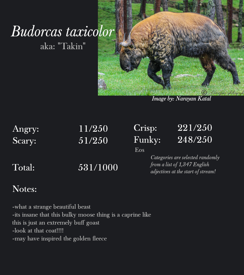 Categories are selected randomly from a list of 1,347 English adjectives at the start of stream! Eos Crisp: 221/250 Funky: 248/250 Image by: Narayan Katal Notes: