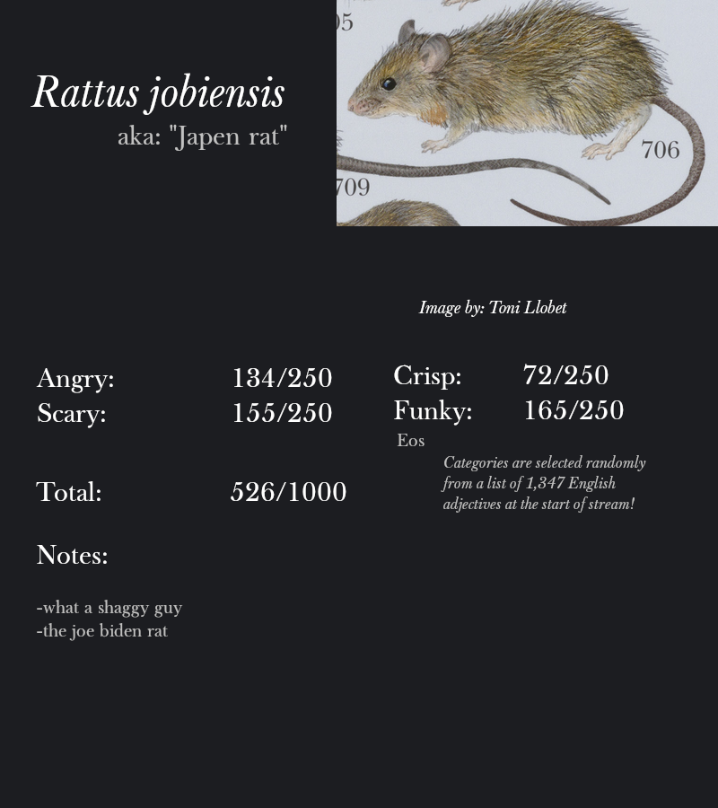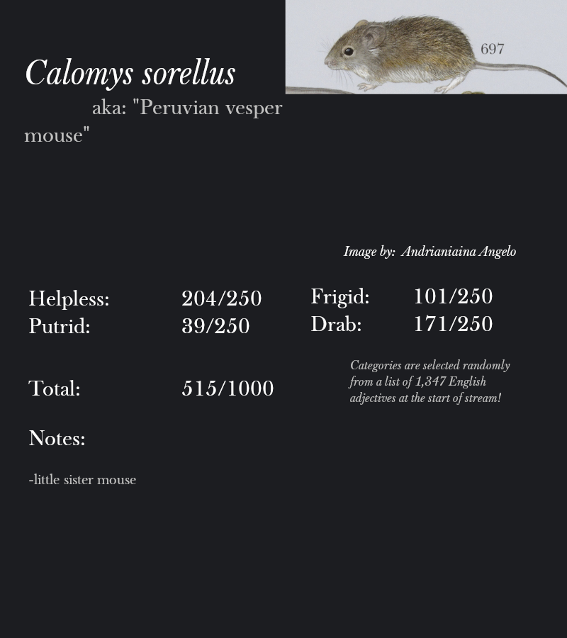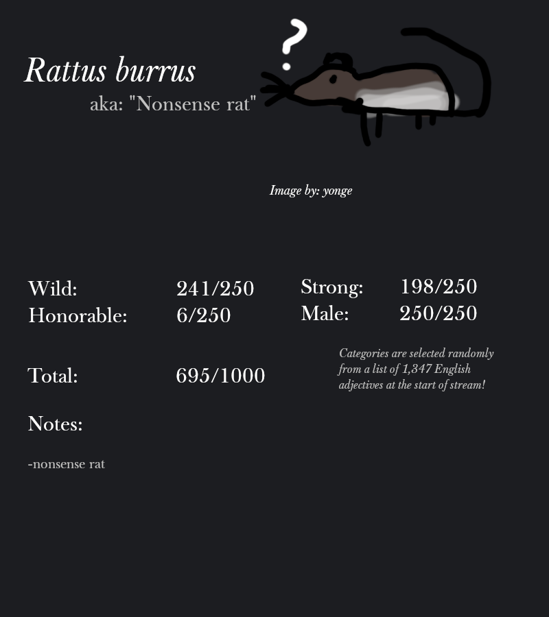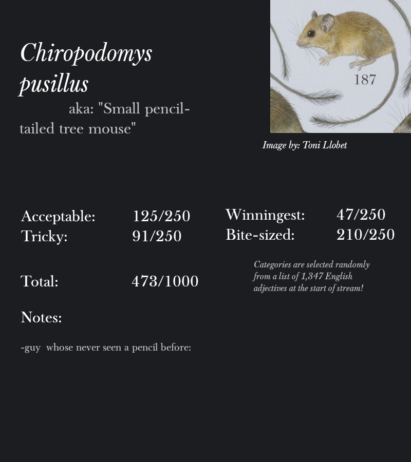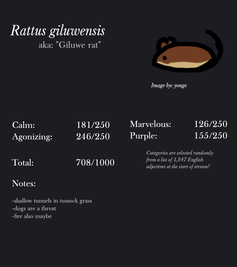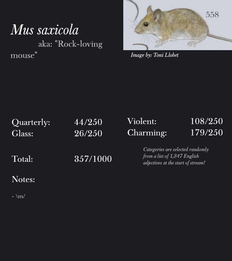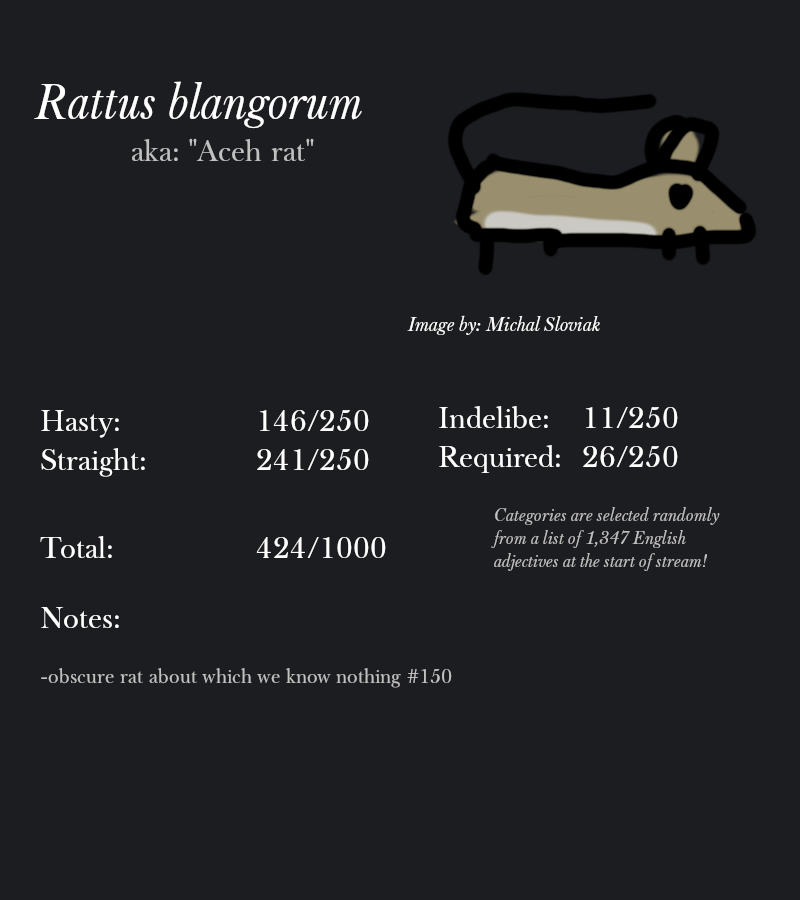Categories are selected randomly from a list of 1,347 English adjectives at the start of stream! Rude: 182/250 Icy: 26/250 Image by: Liam Huber Notes:
